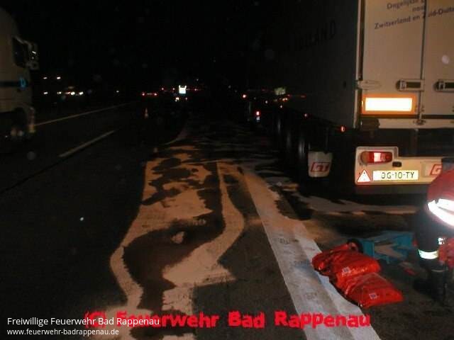Zum Beseitigen einer Dieselspur auf der BAB A6 in Fahrtrichtung Mannheim wurde die Feuerwehr Bad Rappenau am Donnerstagabend gegen 20:00 Uhr alarmiert.Beim Eintreffen an der Anschlussstelle konnte dort eine Dieselspur im Bereich zwischen dem rechten Fahrstreifen und der Standspur ausgemacht werden. Als Verursacher wurde schnell eine holländische Sattelzugmaschine ausgemacht, welche ca. 2 km nach der Anschlussstelle Bad Rappenau auf der Standspur abgestellt worden war. Der LKW-Fahrer hatte sich im Bereich der Anschlussstelle Bad Rappenau den Fahrzeugtank beim Überfahren eines Gegenstandes beschädigt. Der auslaufende Diesel aus der Zugmaschine wurde zunächst mit geeigneten Gefäßen aufgefangen. Nach dem provisorischen Abdichten des Tankes wurde der verbliebene Diesel schließlich aus dem Fahrzeugtank abgepumpt.Zeitgleich zu diesen Maßnahmen wurde in Absprache mit der Autobahnpolizei mit dem Material aus dem Gerätewagen-Verkehrssicherung der rechte Fahrstreifen auf der gesamten Länge für den Verkehr gesperrt. Nach dem vollständigen Entleeren des Fahrzeugtanks konnte der LKW von einem Abschleppunternehmen in eine Werkstatt geschleppt werden.Zum Beseitigen der Ölspur wurde von der Autobahnpolizei eine Spezialfirma beauftragt, welche auch die Beseitigung des durch die Feuerwehr ausgebrachten Ölbinders übernahm.Nach dem Reinigen der betroffenen Fahrbahn, konnte der rechte Fahrstreifen für den Verkehr wieder freigegeben werden.Eingesetzte Kräfte: KdoW, RW1, LF16, GW-Gefahrgut, GW-Verkehrssicherung, MTW (22 Mann)Ralf SchneiderFeuerwehr Bad Rappenau
