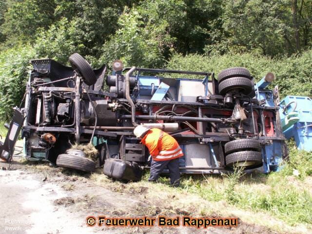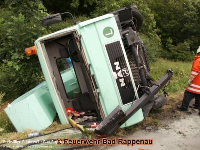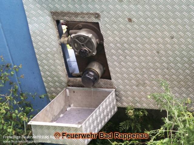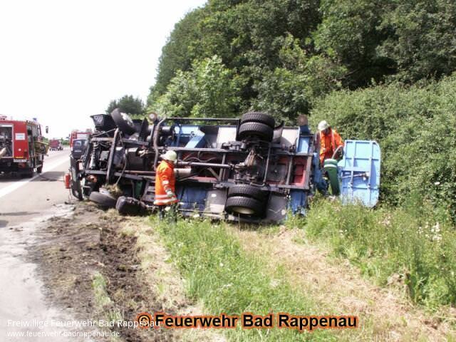 Um 12:54 Uhr wurde die Abteilungswehr Bad Rappenau zu einem LKW-Brand auf die BAB A6 gerufen. Wie sich an der Einsatzstelle herausstellte, handelte es sich jedoch um einen LKW-Unfall.Zwischen den Anschlussstellen Bad Rappenu und Sinsheim-Steinsfurt war ein sog. Hubsteiger nach rechts von der Fahrbahn abgekommen, hatte mehrere Meter Leitplanke niedergewalzt und war anschließend im angrenzenden Grünstreifen umgestürzt. Glücklicherweise war der LKW-Fahrer unverletzt geblieben und hatte sich selbst aus dem auf der Beifahrerseite liegenden LKW befreien können.Somit mussten von der Feuerwehr Bad Rappenau "lediglich" auslaufende Betriebsstoffe aufgefangen werden. Unverzüglich wurde der GW-G zur Einsatzstelle nachgefordert. Bis zum Eintreffen des Gerätewagens Gefahrgut wurde der Fahrzeugtank des verunfallten LKW demontiert und auslaufendes Hydrauliköl aufgefangen. Trotz des raschen Eingreifens konnte nicht verhindert werden, dass ca. 50 l Öl ins Erdreich gelangten.Feuerwehr Bad Rappenau