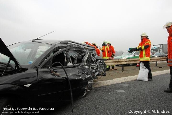 "LKW unter Leitplanke"Mit diesem Alarmstichwort wurde die Feuerwehr Bad Rappenau heute morgen alarmiert. Der Fahrer eines Sattelzuges, der auf der BAB 6 in Richtung Sinsheim unterwegs war, verlor in Höhe Grombach die Kontrolle über sein Fahrzeug, durchbrach die Mittelleitplanke streifte zwei entgegenkommemde Autos bevor er schließlich in einer Böschung neben der Fahrbahn zum Stehen kam.In Zusammenabeit mit der Feuerwehr Sinsheim wurde die Unfallstelle abgesichert, eine eingeschlossene Person befreit und dem Rettungsdienst übergeben, der Brandschutz sichergestellt, die Batterien der Unfallfahrzeuge abgeklemmt und die auslaufenden Betriebsstoffe gebunden.Wie durch ein Wunder wurde bei dem Unfall niemand schwer Verletzt.Die Autobahn wurde in Fahrtrichtung Heilbronn kurzzeitig voll gesperrt, in Richtung Mannheim konnte der Verkehr einspurig an der Unfallstelle vorbeigeleitet werden.