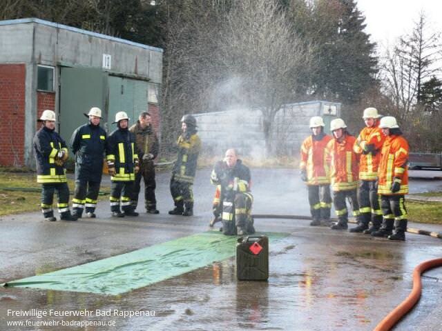 Samstag früh, kurz vor 6.00 Uhr. Hektisches treiben im Feuerwehrhaus von Bad Rappenau. Aber nein, dieses mal kein Einsatz.Die Reise ging dieses mal auf die Schwäbische Alb in die Nähe von Münsingen auf einen alten Truppenübungsplatz. Dort hat sich die Firma ErHaTec seit Herbst 2005 einquartiert und bildet Feuerwehrleute in Sachen Brandbekämpfung aus.3500 Teilnehmer aus ganz Europa wurden hier schon ausgebildet, vom „kleinen Feuerwehrmann“ bis hin zum Kreisbrandmeister.Teilnehmer bei deisem Lehrgang waren fünf Kameraden aus Bad Rappenau, sowie drei Kameraden einer Werksfeuerwehr.Nach der Sicherheitseinweisung im „kalten“ Container ging es dann los.Durchgang 1 – Den Brandverlauf beobachten sowie Wärmegewöhnung.Im „offenen System“ trennt keine Tür den Brandraum vom Beobachtungsraum, der Brandverlauf kann vom kleinen Entstehungsbrand bis hin zum Flash-Over beobachtet werden. Schon jetzt wurde vom Trainerteam der richtige Einsatz des Strahlrohres vermittelt. Wann wird ein 45°Sprühwinkel, wann ein 30° Sprühwinkel und wann und wie wird Vollstrahl eingesetzt. Dieser Durchgang dauerte in etwa 30 min. Die anschließende Kaffeepause hatten wir uns redlich verdient.Durchgang 2 – RauchdurchzündungenIn der der RDA (Rauch Durchzündungs Anlage) konnten wir erneut den Brandverlauf beobachten, der aber nun viel rasanter ablief, da der Brandraum als solches viel kleiner war und sich entsprechend die Wärme staute. Alle konnten nun sehen und fühlen, das in der Rauchschicht zunächst viel Wasserdampf vorhanden war, was sich dann aber schlagartig änderte. Als nun vom Container beide Flügeltüren geschlossen wurden senkte sich auch die Rauchschicht bis auf 50cm zum Boden ab. Sowie aber die Rauchschicht fiel, stieg aber die Temperatur. Die drei Druckzonen – Unterdruckzone am Boden, Neutrale Zone an der Rauchschichtgrenze sowie die Überdruckzone als austretender Rauch – waren einwandfrei zu erkennen. Mit dem Öffnen der Rauchkappe und der Flügeltüren war dann aber bald wieder klare Sicht.Inzwischen stand der Brandraum im Vollbrand und das Feuer wechselte vom Brennstoff-kontrollierten Zustand in den Sauerstoff-kontrollierten Zustand.Gut zu sehen war, daß beim kurzzeitigen Schließen der Brandraumtür, das Feuer beinahe „in sich zusammen fiel“.Jetzt war es dann Zeit für Rauchdurchzündungen, die äußerst imposant waren und erahnen liesen, was bei einem „richtigen Feuer“ auf die eingesetzten Atemschutzgeräteträger zukommen kann.In der Mittagspause konnten sich Teilnehmer und Trainer für die bevorstehenden Trainigseinheiten stärken.StrahlrohrtrainingNochmals genau erklärt wurde die Handhabung eines Hohlstrahlrohres beim Strahlrohrtraining und welchen Sinn die verschiedenen Sprühwinkel machen.Danach gings zum weiter zumDurchgang 3 – Rauchdurchzündungen blockenWenn es zu einer Durchzündung kommt, ist es sicherlich nicht sinnvoll dabei zu zusehen, sondern wir müssen „arbeiten“. Genau dieses wurde im dritten Durchgang vermittelt.Außerdem durfte man spüren, was es bedeutet zuviel Wasser zu benutzen, denn Wasserdampf „schlägt“ fast ungehindert durch die Schutzkleidung durch.Durchgang 4 – AngriffsübungVom Verbindungscontainer aus wurde eine Angriffsübung ins Offene System gefahren. Hier mussten die einzelnen Trupps zweimal die Türprozedur anwenden und konnten dann Ihre erlernten Fähigkeiten am Strahlrohr anwenden.Alle Teilnehmer waren sich anschließend einig, daß so ein Ausbildungstag eigentlich „Atemschutz Grundausbildung“ ist.Gegen 17.00 Uhr waren wir dann wieder Zuhause und abends auf der Weihnachtsfeier gab es viel zu erzählen…Weitere Informationen gibt es bei www.erhatec.de oder bei Thomas Wachno – Feuerwehr Bad RappenauBild 1: Durchgang 1 – Brandverlauf beobachtenBild 2: StrahlrohtrainingBild 3: Gruppenfoto: [hinten: Sebastian Heisig (links), Michael Allaut (3. von links), Klaus Schneider (ganz rechts); vorne (von links nach rechts): Michael Gabel, Christian Böhrer (Trainer), Conrad Wagenbach, Jürgen Ernst (Trainer), Thomas Wachno (Trainer)]