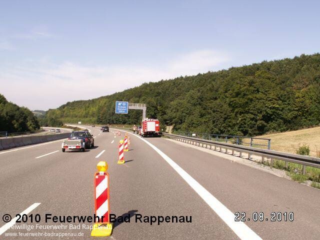 Am 22.08. wurde mit dem Stichwort „PKW-Brand“ für die Abt.-Wehr Bad Rappenau um 10:28 Uhr Alarm ausgelöst. Es wurde ein brennender PKW auf der A6 bei Kilometer 613,5 – Fahrtrichtung Mannheim kurz vor der Abfahrt Steinsfurt gemeldet. Beim Eintreffen des Einsatzleiters stellte sich heraus, dass es sich nur um Kühlwasserdampf handelt, dieser ist durch den geplatzten Kühlwasserschlauch entstanden. Die Tätigkeit der Feuerwehr beschränkte sich auf die Absicherung der Einsatzstelle und das Sperren einer Fahrspur. Die Batterie wurde abgeklemmt und auf Weisung der Autobahnpolizei wurde das ausgelaufene Kühlwasser mittels Ölbinder aufgenommen. Aufgrund des Alarmstichwortes verbunden mit der Kilometerangabe wurde die „große Tagschleife“ alarmiert. Es waren insgesamt 21 Kameraden mit 4 Fahrzeugen im Einsatz. Ausgerückt waren folgende Fahrzeuge: TLF 16/25, LF16, GW-VS und KdoW. Innerhalb weniger Tage war dies der zweite Alarm zu einem PKW-Brand auf der BAB, bei dem es sich glücklicherweise nur um „heißen Dampf“ gehandelt hat.