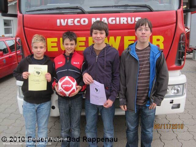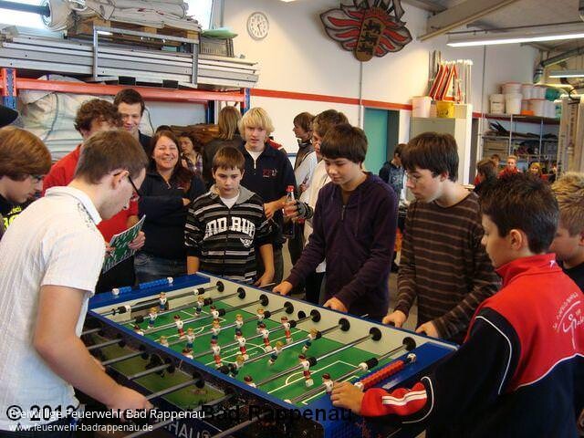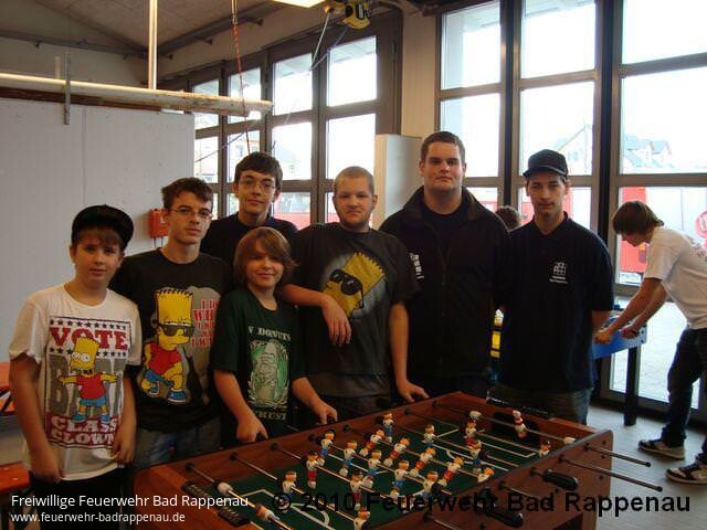 Die Feuerwehr Bad Rappenau beteiligte sich am 06.11.2010 mit verschiedenen Mitgliedern der Jugendfeuerwehr Abt. Bad Rappenau und der Jugendfeuerwehr Abt. Bonfeld beim 1. Tischkicker-Turnier der Jugendfeuerwehr der Freiwilligen Feuerwehr Nordheim. Von beiden Abteilungen gingen jeweils 2 Mannschaften, jeweils aus 2 Spielern bestehend, an den Start.Die teilnehmenden Mannschaften waren in verschiedene Gruppen mit 3-4 Mannschaften eingeteilt. Die Vorrunde bestand aus einem Hin- und Rückspiel. Die beiden erstplatzierten Mannschaften qualifizierten sich für das Achtelfinale, was beiden Mannschaften der Abt. Bad Rappenau und einer Mannschaft der Abt. Bonfeld gelang. Nun ging es im K.O.-System weiter. Die Mannschaften spielten jeweils 3 Partien aus. Gewonnen hatte derjenige, welcher zuerst 6 Tore geschossen hatte bzw. wer nach 6 Minuten die meisten Tore erzielt hatte und 2 Partien für sich entscheiden konnte. Die Jugendfeuerwehr der Abt. Bonfeld konnte sich hier weiter gegen ihren Gegner durchsetzten. Ebenfalls qualifizierte sich die Jugendfeuerwehr der Abt. Bad Rappenau mit einer Mannschaft für das Viertelfinale. Für die Bonfelder Jugendfeuerwehr führte der Weg weiter über das Viertel- und Halbfinale ins Finale. Das Finale konnte eine Jugendmannschaft der Feuerwehr Lauffen mit zwei 6:0-Siegen gegen die Jugendfeuerwehr Bonfeld klar für sich entschieden. Für die Jugendfeuerwehr Bonfeld haben die Spieler Ferdinand Jeremias und Simon Klumbach den 2. Platz erreicht. Sie erhielten einen Ball und eine Urkunde. Die Spieler Rene Hertlein und Robin Schanz beendeten das Turnier mit einer Urkunde für den 26. Platz. Die Mannschaften der Jugendfeuerwehr Abt. Bad Rappenau konnten mit den Spielern David Müller und Ian Lenz das Turnier mit Platz 6 und den Spielern Tim Ries und Morris Schmidt mit Platz 13 und jeweils einer Urkunde beenden. Für beide Mannschaften stand mit Christoph Wollny ein Mitglied der Jugendfeuerwehr Abt. Grombach als Ersatzspieler bereit.Nach gut 5 Stunden Spiel und Spaß freuten sich die Betreuer Frank Rieth, Martin Gramlich und Sebastian Heisig über einen gelungenen und kurzweiligen Ausflug für die Jugendfeuerwehr. Nachdem der mitgebrachte Tischkicker im Mannschaftstransportwagen (MTW) verladen war konnten die Mannschaften mit ihren Betreuern und dem 2. stellv. Kmdt. Axel Klumbach die Heimfahrt antreten.