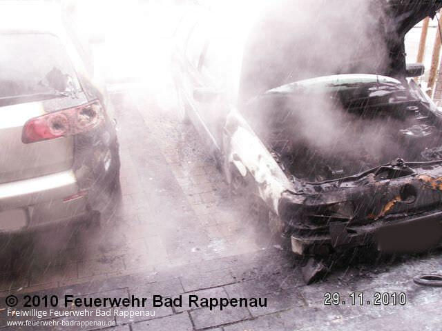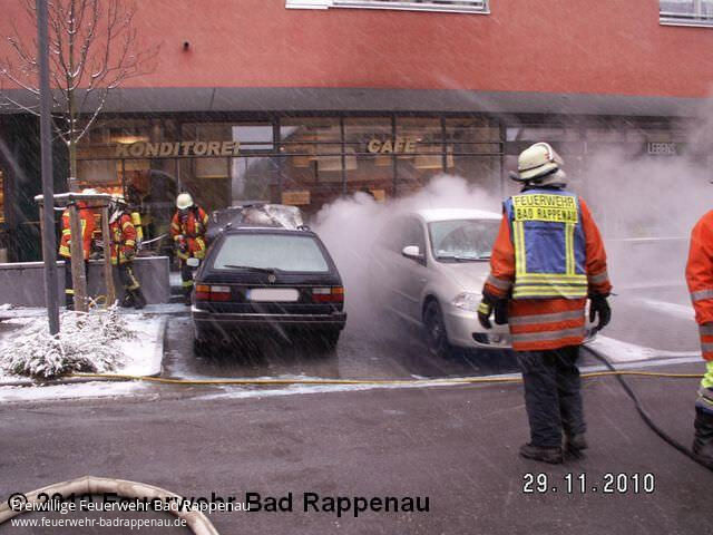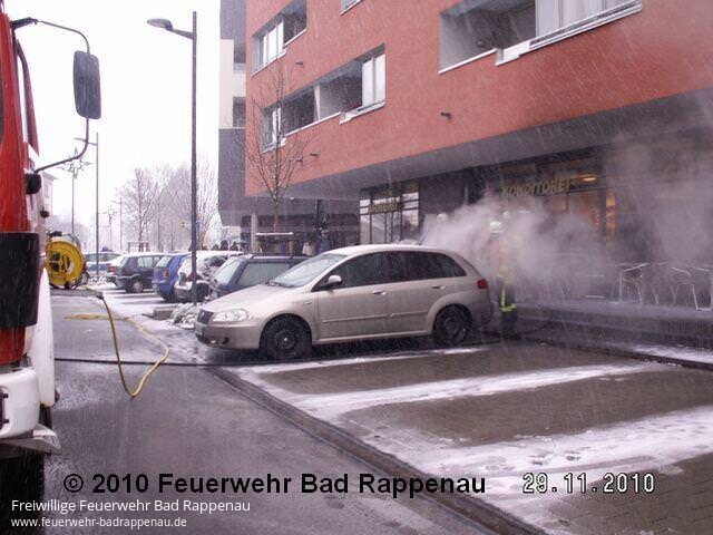 Am 29.11.2010 wurde die Abt. Bad Rappenau über DME um 11:03 Uhr zu einem PKW-Brand alarmiert. Ein geparkter PKW hatte aus derzeit noch ungeklärten Gründen gebrannt. Durch den Einsatzleiter wurden die Bewohner des vor dem Parkplatz gelegen Gebäudes gebeten die Fenster aufgrund der starken Rauchentwicklung zu schließen bzw. geschlossen zu halten. Durch das eintreffende Tanklöschfahrzeug konnten den Flammen rasch gelöscht werden. Mit hydraulischem Rettungsgerät wurde der Motorraum geöffnet um Nachlöscharbeiten durchzuführen. Der Brand hatte bereits auf den neben dem Brandfahrzeug geparkten gasbetriebenen Pkw übergegriffen, auch diese Flammen konnte bereits im Anfangsstadium abgelöscht werden. Die Freiwillige Feuerwehr Bad Rappenau, Abt. Bad Rappenau war mit insgesamt 10 Mann und 2 Fahrzeugen vor Ort und konnte schlimmeren Schaden verhindern.