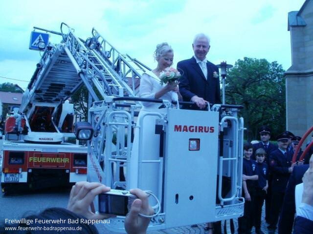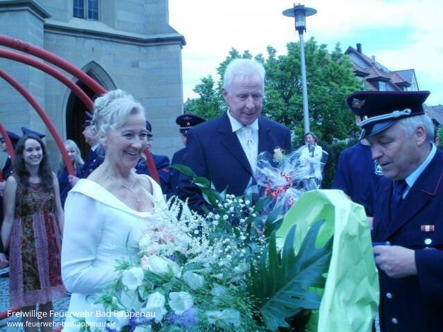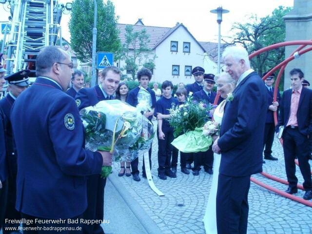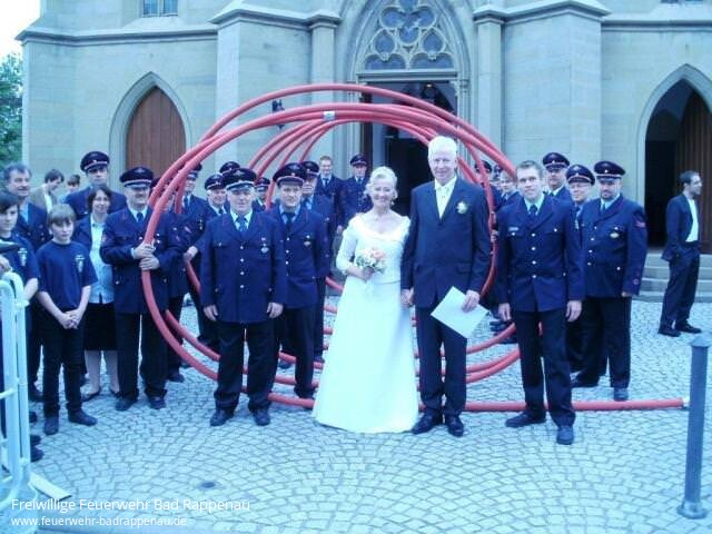 In Fürfeld heiratete am Samstag, den 14.05.2011 der langjährige Abteilungskommandant und heutige Ehrenabt.-Kmdt. Wolfgang Karr seine Lebensgefährtin. Die Abteilungswehr Fürfeld bildete mit luftbefüllten C-Schläuchen einen Spaliertunnel und überreicht nach dem obligatorischen Durchschneiden von einem C-Schlauch ein Geschenk mitsamt Blumenstrauß. Im Namen der Feuerwehr überbrachte Kmdt. Felix Mann dem ehemaligen Ausbilder der "Gesamt"-Feuerwehr Bad Rappenau und seiner Ehefrau die besten Wünsche, ein Geschenk und einen Blumengruß. Anschließend durfte das Brautpaar die Drehleiter besteigen und konnte einen herrlichen Blick aus luftiger Höhe über die Heimatgemeinde genießen. Die Feuerwehr Bad Rappenau mit allen Abteilungen möchte sich auf diesem Weg den Glückwünschen anschließen und wünscht dem Brautpaar für den weiteren Lebensweg alles Gute, Glück und Gesundheit.