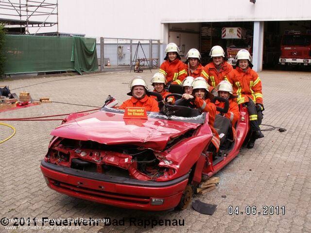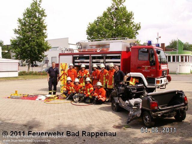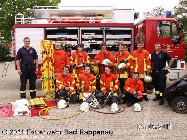Am 03. + 04.06.2011 wurde durch die Freiwillige Feuerwehr Bad Rappenau der Lehrgang Einfache technische Hilfeleistung ausgerichtet. Felix Mann, Kommandant der Feuerwehr Bad Rappenau begrüßte die Teilnehmer. Er erinnerte an die ständig notwendigen weiteren Übungen um das Erlernte zu vertiefen und somit bei Einsätzen mehr Sicherheit bei den Tätigkeiten zu gewinnen. Er wünschte den Lehrgangsteilnehmer viel Erfolg und immer eine gesunde Heimkehr nach Übungen und Einsätzen. Lehrgangsleiter Udo Lauer konnte 9 Teilnehmer der Feuerwehr Bad Rappenau begrüßen. Die Teilnehmer wurden in den Themengebieten rechtliche Grundlagen, das Einsatzablaufschema, die Absicherung der Einsatzstelle sowie Fahrzeugkunde unterwiesen. Unterstützt wurde Udo Lauer von den Ausbildungshelfern Timo Hofmann und Jürgen Seel.Durch die Teilnehmer wurden während des Lehrgangs 3 PKW zerlegt. Am ersten Fahrzeug wurde der gesamten Gruppe die Vorgehensweise bei der technischen Hilfeleistung demonstriert. Praxisarbeit wurde im Lehrgang groß geschrieben, denn nur das Gezeigte bleibt dauerhaft im Gedächtnis haften. Alle Teilnehmer schlossen die ihnen gestellten Übungen mit dem größtmöglichen Erfolg ab und konnten mit einem guten Gefühl wieder in ihre Abteilungen zurückkehren um das Gelernte dort umzusetzen. Die Ausbilder bedankten sich bei allen Lehrgangsteilnehmern recht herzlich, denn nur durch ihre hohe Motivation und die Konzentration war es möglich, die Ausbildung in der vorgegebenen Zeit durchzuführen. Daher war es auch möglich am Samstag die Mittagspause für ein gemeinsames Essen vom Grill zu nutzen. Florian Lauer und Jan Bauer hatten sich bereit erklärt dies für die Lehrgangsteilnehmer vorzubereiten. An dieser Stelle möchte die Führungsmannschaft der Feuerwehr Bad Rappenau allen Teilnehmer einen herzlichen Glückwunsch zur erfolgreichen Lehrgangsteilnahme aussprechen. Es wäre schön, sich wieder einmal bei einem Lehrgang oder einer kameradschaftlichen Veranstaltung zu sehen.Mit Erfolg teilgenommen haben:Berg, Sascha (Obergimpern), Freigang, Carolin (Bad Rappenau), Gabel, Martin (Obergimpern), Grylicki, Moritz (Bonfeld), Haffelder, Andreas (Obergimpern), Hinder, Lukas (Bonfeld), Klumbach, Carolin (Bonfeld), Sälzer, Marcel (Bonfeld) und Wegner, Stephan (Obergimpern)