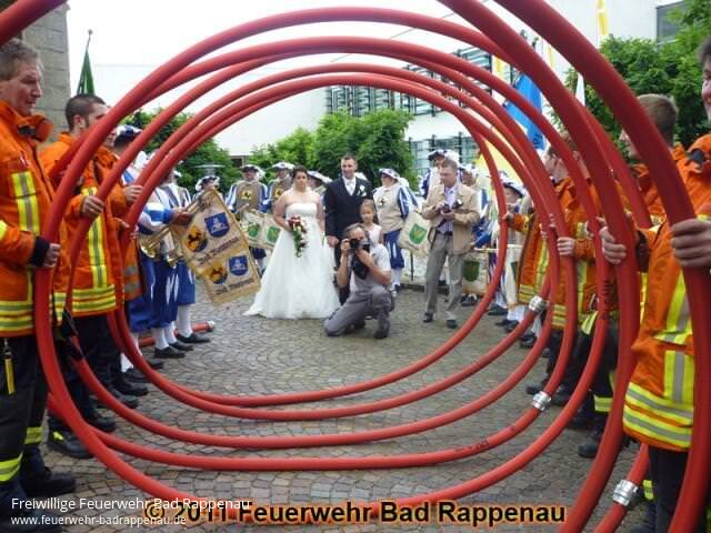 In der evangelischen Kirche in Bad Rappenau heiratete am Samstag, 02.07.2011 unser langjähriger Kamerad Daniel Graf seine Lebensgefährtin.Im Anschluss an den Gottesdienst konnte das Brautpaar und die Hochzeitsgesellschaft durch ein Spalier schreiten, welches die Abteilung Bad Rappenau mit luftbefüllten Schläuchen bildete.Das obligatorische Löschen eines brennenden Miniaturhauses mit der Kübelspritze durfte natürlich nicht fehlen.Die Abteilung Bad Rappenau wünscht dem Brautpaar für den weiteren Lebensweg alles Gute, Glück und Gesundheit.