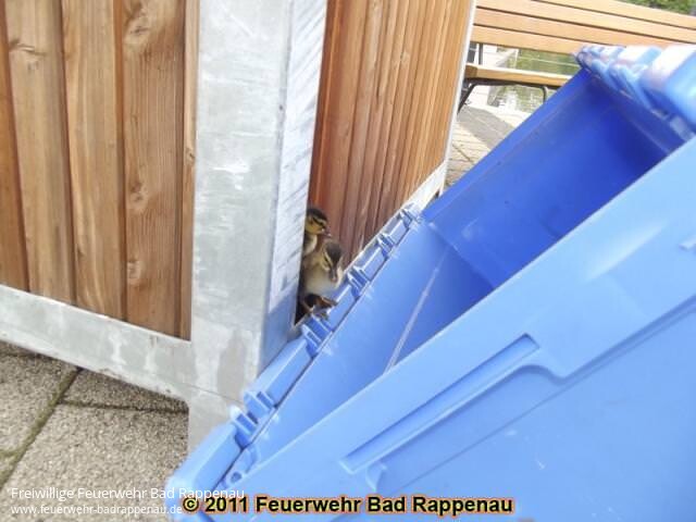 Zu einer ungewöhnlichen Tiernotlage wurde die AbteilungBad Rappenau in den örtlichen Kurpark gerufen.Passanten hatten aus einem Blumenkübel Geräuschewahrgenommen und bei näherem Betrachten mehrereEntenküken darin entdeckt.Durch das Entfernen einer Leiste des hölzernenBlumenkübels, konnten die Entenküken rasch gerettetund wieder mit der Entenmutter vereint werden.