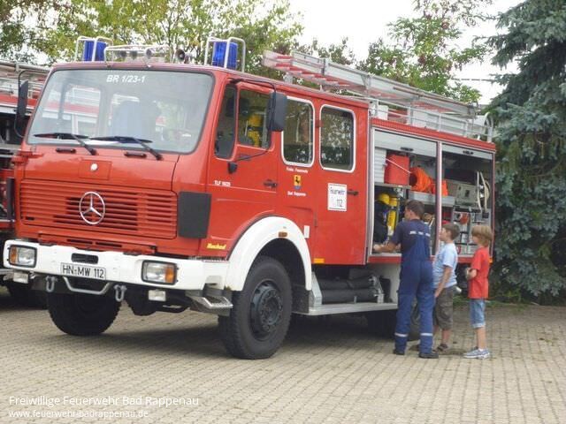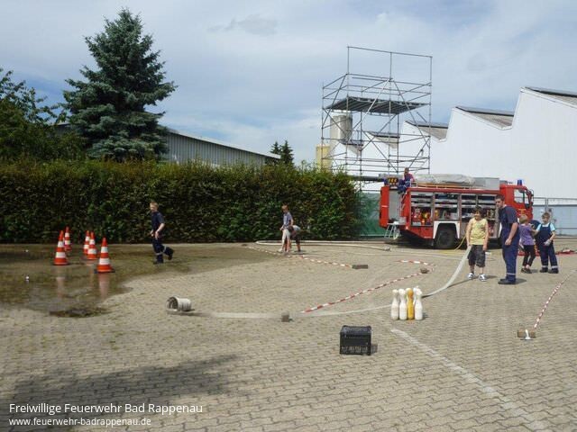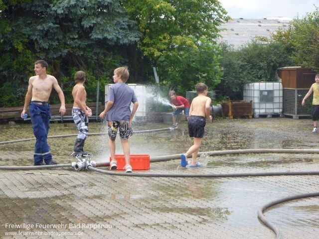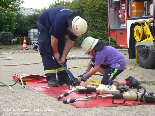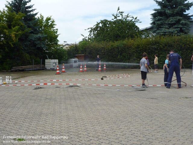 Die Freiwillige Feuerwehr Abt. Bad Rappenau beteiligte sich beim Ferienprogramm, das alljährlich durch die Stadtverwaltung zusammengestellt und ausgeschrieben wird.Insgesamt 8 Kinder trafen sich am Samstag, den 06.08.2011 im Feuerwehrhaus an der Raiffeisenstrasse. In der Zeit von 14:00-17:00 Uhr konnten die Kinder so manches zum Thema Feuerwehr erfahren und auch verschiedene technische Geräte kennen lernen. Durch Jugendleiter Martin Gramlich wurde mit Unterstützung von Sebastian Heisig und Klaus Schneider ein interessantes und kurzweiliges Programm für die Kinder zusammengestellt.Zu Beginn stand eine Führung durch das Feuerwehrhaus an, bei der die Kinder die Unterbringung der Fahrzeuge, die Umkleideschränke mit der Einsatzkleidung sowie die Einsatzzentrale sehen konnten. Eine Fahrt in luftige Höhe mit der Drehleiter hat sicher bei allen Kindern einen bleibenden Eindruck hinterlassen. Beim Schlauchkegeln mussten durch das Ausrollen von einem C-Schlauch möglichst viele Kegel umgeworfen werden. Bei einem weiteren Spiel musste mit dem Wasserstrahl aus einem Strahlrohr Tennisbälle von den Verkehrsleitkegel heruntergeschossen werden. Hier konnten die Kinder ihre Geschicklichkeit beim Umgang mit Einsatzgegenständen in spielerischer Weise unter Beweis stellen. Durch die Kameraden der Einsatzabteilung wurden die kompletten hydraulischen Rettungsgeräte betriebsbereit aufgebaut. Unter Anleitung der Einsatzkräfte konnten die Kinder mit dem kleinsten Gerät (Pedalschneider) Metallrohre abschneiden und dabei erkennen, welch starke Kräfte von diesen Geräten ausgehen. Schließlich durfte zum Abschluss an diesem schwülwarmen Nachmittag eine gemeinsame Wasserschlacht nicht fehlen.Derzeit wurde von den anwesenden Betreuern schon der Grill angeheizt. Die Kinder konnten zusammen mit den anwesenden Mitgliedern derJugendfeuerwehrder Abt. Bad Rappenau bei Wurst und Steak den eindrucksvollen Nachmittag ausklingen lassen.