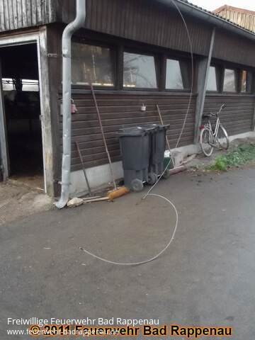 In der Zwischenzeit bereitete die Abteilung Bad Rappenau außerhalb des Absperrbereichs einen Löschangriff vor.Nachdem der Strom abgeschaltet und der gesamte Bereich spannungsfrei war, wurden die betroffenen Gebäude mit Hilfe einer Wärmebildkamera auf Brandnester überprüft.Der vorsorglich mitalarmierte Löschwasserförderzug, bestehend aus den Abteilungen Grombach und Obergimpern, kam nicht zum Einsatz.Zusammen mit dem anwesenden Amtstierarzt wurde der Stall überprüft. Hierbei bestätigte sich, dass acht Milchkühe tödliche Stromschläge erlitten hatten. Personen kamen bei dem Vorfall nicht zu schaden.Vom Hofbesitzer wurde ein Unternehmen mit der Beseitigung der Kadaver beauftragt.Vom den anwesenden Elektrofachkräften des Energieversorgers wurde die beschädigte Oberleitung ausgetauscht und die Stromversorgung für den Hof wiederhergestellt.Die Abteilung Bad Rappenau war mit insgesamt fünf Fahrzeugen und 25 Kameraden im Einsatz. Der Wasserförderungszug war mit insgesamt vier Fahrzeugen und 21 Kameraden vor Ort.