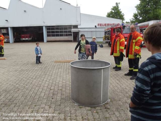 Am Freitag, den 31. August war es soweit. 8 Jungs folgten der Einladung der Jugendfeuerwehr Bad Rappenau an ihrem Ferienprogramm teilzunehmen. Als Betreuer standen die Jugendgruppenleiter und deren Helfer aus den Abteilungen bereit.Die Teilnehmer wurden in 2 Gruppen eingeteilt und haben jeweils 3 Stationen durchlaufen.Bei der ersten Station konnten die Jungs viel über die verschiedenen Fahrzeuge der Feuerwehr in Erfahrung bringen. So lernten sie, dass ein LF die Abkürzung für ein Löschgruppenfahrzeug ist und wie viele Feuerwehrleute zu einer Löschgruppe gehören. Sie konnten sehen wie sich Feuerwehrleute mit Atemschutzgeräten schützen um in brennende Häuser gehen zu können. Beim Erkunden der Fahrzeuge erfuhren sie was es für Schlaucharten gibt: Schläuche zur Wasserentnahme aus offenen Gewässern um die Pumpen in den Fahrzeugen mit Wasser zu versorgen oder Schnellangriffsschläuche zur Brandbekämpfung. Es wurden alle in Bad Rappenau stationierten Fahrzeuge vorgestellt und die Unterschiede erklärt.Eine Führung durch das Feuerwehrhaus der Abteilung Bad Rappenau war Etappe 2. Hier sahen die Jungs wo sich die Feuerwehrleute bei einem Einsatz umziehen, wo die Fahrzeuge stehen und wie ein Notruf funktioniert. Außerdem wurde gezeigt wie sich die Besatzung der Fahrzeuge über Funk untereinander mit der Einsatzzentrale in Bad Rappenau oder mit der Leitstelle in Heilbronn verständigen kann.Bei der 3. Station stand die Geschicklichkeit (Spaß + Spiel) im Vordergrund. Jeder durfte sein Geschick im Leinenbeutelzielwurf und Schlauchkegeln unter Beweis stellen. Beim Zielspritzen kam mancher ins Schwitzen, da das Wasser aus der Kübelspritze gepumpt werden musste. Natürlich gab es als Abkühlung eine kleine Wasserschlacht.Zum Abschluss des erlebnisreichen Tages konnten sich die Teilnehmer und die Betreuer bei einem Vesper stärken und manche Frage konnte hierbei noch beantwortet werden. So ging nach 2,5 Stunden ein spannender Nachmittag zu Ende.Für das Ferienprogramm 2013 sei hier schon angemerkt, dass dies ein Angebot der Feuerwehr für Kinder aus allen Ortsteilen ist und sich die Feuerwehr über eine rege Beteiligung freuen würde.Die Führung der Feuerwehr Bad Rappenau möchte sich an dieser Stelle bei allen anwesenden Betreuern und Helfern bedanken die bereit waren Freizeit oder Urlaub für die Tätigkeit in der Feuerwehr zu opfern um hier den Kindern einen kurzweiligen und spannenden Nachmittag bieten zu können.