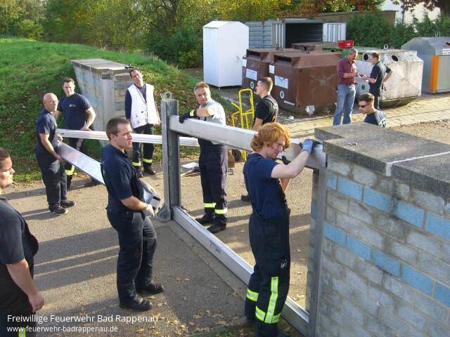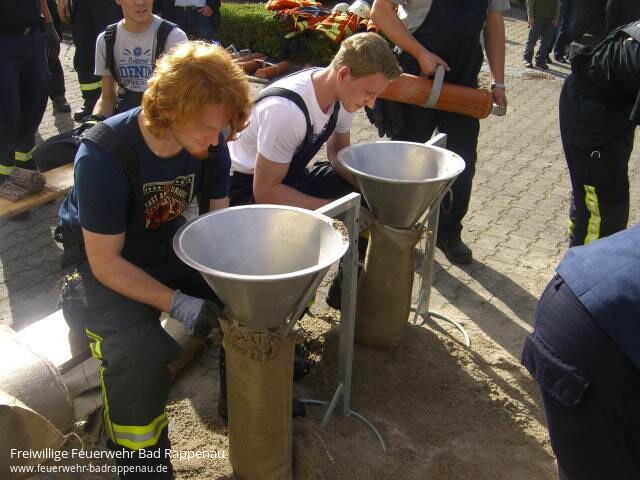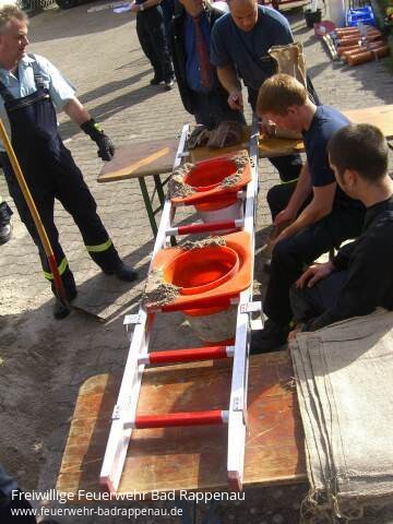 Am 20.10.2012 fand in Heinsheim eine Hochwasserschutzübung der Feuerwehr Bad Rappenau gemeinsam mit dem Zweckverband Hochwasserschutz (Einzugsbereich Elsenz Schwarzbach) statt.Die insgesamt ca. 60 Übungsteilnehmer, bestehend aus Mitarbeitern des Zweckverbandes, Mitarbeitern der Stadtverwaltung, DLRG und Feuerwehr erwartete ein teilweise schweißtreibender aber auch sehr informativer Nachmittag. Nach der Begrüßung durch den örtlichen Abteilungskommandant Matthias Kampp begrüßte Willi Freymeyer in Vertretung von Oberbürgermeister Heribert Blättgen die Übungsteilnehmer und dankte gleichzeitig für die Bereitschaft hier die Freizeit an diesem schönen sonnigen Samstagnachmittag zum Wohle und zur Sicherheit der Bad Rappenauer Bevölkerung zu opfern. Neben Hans-Ulrich Kretz (Leiter Tiefbauamt), Achim Gerbig (Leiter Bauhof) und Gerd Schleyer (Leiter Kläranlage) standen weitere Mitarbeiter der Stadtverwaltung bereit, um zum Gelingen der Übung beizutragen.Anschließend erläuterten Kommandant Felix Mann, Henry Liphardt und Lothar Knödl (beide vom Zweckverband) den Übungsverlauf und die Ziele, die durch diese Übung erreicht werden sollen. Nach dem theoretischen Teil wurden die Teilnehmer in 4 Gruppen eingeteilt. Gruppe 1+2 wurden eingewiesen, wie Sandsäcke zu füllen sind. Hier standen unterschiedliche Gerätschaften bereit und konnten ausprobiert werden. Gruppe 3 setzte das Dammbalkensystem bei der Sporthalle ein und Gruppe 4 wurde in einer Rundfahrt über die Pumpwerke und die Hinterlandzuflüsse informiert. Neben den Pumpwerken lag hier der Schwerpunkt bei der Besichtigung der Verdolungseinläufe. Insbesondere dieses Thema war für die Mitglieder der Feuerwehr interessant, da die Übungsteilnehmer aus allen Abteilungen der Feuerwehr Bad Rappenau stammten und solche Verdolungseinläufe in jedem Ortsteil vorhanden sind. Sicher wird der Bauhof hier zukünftig mehr auf den Zustand dieser Einläufe achten. Mit dem Durchwechseln der Gruppen wurde der gleiche Informationsstand für alle Teilnehmer erreicht. Ab 16:00 Uhr stand dann die hochwassergerechte Verlegung der nun gefüllten 1000 Sandsäcke auf dem Programm. Durch Mitarbeiter des Bauhofes wurden die Sandsackpaletten vom Parkplatz der Feuerwehr mit schwerem Gerät zum Hochwasserschutzdamm bei der Sporthalle transportiert. In einer langen Kette aller Übungsteilnehmer wurden die Sandsäcke unter Anleitung der Mitarbeiter vom Zweckverband fachgerecht verlegt. Auch diese Tätigkeit kann gleichermaßen auf alle Abteilungen der Feuerwehr zukommen, gibt es doch nahezu in jedem Ortsteil Regenrückhaltebecken, bei denen unter Umständen bei Starkregen oder Unwettern der Damm erhöht oder verstärkt werden muss. Da diese Übung als Gruppenführerfortbildung durchgeführt wurde ist es wichtig, dass die Übungsteilnehmer das erlangte Wissen und die Informationen auch in den Abteilungen an die Kameraden weitergegeben werden. Trotz aller Möglichkeiten die zuvor aufgezeigt wurden sei an dieser Stelle auch auf die private Hochwasservorsorge hingewiesen. Möglichkeiten bestehen hier durch die bauliche Vorsorge z.B. das Verschrauben der Öltanks am Boden. Über die Informationsvorsorge können sich die Anwohner über ihre Hochwassergefährdung und mögliche Schutzmaßnahmen informieren. Auch mit der Verhaltensvorsorge, d.h. im Ereignisfall werden – ggf. gemeinsam mit Nachbarn – Notfallmaßnahmen zur Schadensminderung ergriffen, z.B. Hochstellen von Möbel, Sicherung von Geräten. Und mit der finanziellen Vorsorge ist bereits frühzeitig z.B. an eine Versicherung gegen Hochwasserschäden zu denken. Somit sollte jeder rechtzeitig für eine eigene Hochwasserschutzausrüstung sorgen. Organisationen der Gefahrenabwehr wie Feuerwehr oder THW benötigen im Schadensfall ihre Ausrüstung selbst und können diese nicht ausleihen. Als praktischer und sicherheitsrelevanter Tipp sei zum Schluss erwähnt: Mit dem Auspumpen des Kellers erst beginnen, wenn draußen der Wasserstand sinkt, da sonst Auftriebsschäden und Unterspülungen am Gebäude drohen. Für die Verkehrsbehinderungen bitten wir die Bevölkerung nochmal um Verständnis, diese Übung diente ihrer Sicherheit!