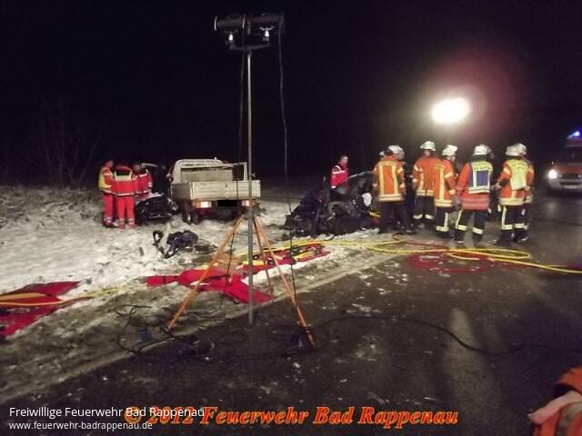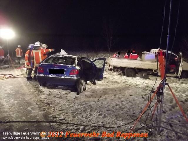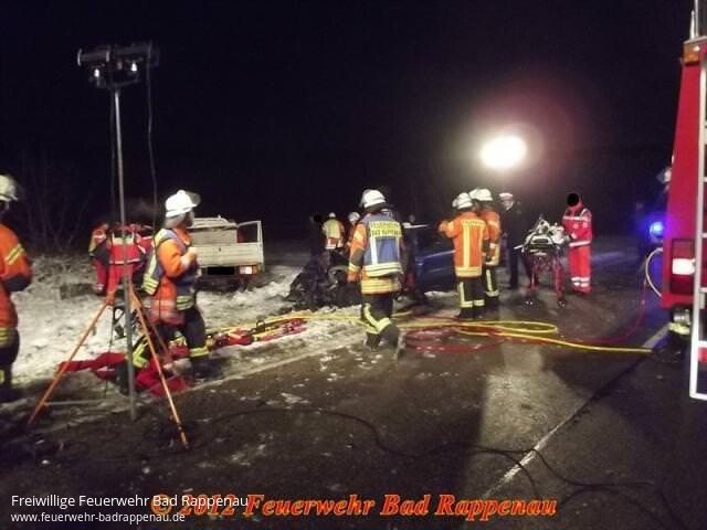 Zu einem schweren Verkehrsunfall zwischen Bad Rappenau und Bad Wimpfen wurde die Abteilung Bad Rappenau an diesem Abend alarmiert.Auf der L530 waren kurz vor dem Ortseingang Bad Wimpfen ein PKW und ein Pritschenwagen frontal zusammengestossen.Die PKW-Lenkerin wurde durch den Aufprall in ihrem Fahrzeug eingeklemmt und musste mittels hydraulischen Rettungsgerät befreit werden.Wegen der schweren Verletzungen verstarb sie noch an der Einsatzstelle.Der schwer verletzte Fahrer des Pritschenwagen wurde nach der Erstversrogung in ein Krankenhaus transportiert.Wegen der Bergungsarbeiten und den Unfallaufnahmen war die Strecke bis gegen 22 Uhr voll gesperrt.Die Feuerwehr Bad Rappenau Abteilung Bad Rappenau war mit fünf Fahrzeugen im Einsatz.Bericht der PD Heilbronn:Schwerer VerkehrsunfallNach den bisherigen Ermittlungen befuhr um 18.44 Uhr ein 44-jährige Lenker eines Kleintransporters die Landstraße 530 ca. 2 KM nach dem Kreisverkehr in Richtung Bad Rappenau/Fürfeld.Dort kam er nach einem Überholvorgang in einer Rechtskurve nach links auf die Gegenfahrbahn und prallte frontal in den entgegenkommenden Pkw Citroen einer 37-jährigen Frau.Diese wurde von der Feuerwehr zunächst aus dem Fahrzeug geschnitten, verstarb jedoch noch an der Unfallstelle an ihren schweren Verletzungen. Der Lenker des Kleintransporters wurde ebenfalls schwer verletzt und in ein nahegelegenes Krankenhaus verbracht.Des Weiteren besteht bei dem 44-jährigen der dringende Verdacht, dass er zum Unfallzeitpunkt unter dem Einfluss von Alkohol gestanden hat. Die Staatsanwaltschaft Heilbronn ordnete deshalb zur Erforschung des Unfalles die Entnahme einer Blutprobe bei dem 44-jährigen an, sowie die Erstellung eines technischen Unfallgutachtens. An den Fahrzeugen entstand ein Sachschaden von 15000 Euro. Einen sogenannten witterungsbedingten Unfall wegen Schneeglätte o. ä. kann die Polizei nach ersten Feststellung ausschließen. Die Landstraße 530 war wegen den Bergungs- und Ermittlungsmaßnahmen bis gg. 22.00 Uhr gesperrt. Die Polizeireviere Neckarsulm und Eppingen waren mit insgesamt 3 Streifen im Einsatz. Die Feuerwehr Bad Rappenau war mit 18 Einsatzkräften vor Ort. Der Rettungsdienst mit 2 Rettungswagen, einem Notarzteinsatzfahrzeug, 1 Notfallnachsorgedienstteam. Zur Betreuung der Angehörigen wurde ein Geistlicher als Notfallseelsorger verständigt.