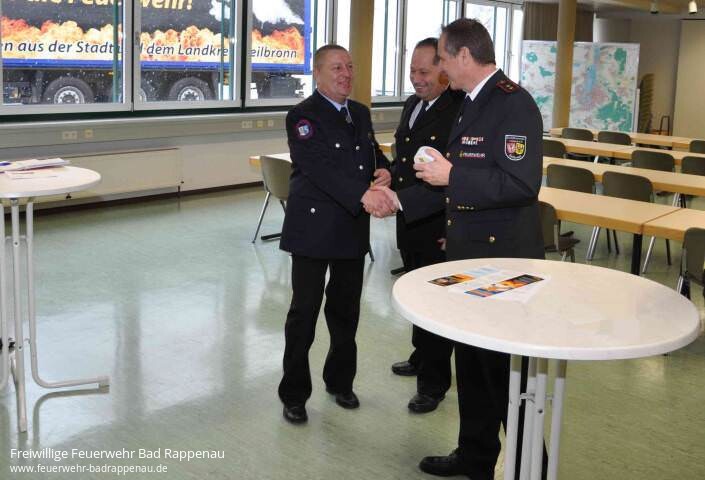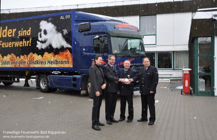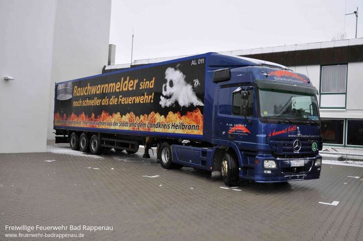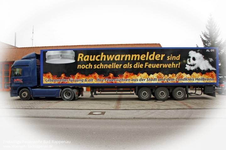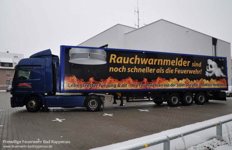 Unter dem Motto Rauchmelder sind noch schneller als die Feuerwehr stellte der Vorsitzende des Kreisfeuerwehrverbandes, Reinhold Gall eine neuartige Idee im Hinblick auf die Werbung für Rauchwarnmelder vor.Mit einem auffällig beschrifteten Sattelauflieger wird künftig großflächig Werbung für die kleinen Lebensretter im regionalen und überregionalen Straßenverkehr gemacht. Dem Bürger soll mit diesem Fahrzeug visuell die Wichtigkeit von Rauchwarnmeldern vermittelt werden.Zur Vorstellung versammelten sich am Samstag geladene Gäste auf der Hauptfeuerwache in Heilbronn. Neben Bezirksbrandmeister Frieder Lieb und Kreisbrandmeister Uwe Vogel, konnte Feuerwehrkommandant Eberhard Jochim auch einen Teil der Mitglieder des Ausschusse des Kreisfeuerwehrverbandes Heilbronn und Vertreter der Presse in seiner kurzen Ansprache begrüßen.Im Mittelpunkt der Veranstaltung stand jedoch der Initiator dieser außergewöhnlichen Aktion. Der Bad Friedrichshaller Spediteur und selbst aktiver Feuerwehrmann Christoph Frühauf hatte diese derzeit bundesweit einzigartige Idee ins Leben gerufen.Der Vorsitzende des Kreisfeuerwehrverbandes Reinhold Gall würdigte dieses Engagement und überreichte Christoph Frühauf symbolisch einen neuen Rauchwarnmelder. Frühauf ließ es sich aber nicht nehmen, diesen Melder gleich wieder seinem Mitarbeiter Ewald Frischbier weiterzugeben.Betrachtet man diesbezüglich die Jahresbilanz in Deutschland, so gibt es rund 500 Brandtote, 5.000 Brandverletzte mit Langzeitschäden und über eine Mrd. Euro Brandschäden in privaten Bereichen.In zehn deutschen Bundesländern sind Rauchmelder bereits gesetzlich vorgeschrieben. Zum 1. Januar 2013 trat die Rauchmelderpflicht in Bayern in Kraft. Auch die baden-württembergische Landesregierung hat den Weg zur Änderung des Baurechts frei gemacht und zieht nun ebenfalls mit einer Rauchmelderpflicht nach, welche ab diesem Jahr zunächst in Neu- und umfangreichen Umbauten Pflicht wird.Aber nicht nur wegen der Pflicht, sondern aufgrund der eigenen Vernunft sollten Rauchmelder im eigenen Haushalt Verwendung finden. Gerade auf die Vernunft möchte dieses Werbefahrzeug eindringlich hinweisen, da es keine bessere und kostengünstigere Möglichkeit als den Rauchwarnmelder gibt um sich und seine Familie vor den Gefahren eines Brandes zu schützen.Für Webezwecke kann der Sattelauflieger Feuerwehren und Firmen, welche Präventionsarbeit in Sachen Rauchwarnmelder leisten, nach Absprache mit der Freiwilligen Feuerwehr Bad Friedrichshall bzw. mit der Berufsfeuerwehr Heilbronn zur Verfügung gestellt werden.