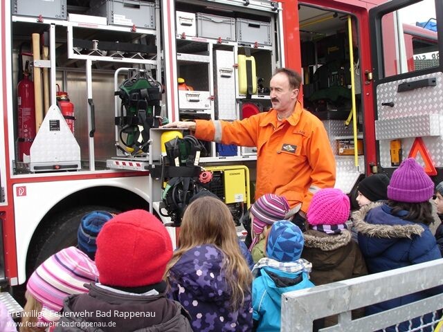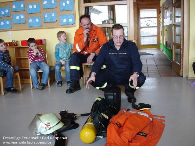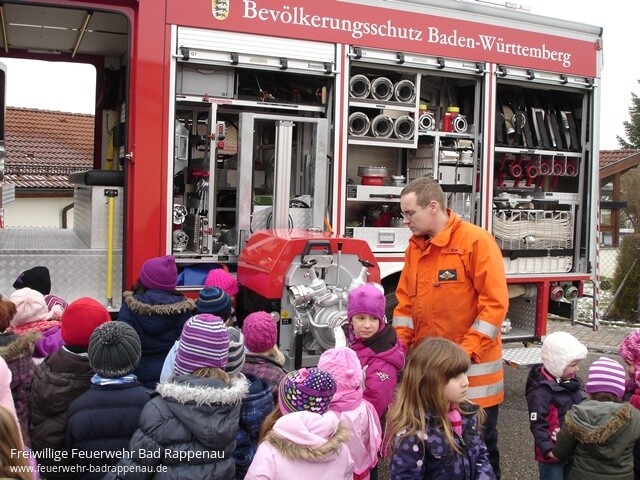 Am Di. 26.2.2013 besuchten uns Herr L. Fleck und Herr T. Böhm von der Feuerwehr Grombach im Kindergarten.Der Besuch wurde natürlich im Voraus im Morgenkreis besprochen, dabei sind einige Fragen aufgetaucht, auf deren Antwort die Kinder gespannt warteten.z.B. Wie ist die Feuerwehr ausgerüstet?Was muss man beachten, wenn es brennt?Löscht man nur mit Wasser? ..Dann war es endlich soweit. Herr Fleck und Herr Böhm kamen zu uns.Sie erklärten uns, dass jeder Feuerwehrmann oder Feuerwehrfrau hitzebeständige Kleidung, einen Feuerwehrhelm, Stiefel, Schutzhandschuhe und einen Sicherheitsgurt tragen muss.Gemeinsam mit den Kindern erarbeiteten sie, wie man sich im Brandfall verhalten sollte.Die Kinder waren mit viel Eifer bei der Sache. So manches Kind konnte den Feuerwehrmännern die Notrufnummer 112 sagen.Zum Abschluss durften wir natürlich noch das wichtigste, das Feuerwehrauto bestaunen.Es war für die Kinder, wie auch für die Erzieherinnen ein lehrreicher Vormittag.