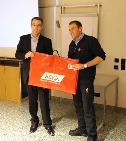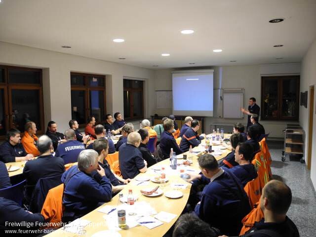 Im Rahmen der Gruppenführer-Fortbildung waren die Zug- + Gruppenführer aller Abteilungen der Feuerwehr Bad Rappenau zu Gast in den Betriebsräumen vom Zweckverband Wasserversorgungsgruppe Mühlbach (WVG Mühlbach). Durch Geschäftsführer Steffen Heber erhielten die Kameraden Informationen zum Verbandsgebiet insgesamt sowie detaillierte Hinweise zum Versorgungsgebiet von Bad Rappenau. Im dritten Themenblock wurden Tipps für die Wasserentnahme im Übungs- + Einsatzfall gegeben. Auch sind gewisse Vorgaben in hygienischer Hinsicht bei der Wasserentnahme durch die Feuerwehr zu beachten. Der Leiter des Wasserförderungszuges, Philipp Kern gab Hinweise zur Leistungsfähigkeit des Wasserförderungszuges im Bezug auf die Themen Leitungslänge / Fördermenge / möglicher Höhenunterschied besonders in Sicht auf die abgelegen Siedlungen im Stadtgebiet Bad Rappenau. Nach der Theorie und einer kleinen Stärkung folgten noch drei Praxisstationen im Außenbereich. Mit 3 Löschfahrzeugen und einem Mannschaftstransportwagen sowie dem Kommandowagen wurden die insgesamt 38 Kameraden zu den jeweiligen Löschwasserbehältern im Kohlhof, im Grafenwald und bei den Heinsheimer Höfen gebracht. Dort erfolgten durch die Vertreter der WVG Mühlbach sowie durch Kommandant Felix Mann weitere Hinweise zur korrekten Wasserentnahme und der Befüllung nach erfolgter Entnahme. Im Rahmen der Veranstaltung wurden durch Geschäftsführer Steffen Heber ein Rauchverschluss als Sachspende an Kommandant Felix Mann übergeben. Der Rauchverschluss (auch Rauchvorhang genannt) kann an Türrahmen angebracht werden und hält so z.B. Treppenräume oder Wohnungsabschnitte rauchfrei. Die Sachspende verbessert in Zukunft die Ausrüstung der Abt. Babstadt, da diese Abt. bei Schadenslagen in Gebäuden besonderer Art und Nutzung hinzualarmiert wird. Die Feuerwehr Bad Rappenau bedankt sich auf diesem Weg nochmals beim Zweckverband Wasserversorgungsgruppe Mühlbach für die Sachspende.