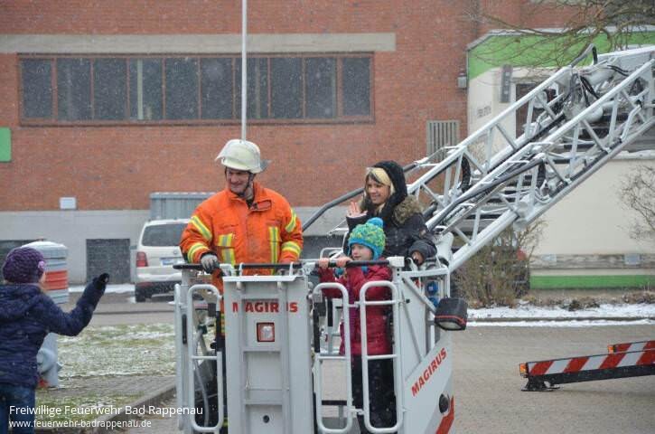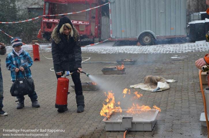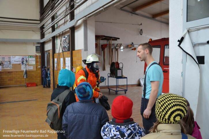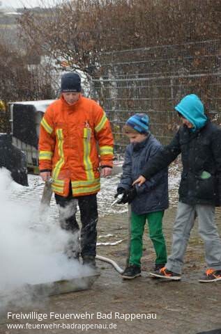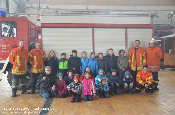 Am Montag, den 25.03.2013 besuchten die Kinder der Kernzeitbetreuung Bad Rappenau die Abteilung Bad Rappenau. Die 16 Kinder (8-10 Jahre) waren natürlich sehr gespannt was sie bei der Feuerwehr zu sehen bekommen. Nach einer kurzen Begrüßung durch die anwesenden Feuerwehrleute konnten alle in einer Präsentation die Aufgaben der Feuerwehr erfahren und das Verhalten bei Feuer und Rauch lernen. Hierbei war vor allem die Demonstration der Kerzentreppe sehr eindruchsvoll.Aufgeteilt in 4 Gruppen durchliefen die Kinder nun verschiedene Stationen. Beim Rundgang durchs Gerätehaus konnten die verschiedenen Räumlichkeiten entdeckt werden, besonders interessant waren natürlich die Fahrzeughalle mit den Feuerwehrautos und die Umkleide mit der Einsatzkleidung. An der zweiten Station konnte die Einsatzkleidung ausprobiert und das Geheimnis des Atemschutzgerätes gelüftet werden. Anschließend ging es auf allen Vieren durch einen verrauchten Flur. Beim Drehleiter fahren ging es dann hoch hinaus! Trotz des schlechten Wetters trauten sich alle in den Korb um Bad Rappenau von oben zu sehen.Zuletzt galt es noch verschiedene Feuer zu löschen. Der Umgang mit Wasser, Sand und Löschdecke wurde gemeinschaftlich geübt und brachte auch den erhofften Erfolg. Hier lernten die Kinder auch die Vor- und Nachteile der Löschmittel, sowie den respektvollen Umgang mit Feuer kennen. Am Firetrainer konnten die Erzieherinnen die Brandbekämpfung mit einem Feuerlöscher üben und die richtige Vorgehensweise ausprobieren.Nach dem spannenden Vormittag rückte bei den Kindern der Berufswunsch Feuerwehrmann wohl wieder auf Platz 1. Die Freiwillige Feuerwehr, Abt. Bad Rappenau bedankt sich hiermit bei den Betreuerinnen und den Kindern der Kernzeitbetreuung für den Besuch und bei den mithelfenden Kameraden für das Zeitopfer und die Unterstützung.