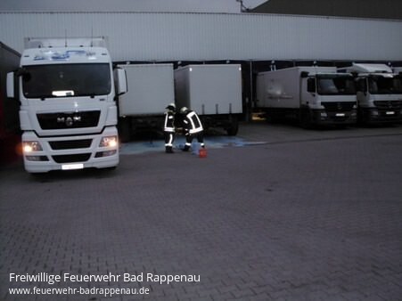 In einer Firma im Talheimer Industriebetrieb war aus bislang nicht geklärter Ursache ein sogenannter IBC auf einem LKW beschädigt worden und eine unbekannte Flüssigkeit lief aus.Aus diesem Grund wurde neben der Feuerwehr Talheim auch die Feuerwehren Lauffen mit dem GW-Mess und der Gefahrstoffzug aus Babstadt und Bad Rappenau alarmiert.Während der Anfahrt des Gefahrstoffzuges zur Einsatzstelle, konnte die Feuerwehr aus Talheim eine erste Erkundung durchführen und Entwarnung geben. Bei dem auslaufenden Stoff handelte es sich nicht um einen Gefahrstoff, dennoch war die Flüssigkeit "schwach wassergefährdend".Von der örtlichen Feuerwehr wurden die Kanaleinläufe auf dem Betriebshof gesichert, damit keine Flüssigkeit in die Kanalisation gelangen konnte.Vor Ort wurde vom örtlichen Einsatzleiter, in Abstimmung mit Kreisbrandmeister Uwe Vogel und den beiden Fachberatern Chemie, entschieden, dass die örtliche Feuerwehr sowie der Gefahrstoffzug keine weiteren Massnahmen ergreifen musste.Die ausgelaufene Flüssigkeit wurde durch eine Fachfirma aufgenommen und entsorgt.(Quelle Einsatzbilder: Feuerwehr Talheim)
