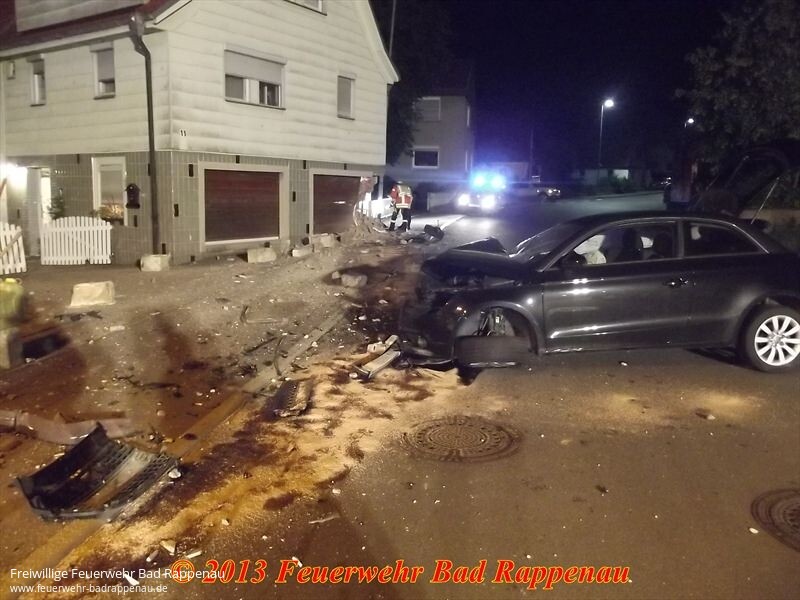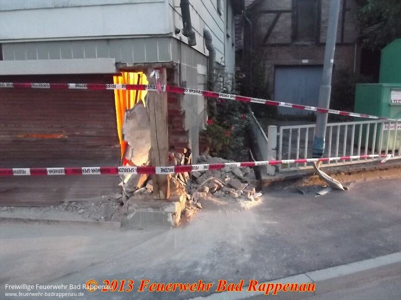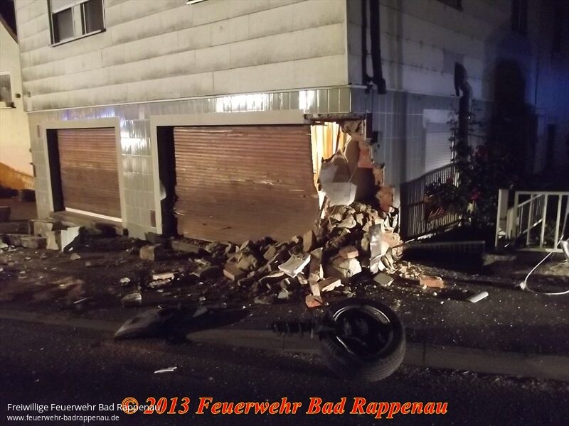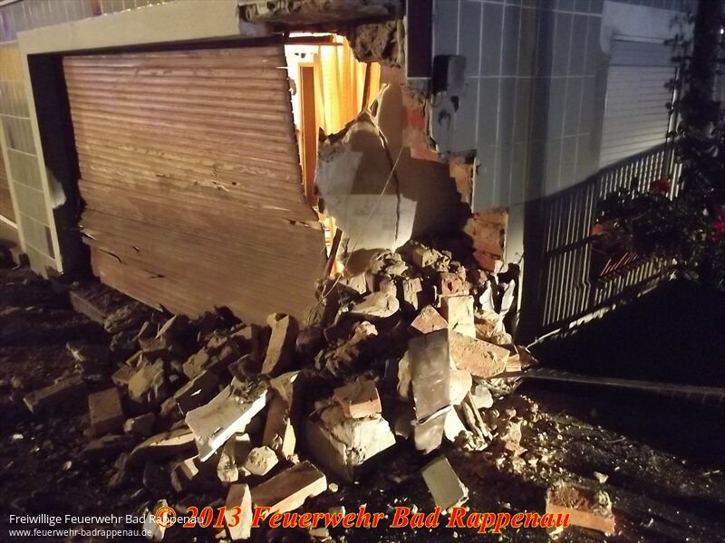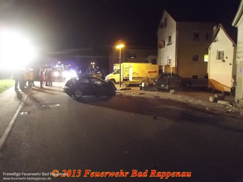 Mit dem Stichwort "Ölspur" alarmierte die integrierte Leitstelle Heilbronn zunächst die Abteilung Obergimpern in die dortige Hauptstraße.Dort war nach einem Pkw-Unfall ein Ölspur aufzunehmen.Ein Kleinwagen kam aus unbekannter Ursache nach rechts von der Fahrbahn ab, streifte eine Straßenlaterne und prallte in ein Wohnhaus.Die drei Fahrzeuginsassen wurden verletzt, konnten vom Rettungsdienst ohne technische Hilfsmittel aus dem Fahrzeug befreit werden. Nach der Erstversorgung wurden sie in ein Krankenhaus gebracht.Zur Sicherung des erheblich beschädigten Gebäudes wurde die Abteilung Bad Rappenau alarmiert.Die teilweise herausgebrochene Hauswand wurde mit einem Balken abgestützt.Um die beschädigte Straßenlaterne kümmerte sich die EnBW.