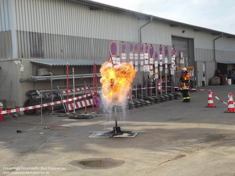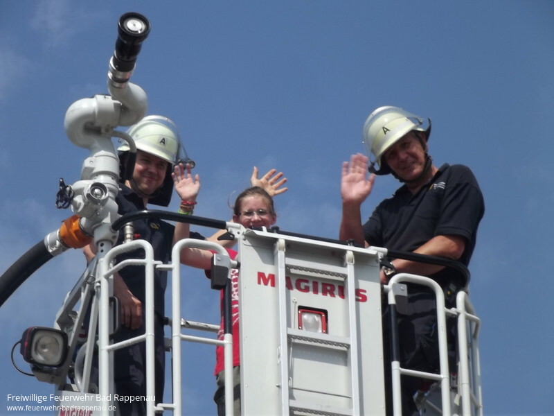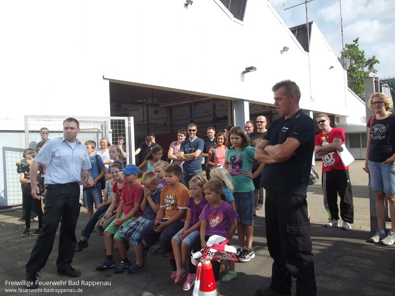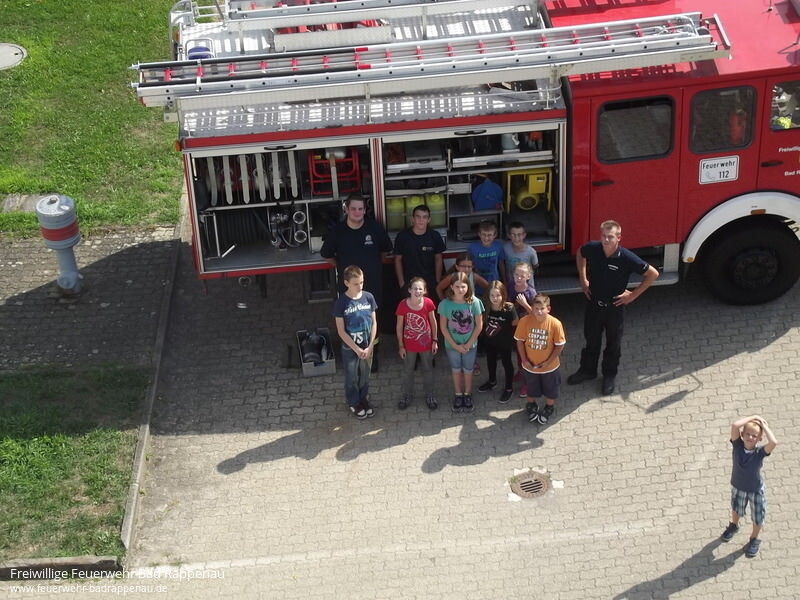 Am Freitag, den 23. August war es soweit. 12 Kinder folgten der Einladung der Jugendfeuerwehr Bad Rappenau an ihrem Ferienprogramm teilzunehmen. Als Betreuer standen die Jugendgruppenleiter und deren Helfer aus den Abteilungen für die 7 Jungs und 5 Mädchen bereit.Die Teilnehmer wurden in 4 Gruppen eingeteilt und haben jeweils 4 Stationen durchlaufen.Bei der ersten Station konnten die Jungs viel über die verschiedenen Fahrzeuge der Feuerwehr in Erfahrung bringen. So lernten sie, dass ein LF die Abkürzung für ein Löschgruppenfahrzeug ist und wie viele Feuerwehrleute zu einer Löschgruppe gehören. Sie konnten sehen wie sich Feuerwehrleute mit Atemschutzgeräten schützen um in brennende Häuser gehen zu können. Beim Erkunden der Fahrzeuge erfuhren sie was es für Schlaucharten gibt: Schläuche zur Wasserentnahme aus offenen Gewässern um die Pumpen in den Fahrzeugen mit Wasser zu versorgen oder Schnellangriffsschläuche zur Brandbekämpfung. Es wurden alle in Bad Rappenau stationierten Fahrzeuge vorgestellt und die Unterschiede erklärt.Eine Führung durch das Feuerwehrhaus der Abteilung Bad Rappenau war Etappe 2. Hier sahen die Jungs wo sich die Feuerwehrleute bei einem Einsatz umziehen, wo die Fahrzeuge stehen und wie ein Notruf funktioniert. Außerdem wurde gezeigt wie sich die Besatzung der Fahrzeuge über Funk untereinander mit der Einsatzzentrale in Bad Rappenau oder mit der Leitstelle in Heilbronn verständigen kann.Als 3. Punkt bestand für alle Kinder die Möglichkeit mit der Drehleiter von luftiger Höhe auf die Dächer von Bad Rappenau zu blicken. Die Fahrt mit der Drehleiter hoch hinaus über Bad Rappenau war natürlich ein einzigartiges Erlebnis für die Ferienprogrammteilnehmer. Die Fahrt mit dem Löschfahrzeug über den Hof der Feuerwehr war nicht weniger interessant konnte hierbei doch Blaulicht und Martinshorn auf seine Funktion getestet werden.Bei der 4. Station stand die Geschicklichkeit (Spaß + Spiel) im Vordergrund. Jeder durfte sein Geschick im Leinenbeutelzielwurf und Schlauchkegeln unter Beweis stellen. Beim Zielspritzen kam mancher ins Schwitzen, da das Wasser aus der Kübelspritze gepumpt werden musste. Natürlich gab es als Abkühlung eine kleine Wasserschlacht.Zum Abschluss des erlebnisreichen Tages konnten sich die Teilnehmer und die Betreuer bei einem Vesper stärken und manche Frage konnte hierbei noch beantwortet werden. So ging nach 2,5 Stunden ein spannender Nachmittag zu Ende.Als Abschluss-High-Light wurden den abholenden Eltern und den Kindern noch eine Fettexplosion vorgeführt. Hier war für alle beeindruckend zu sehen was passiert wenn man brennendes Fett in Pfanne oder Topf versucht mit Wasser zu löschen. Das nächste Mittagessen gibt es dann bei McDonalds weil die Küche dann zerstört wäre. Also doch lieber den Deckel auf den Topf oder eine Lösdchdecke darüber legen.Kmdt. Felix Mann informierte die anwesenden Eltern über die neue Rauchwarnmelderpflicht in Baden Württemberg. Der Landtag von Baden-Württemberg hat am 16. Juli 2013 eine Rauchwarn-melderpflicht beschlossen. Die Warngeräte müssen ab sofort in Neubauten und bis Ende 2014 in bestehenden Gebäuden installiert werden. Jährlich sterben rund 600 Menschen in Deutschland bei Bränden, die Mehrzahl von ihnen in Privathaushalten. 95 Prozent fallen dabei nicht den Flammen zum Opfer sondern einer Rauchvergiftung. Rauchwarnmelder können diese Gefahren reduzieren. Sie warnen zuverlässig, auch im Schlaf, vor Brandrauch und geben ihnen die Möglichkeit sich selbst und andere in Sicherheit zu bringen und die Feuerwehr zu rufen. Siehe hierzu auch:https://www.baden-wuerttemberg.de/de/service/presse/pressemitteilung/pid/fragen-und-antworten-rund-um-das-thema-rauchwarnmelderpflicht/Für das Ferienprogramm 2014 sei hier schon angemerkt, dass dies ein Angebot der Feuerwehr für Kinder aus allen Ortsteilen ist und sich die Feuerwehr über eine rege Beteiligung freuen würde.Die Führung der Feuerwehr Bad Rappenau möchte sich an dieser Stelle bei allen anwesenden Betreuern und Helfern bedanken die bereit waren Freizeit oder Urlaub für die Tätigkeit in der Feuerwehr zu opfern um hier den Kindern einen kurzweiligen und spannenden Nachmittag bieten zu können.