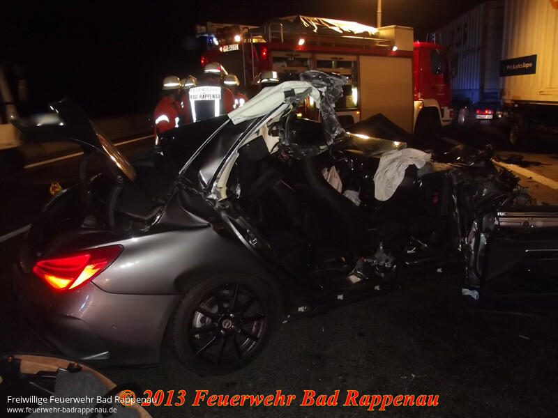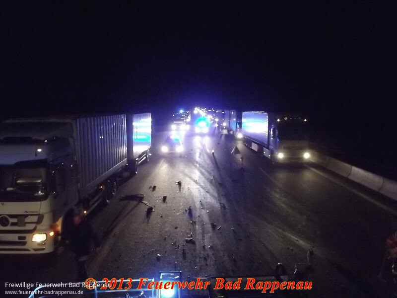 In den frühen Morgenstunden kam es auf der Autobahn A6 in Fahrtrichtung Mannheim zu einem schweren Verkehrsunfall.Die Abteilung Bad Rappenau sowie die Berufsfeuerwehr Heilbronn wurden von der ILS zur Einsatzstelle gerufen.Aus bislang ungeklärter Ursache streife ein PKW einen vorausfahrenden LKW und schleuderte in einen weiteren davor fahrenden Sattelzug.Hierbei wurde die Beifahrerin lebensgefährlich verletzt im Fahrzeug eingeklemmt. Der Fahrer und eine weitere Mitfahrerin konnten das Fahrzeug leichtverletzt aus eigener Kraft verlassen. Alle Fahrzeuginsassen wurden vom Rettungsdienst versorgt und in umliegende Krankenhäuser gebracht.Durch die weit verstreuten Trümmerteile musste der Verkehr bis zur Bergung der Unfallfahrzeuge einspurig an der Einsatzstelle vorbeigeleitet werden. Während der Rettungsarbeiten musste die Autobahn immer wieder kurzfristig voll gesperrt werden.Die Reinigung der Unfallstelle wurde durch die Autobahnmeisterei übernommen. Erst gegen 8:30 Uhr wurden alle Fahrstreifen wieder für den Verkehr freigegeben.