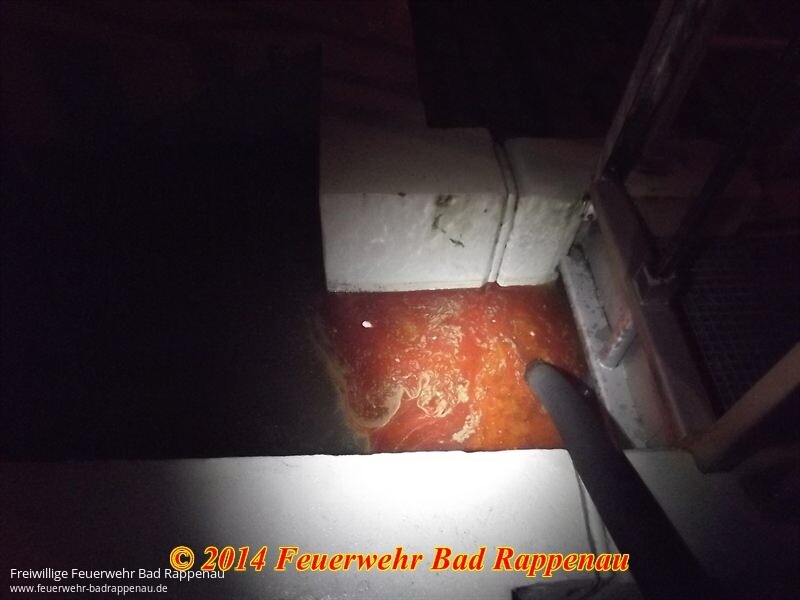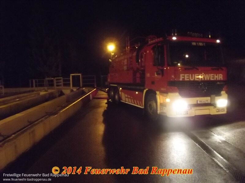 Um 23:22 wurden die Kameraden der Abteilung Bad Rappenau zum zweiten Mal an diesem Tag durch die Integrierte Leitstelle in die Raiffeisenstraße gerufen.Diesmal hatten besorgte Anwohner eines Mehrfamilienhauses die 112 gerufen, weil ein provisorisch installierter Heizöltank aus unbekannter Ursache umgekippt und dabei Leck geschlagen war.Beim Eintreffen der ersten Kräfte hatten die Anwohner bereits die Reste des ausgelaufenen Öls mit Sägemehl abgestreut. Der weitaus größere Teil des Heizöls war bereits über einen Bodenablauf in die Kanalisation gelangt. Umgehend wurde die örtliche Kläranlage und die Polizei alarmiert. Die Beseitigung des ausgebrachten Sägemehls wurde von einer Heizungsfirma übernommen.Vorsorglich wurde auch der Rappenauer Kursee kontrolliert. Da auch hier kleine Mengen Heizöl im Bereich des Einlaufes festgestellt wurden, wurde am Auslauf eine Ölsperre eingebracht.Gegen 01:30 Uhr informierte der Klärwärter die Feuerwehr, dass nun größere Mengen Heizöl im Klärwerk Zimmerhof ankommen. Diese konnten mittels eines Schiebers in einem vorgelagerten Becken zurückgehalten werden. In Absprache mit Oberbürgermeister Hans Heribert Blättgen, welcher sich vor Ort über die aktuelle Einsatzsituation informierte, wurde die Berufsfeuerwehr Heilbronn mit einem Abrollbehälter Tank/Gefahrgut zur Kläranlage gerufen, um das aufgefangene Öl-Wasser-Gemisch aufzunehmen.Die Einsatzkräfte der Abteilung Bad Rappenau konnten gegen 03:00 Uhr ihre Nachtruhe fortsetzen. Die Kollegen der Berufsfeuerwehr Heilbronn waren bis gegen 5:00 Uhr beschäftigt, die ca. 3.500 Liter Öl-Wasser-Gemisch aufzunehmen.Die Ölsperre im Kursee wurde am späten Freitagvormittag wieder abgebaut.Aufgrund der hervorragenden Zusammenarbeit aller Beteiligten, konnte nahezu das gesamte ausgelaufene Heizöl aufgefangen und ein größerer Schaden für die Umwelt verhindert werden.