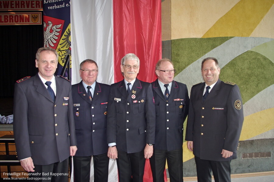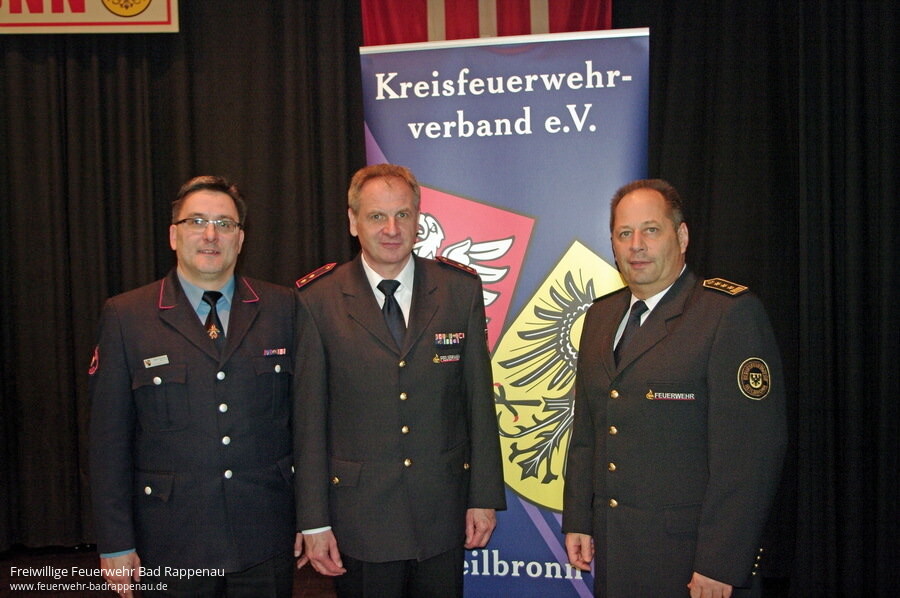 Bei der Jahreshauptversammlung des Kreisfeuerwehrverbandes Heilbronn am gestrigen Samstag in Leingarten standen die Neuwahlen des Vorstandes auf dem Programm.Da sowohl der bisherige 2. stellvertretende Verbandsvorsitzende Albert Decker und Kassier Rainer Süßer aus Altersgründen nicht mehr kandidierten, waren diese beiden Positionen auf jeden Fall neu zu besetzen.Für das Amt des ersten Vorsitzenden stellte sich Reinhold Gall zur Wiederwahl. Er wurde per Akklamation einstimmig im Amt bestätigt.Der 1. stellvertretende Vorsitzende ist laut Satzung der Kommandant der Feuerwehr Heilbronn – Eberhard Jochim. Somit muss hier nicht gewählt werden.Für das Amt des 2. stellvertretenden Verbandsvorsitzenden waren bereits im Vorfeld zwei Kandidaten nominiert worden:Martin Kuhmann – Kommandant der Feuerwehr Eppingen undTorsten Rönisch – Mitglied der Feuerwehr NeckarsulmBei der geheim durchgeführten Wahl erhielt Martin Kuhmann 79 Stimmen, Torsten Rönisch 51 Stimmen. Somit ist Martin Kuhmann neuer 2. stellvertretender Verbandsvorsitzender.Zum Nachfolger von Rainer Süßer als Kassier wurde Herbert Darilek von der Feuerwehr Möckmühl wiederum einstimmig per Akklamation gewählt.Eine Übersicht über den neu zusammengesetzten Verbandsausschuss finden sie unter: https://www.kfv-heilbronn.de/ausschuss.phpBild 1: Der neue Verbandsvorstand: Martin Kuhmann, Reinhold Gall, Eberhard Jochim (v.l.n.r.)Bild 2: nicht mehr im Ausschuss sind Kurt Semen, Rainer Süßer und Albert Decker (in der Mitte v.l.n.r.) (Fotos: Kreisfeuerwehrverband)
