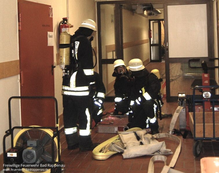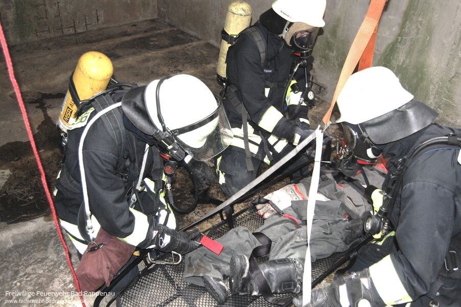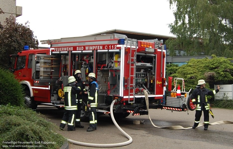 Hauptübung der Freiwilligen Feuerwehr Bad WimpfenAm Samstag 26.Juli 2014 um 14 Uhr, nur eine Woche nach dem Großbrand der Tabakhallen waren die Männer und Frauen der Freiwilligen Feuerwehren Bad Wimpfen und Bad Rappenau erneut bei hoch sommerlichen Temperaturen gefordert. Diesmal war es „nur“ die alljährliche Hauptübung im SRH Gesundheitszentrum Bad Wimpfen.Folgende Lage erwartete die Einsatzkräfte: Im Kesselraum im UG ereignete sich eine Verpuffung, Rauch kam aus dem Notausstieg, ein Person war vermisst.Der Angriffstrupp des Hilfeleistungslöschfahrzeugs HLF 20/16 machte sich sofort auf die Suche nach der vermissten Person im Keller. Zeitgleich arbeitete sich der Angriffstrupp des Löschgruppenfahrzeugs LF8 von der Gebäuderückseite zur Brandbekämpfung zum Kesselraum vor. Nach kurzer Zeit wurde dem Einsatzleiter Matthias Elsasser gemeldet, dass die Person gefunden wurde. Aufgrund der verwinkelten und noch dazu verqualmten Kellergänge musste die Person über den engen Notausstieg gerettet werden. Diese Rettung war nur mit Hilfe der Drehleiter, dem Rollgliss und der Korbtrage möglich. Um die Wasserversorgung sicherzustellen legte die Besatzung des Gerätewagens Transport GW-T eine weitere B-Leitung vom Hydrant in der Osterbergstrasse zum Einsatzort.Noch während die Menschenrettung und Brandbekämpfung in vollem Gange war, rief plötzlich eine Frau auf einem Balkon „Feuer, Feuer bei mir brennt es – Zimmer 708“. Dies war ein weiterer Teil der Hauptübung, hier wurde angenommen, dass die Bewohnerin durch den Rettungseinsatz der Feuerwehr so abgelenkt war, dass sie ihr Bügeleisen, welches auf einem Wäschestück stand, vergaß.Da bei einem Alarm im SRH Gesundheitszentrum immer sofort ein Löschzug von Bad Rappenau mit alarmiert wird und in ihrem Feuerwehrgerätehaus auf Abruf bereit steht, griff Einsatzleiter Matthias Elsasser sofort auf die Hilfe der Bad Rappenauer zurück. Um zu diesem Einsatzort zu gelangen, fuhren die Einsatzkräfte aus Bad Rappenau die Gebäuderückseite des „Haus F“ (ehemals Osterberg) an.Die Drehleiter aus Bad Rappenau wurde für die Menschenrettung in Stellung gebracht. Während sich der Angriffstrupp auf den langen Weg ins 7. Obergeschoss machte, wurde die Steigleitung befüllt, so konnte der Angriffstrupp direkt den Wandhydrant im 7. OG anschließen und das „Feuer“ im Zimmer 708 rasch ablöschen.Um 15:30 Uhr war die Übung beendet und alle Einsatzkräfte trafen sich zur Nachbesprechung in der Cafeteria der SRH. Bürgermeister Brechter und Kommandant Martin Ramsperger bedankten sich bei allen Feuerwehrleuten die auch bei dieser Übung wieder ihre Schlagkraft unter Beweis gestellt haben. Natürlich auch bei den beiden Hausmeistern Hr. Schlüter und Hr. Holler welche halfen die Übung vorzubereiten und durchzuführen.Im Übungseinsatz waren die Feuerwehr Bad Wimpfen mit 6 Fahrzeugen und 31 Mann, die Feuerwehr Bad Rappenau mit 2 Fahrzeugen und 12 Mann sowie das DRK Ortsverband Bad Wimpfen mit 1 Fahrzeug und 4 Mann.