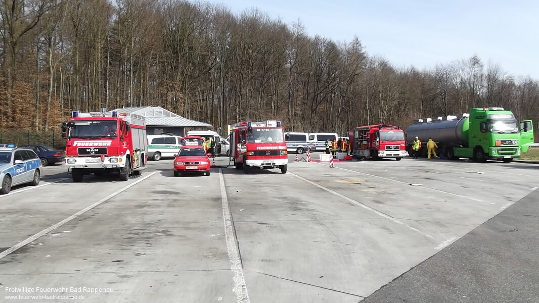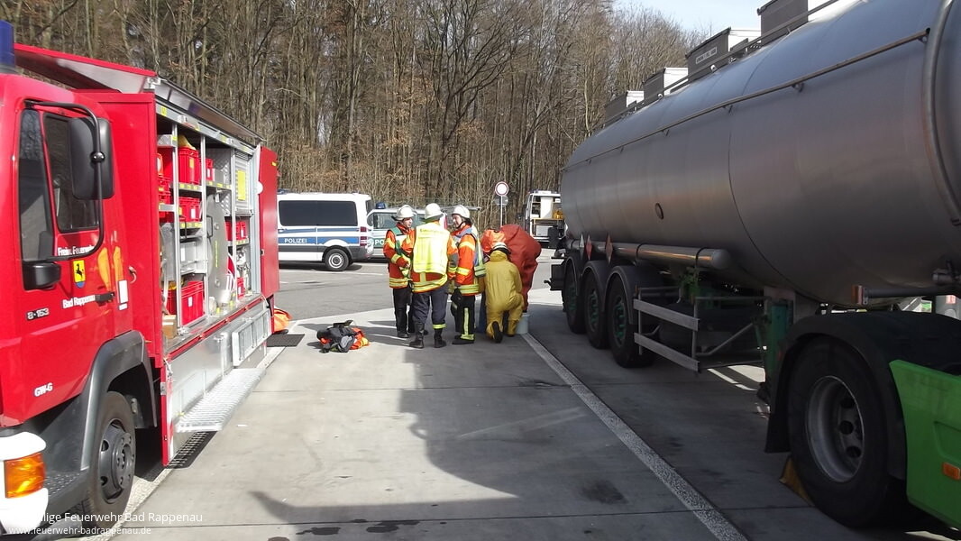 Der Gefahrgutzug und die Abteilung Bad Rappenau wurde an diesem Mittag mit dem Einsatzstichwort „Gefahrguteinsatz A6 Parkplatz Bauernwald“ alarmiert. Eine erste Rücksprache mit der Integrierten Leitstelle ergab, dass bei einer groß angelegten Polizeikontrolle an einem Tankfahrzeug ein Leck festgestellt wurde, aus dem Gefahrgut auf den Parkplatz tropft.Vor Ort stellte sich für den ausgerückten Gefahrgutzug folgende Lage da: Das mit Cyclohexylamid beladene Tankfahrzeug verlor mit einer Tropfrate von 2-3 Tropfen pro Minute Ladung. Da es sich hierbei um eine ätzende Lauge handelt, wurde ein Trupp unter CSA zum Auffangen der Flüssigkeit mittels Wannen eingesetzt. Parallel hierzu wurde durch einen weiteren Trupp der Dekon-Platz vorbereitet und betrieben, außerdem wurde der Brandschutz sicher gestellt und die Temperatur aufgrund des geringen Flammpunktes des Stoffes per Fernthermometer überwacht.Die eingetroffene Fachberaterin Chemie des Landkreises stellte nach Rücksprache mit dem Einsatzleiter und der Polizei keine weiteren Gefahren für Mensch und Umwelt fest. Da sich die Leckage am LKW jedoch nicht abdichten ließ, wurde über die Spedition ein zweiter Tanklastzug an die Einsatzstelle angefordert, um die Ladung umzupumpen. Diese Arbeiten konnten jedoch erst am nächsten Tag durchgeführt werden, daher wurde der Parkplatz durch die Polizei über Nacht gesperrt.Für die Feuerwehr Bad Rappenau, welche mit 28 Mann im Einsatz war, konnte der Einsatz nach ca. 2 Stunden beendet werden.