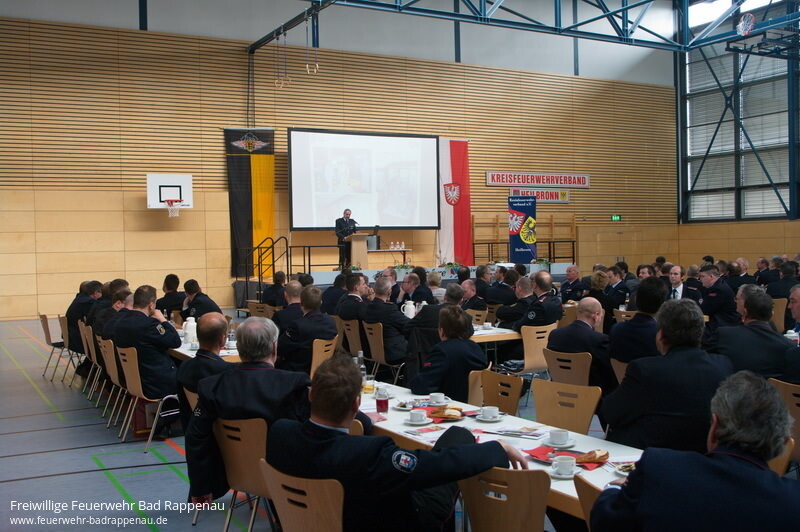 Landrat Detlef Piepenburg dankte den Feuerwehren im Landkreis in seinem Grußwort zur Dienstversammlung in der Neudenauer Sturmfederhalle für das erbrachte Engagement. Im Durchschnitt müssen im Landkreis 9 Einsätze pro Tag bewältigt werden. „Wir haben starke Wehren, die einen großen Wert auf eine gute Ausbildung legen“, so Piepenburg. Weiter führte er aus, dass man mit einem Blickt auf den Personalstand feststellen darf: das die Frauen in den Feuerwehren angekommen sind.Mit Zahlen blickte Kreisbrandmeister Uwe Vogel auf das vergangene Jahr zurück. Dabei zeigt sich insbesondere, dass die Zahl der Mittel- und Großbrände weiter gesunken ist. Brände entwickeln sich nicht mehr so schnell zu Mittel- und Großbränden. Hier wirkt das Zusammenspiel von technischen Maßnahmen. Die Einführung der Rauchmelderpflicht und die weiterhin zunehmende Anzahl an Brandmeldeanlagen bewirken, dass Brände viel früher entdeckt werden. Das übrige tun die Feuerwehren, die sehr gute Arbeit leisten und dafür sorgen, dass sich Brände gar nicht mehr entwickeln können.Leider bleibt die A6 ein Dauerbrenner. Wiederum haben sehr viele zum teil auch schwere und schwerste Verkehrsunfälle für eine extreme Belastung für die Feuerwehren gesorgt, die diese Einsätze bewältigen mussten.Besonders erfreulich ist die Entwicklung im Personalbereich. Der Landkreis kann dem landesweiten Abwärtstrend weiterhin Paroli bieten. Noch nie gab es so viele Aktive in den Einsatzabteilungen im Landkreis. Zu verdanken ist dies zum einen der starken Nachwuchsarbeit in den Jugendfeuerwehren, aber auch immer mehr Frauen finden den Weg in die Wehren.Von 24 Anträgen auf Landesförderung von Beschaffungen konnten 13 bewilligt werden. Dabei handelt es sich um 2 Baumaßnahmen und 11 Fahrzeugbeschaffungen mit Gesamtkosten in Höhe von 3,35 Mio. Euro.Bereits zum zweiten Mal gibt es eine gemeinsame Beschaffungsaktion, an der sich alle Gemeinden beteiligen. Dadurch können alle Feuerwehrangehörigen innerhalb von zwei Jahren mit den neuen Uniformen ausgestattet werden. Neben der somit garantieren Einheitlichkeit konnte ein nicht unerheblicher Preisvorteil erzielt werden.Auch der Verbandsvorsitzende, Innenminister Reinhold Gall, bescheinigte den Feuerwehren eine guten Ausstattungsstand in Bezug auch Fahrzeuge und Gerätschaften. Er dankte den Kommunen für die zeitnahe Beschaffung der neuen Uniformen.Auch wenn das Land die Feuerwehren wieder mit erheblichen Finanzmitteln unterstützt mahnt Gall, mit Beschaffungen bedacht umzugehen. Er mahnte erneut darauf zu achten, dass das Feuerwehrgesetz klare Regelungen vorgibt, um was sich die Wehren zu kümmern haben und demzufolge auch um was sie sich nicht zu kümmern haben.Als Beispiel führte er die First Responder Gruppen an. So sinnvoll wie sie auch sein mögen, rechtlich sind sie derzeit nur unzureichend abgesichert. Aus gut unterrichteten Kreisen weiß Gall aber, das der Innenminister diese rechtliche Unsicherheit bei der anstehenden Novellierung des Feuerwehrgesetzes beseitigen will.Noch mehr als in der Vergangenheit wird die Nachwuchswerbung einen immer höheren Stellenwert einnehmen. Hier müssen mehr Anstrengungen als bisher unternommen werden. Aus diesem Grund wird der Verband die Wehren in diesem Jahr bei einem Aktionswochenende am 12. und 13. September unterstützen.