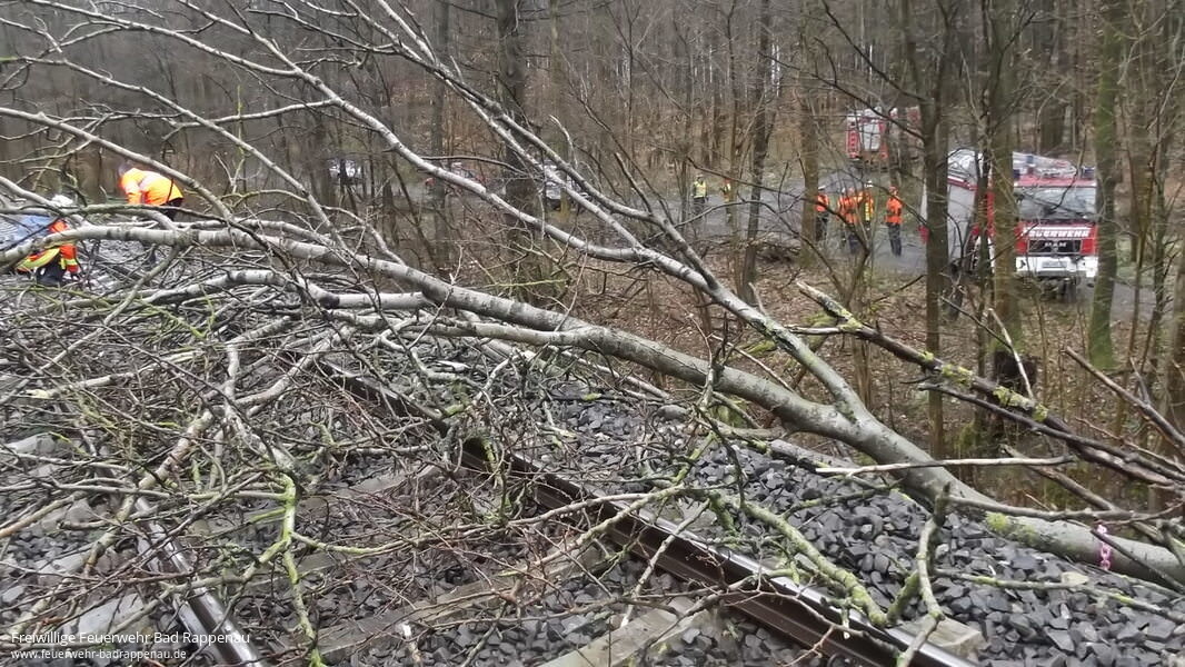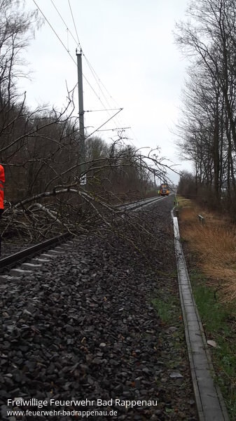 Die Abteilungen Bad Rappenau und Grombach wurden zur Bahnstrecke Bad Friedrichshall – Sinsheim alarmiert, da dort ein Baum auf die Gleise gefallen war und dabei die Oberleitung beschädigt hatte. Eine heranfahrende Stadtbahn bemerkte das Hindernis noch rechtzeitig und konnte anhalten. Nach dem Eintreffen des Notfallmanagers der Deutschen Bahn, wurde die Oberleitung geerdet und der Baum von den Gleisen geräumt. Die in der Stadtbahn wartenden Fahrgäste wurden mit Fahrzeugen der Feuerwehr zu den jeweiligen Zielbahnhöfen transportiert.