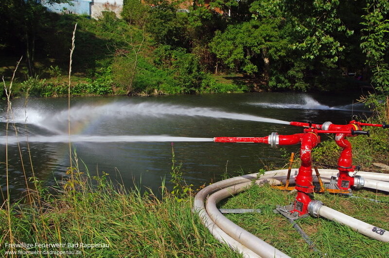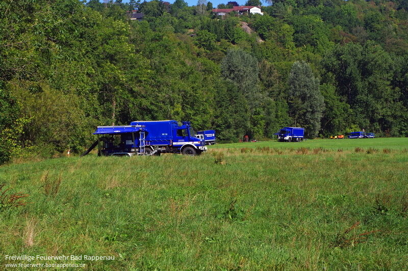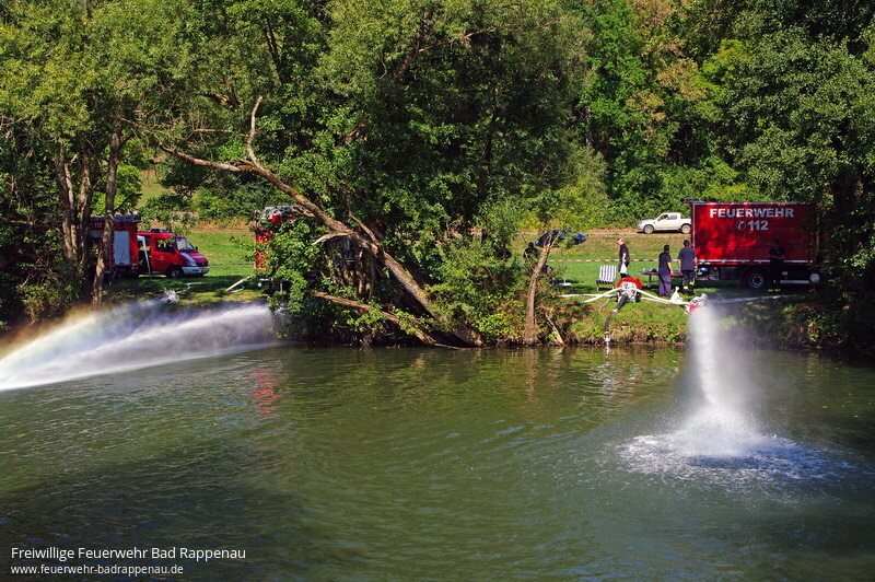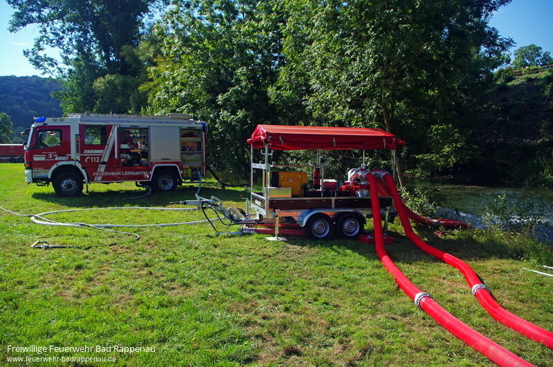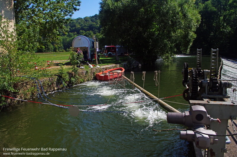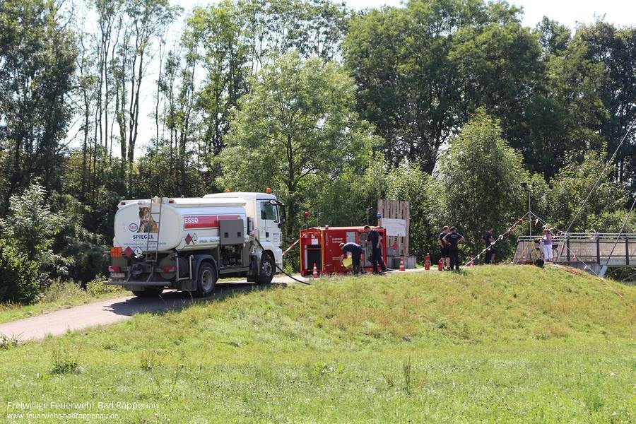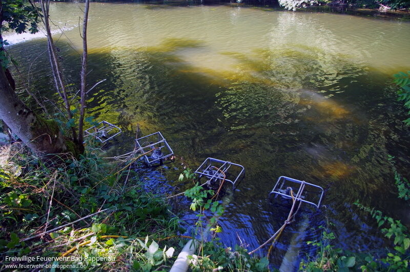 Stand: 31.08.2015 um 15 UhrSeit 11 Uhr sind die Pumpen wieder in Betrieb. Es bleibt beim bisherigen Vorgehen, dass durch Umwälzen des Wasser dieses mit Sauerstoff angereichert wird.Stand: 30.08.2015 um 18 UhrPlanmäßig wurde heute um 10 Uhr im Bereich von Jagsthausen mit den Belüftungsmaßnahmen der Jagst begonnen.An der Fußgängerbrücke zwischen Jagsthausen und Berlichingen waren zwei HFS-Pumpen (Hytrans Fire System) der Feuerwehren Karlsruhe und Stuttgart mit einer Leistung bis zu 6.000 Liter pro Minute umzuwälzen.Weiter flussabwärts folgten dann mehre THW-Einheiten mit den unterschiedlichsten Pumpensystemen. Sowohl motorbetriebene Hochwasserpumpen als auch elektrische Hochleistungspumpen waren hier im Einsatz. Dazwischen wurde mit Kompressoren Luft über perforierte Schläuche in den Fluss eingeleitet.Danach folgen noch einmal zwei HFS-Pumpen der Feuerwehren Heilbronn und Mannheim, sowie die Hochwasserpumpe der Feuerwehr Leingarten.Weiter ging es am Jagsthausener Wehr, wo die Feuerwehr Jagsthausen mit eigenen Pumpen tätig war. Hier wurde zudem durch THW-Kräfte direkt am Wehr reiner Sauerstoff über Perlatormatten eingeleitet.Bei der Kläranlage unterhalb von Jagsthausen folgten dann wieder THW-Einheiten mit diversen Pumpen.In Olnhausen waren auf dem Abschnitt oberhalb des Wehres THW-Einheiten mit elektrischen Hochleistungspumpen und die Feuerwehren Eppingen, Neckarsulm und Schwaigernmit entsprechenden Leistungsfähigen Pumpen im Einsatz.Der Abschnitt Widdern und Möckmühl war zwar vorbereitet, kam dann aber am heutigen Tag nicht mehr Einsatz.Kurz vor 16 Uhr haben die aktuellen Messungen der Ammonium-Werte auch für Experten völlig überraschend ergeben, dass das kontaminierte Wasser erst ca. 22 Stunden später als erwartete, den Landkreis erreichen wird. Zudem hat die Konzentration des gefährlichen Ammoniums bereits deutlich abgenommen. Zum einen scheinen die Maßnahmen von Feuerwehr und THW Wirkung zu zeigen, andererseits wird auch vermutet, dass Algen das Ammonium abbauen.Im Landkreis Heilbronn sind daher alle Belüftungsmaßnahmen zunächst unterbrochen und werden erst am Montag, wenn weitere Messergebnisse vorliegen, fortgesetzt.Bild 1: Wasserrückführung der HFS-SystemeBild 2: Hochwasserpumpe der Feuerwehr LeingartenBild 3: WasserverwirbelungBild 4: Landrat Piepenburg, Kreisbrandmeister Uwe Vogel, Bürgermeister Stammer (Möckmühl) sowie der Landtagsabgeordnete Dr. Lassota bei der Feuerwehr Mannheim.Bild 5: Hochleistungstauchpumpen des THWBild 6: THW-Einheiten im Bereich JagsthausenBild 7: Lufteinleitung mit Kompressor durch das THWBild 8: Einleitung von reinem SauerstoffBild 9: Innenminister Reinhold Gall bei der Feuerwehr StuttgartBild 10: Abschnitt der Feuerwehren Eppingen, Neckarsulm und SchwaigernBild 11: Wasserrückführung der HFS-SystemeBild 12: Innenminister und KFV-Vorsitzender Reinhold Gall MdL, Landrat Detlef Piepenburg und Dr. Bernhard Lasotta MdLBild 13: Ein Tankfahrzeug bringt Kraftstoff für das HFS-System (Verbrauch: ca. 30l/h) der Feuerwehr StuttgartVideo: Ein kleiner Ausschnitt aus den Belüftungsmaßnahmen von Feuerwehr und THW in Jagsthausen