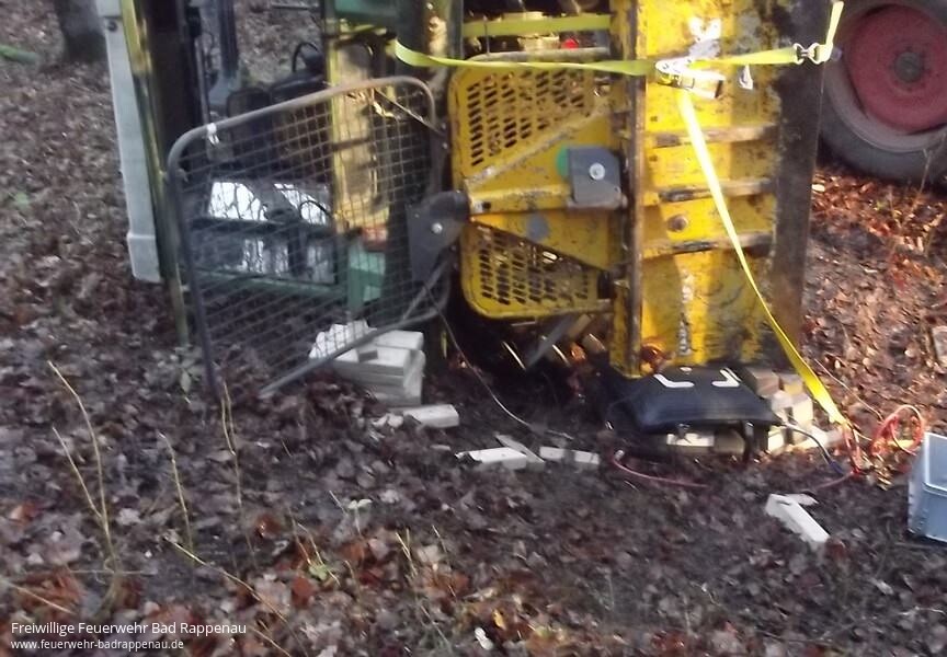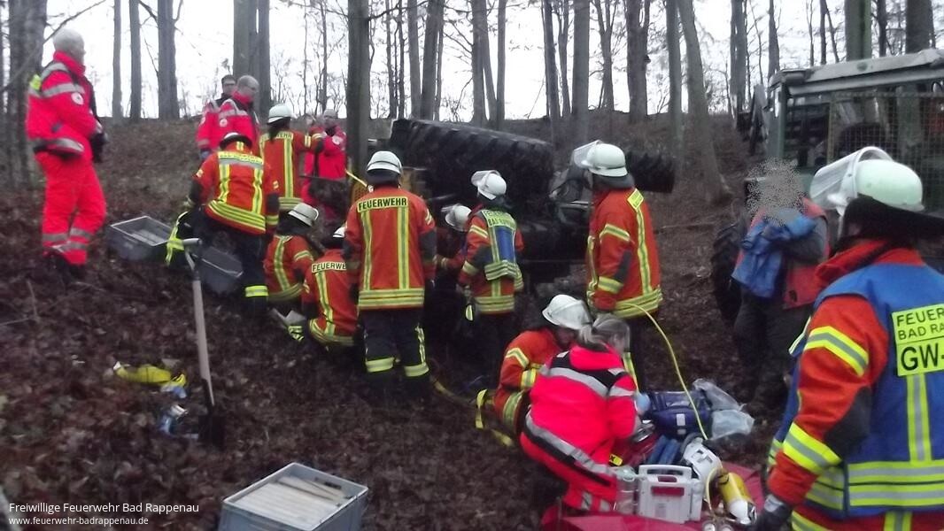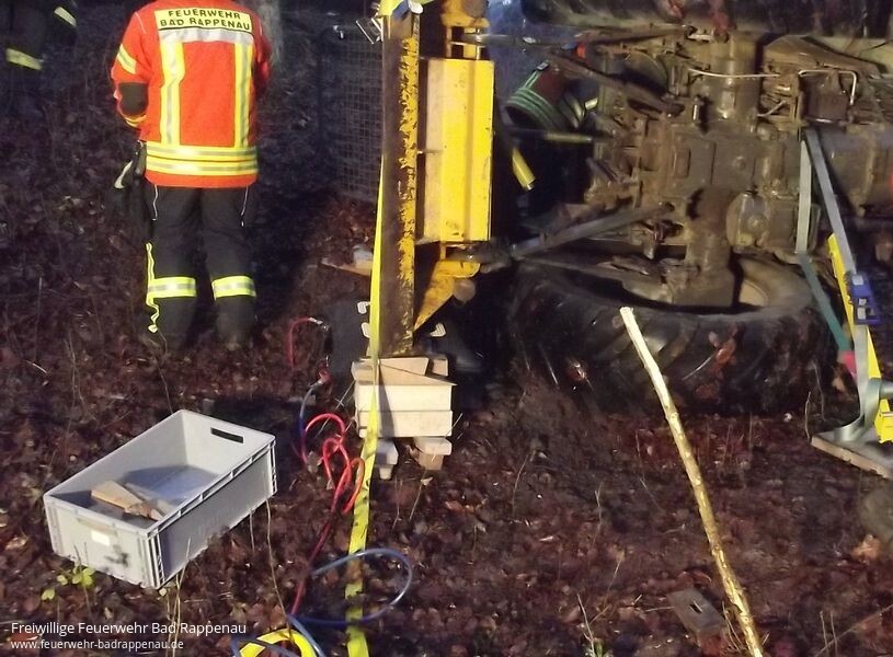 Bei Waldarbeiten geriet eine Person unter einen umgekippten Traktor. Durch die Leitstelle wurden die Abteilungen Bad Rappenau, Fürfeld und Treschklingen sowie VRW und FwK der Feuerwehr Heilbronn alarmiert. Die abgelegene Einsatzstelle konnte nur erschwert durch eine Beschreibung des Anrufers erreicht werden. Vor Ort wurde festgestellt, dass ein Arbeiter mit einem Fuß unter dem Hinterrad des Traktors eingeklemmt war. Die Einsatzkräfte begannen sofort mit der Versorgung und Betreuung des Patienten. Parallel wurde der Traktor gegen Wegrutschen gesichert und das Anheben mit Hebekissen vorbereitet. In Absprache mit dem anwesenden Notarzt wurde der Traktor angehoben und die Person befreit. Mit Rettungsbrett und Schleifkorbtrage wurde der Verletzte zum Rettungswagen transportiert.Wir bedanken uns bei den Einsatzkräften von Feuerwehr und Rettungsdienst, sowie bei der Leitstelle Heilbronn für die gute Zusammenarbeit!