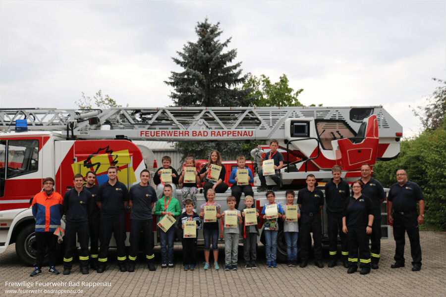 Am 12.08.2016 trafen sich 12 Kinder im Feuerwehrhaus in Bad Rappenau um ein Nachmittag bei der Feuerwehr zu verbringen. Durch Jugendwartin Jasmin Müller wurden die angemeldeten Kinder um 14:00 Uhr begrüßt. Mit dabei waren auch Kinder die bereits in Jugendgruppen der JFW aktiv sind. Jetzt stellten sich die einzelnen Betreuer den Kindern vor. Gleich darauf bekamen die Kinder einen Einblick in die persönliche Schutzausrüstung eines Feuerwehrmannes inkl. Atemschutzgerät und ABC- Schutzanzug. Anfassen war ausnahmsweise erlaubt. Eine Führung durch das Feuerwehrhaus, sowie eine Besichtigung der einzelnen Einsatzfahrzeugen der Abteilung Bad Rappenau vermittelte den Kindern einen ersten Eindruck der Vielfalt. Wer wollte durfte auch eine Einsatzjacke anprobieren. Dann durften die Kinder sich an verschiedenen Stationen austoben. Dabei musste Geschicklichkeit bewiesen werden beim Leinenbeutelzielwerfen, beim Heißen Draht, beim Golfball durch einen Schlauch bugsieren und beim Schlauchkegeln. Die Kinder mussten Mut beweisen, zumindest diejenigen die mit der Drehleiter in die Höhe fuhren. Aber was wäre die Feuerwehr wenn man nicht auch ein bisschen mit Wasser umherspritzen dürfte. Daher war natürlich eine Station ein Wasserspiel, dabei musste man Tennisbälle von Verkehrsleitkegeln herunterspritzen. Als Abschluss der Stationen durfte jeder der wollte noch bei einer Runde mit dem neuen HLF (Hilfeleistungslöschfahrzeug) mitfahren. Danach war eine Stärkung fällig. Die Kinder stärkten sich mit Würstchen im Brötchen und etwas zu Trinken. Am Ende bekamen die Kinder ihre Urkunde für die erfolgreiche Teilnahme am Ferienprogramm der Feuerwehr überreicht. Gegen 17:15 Uhr verließen uns die Kinder und Eltern mit einem zufriedenen Eindruck in den Abend.
