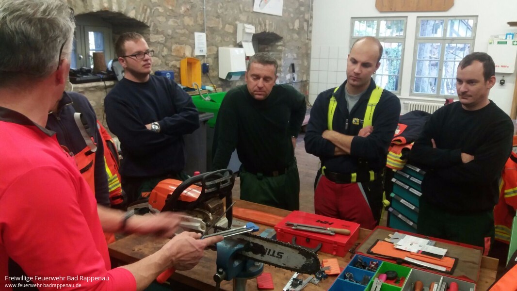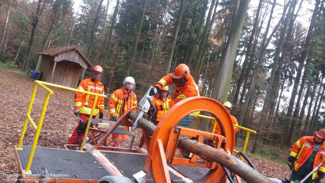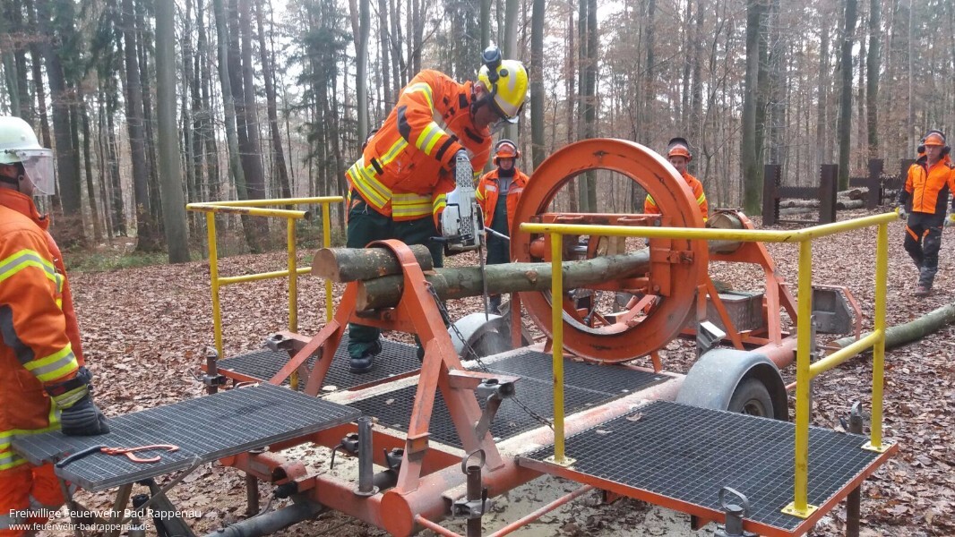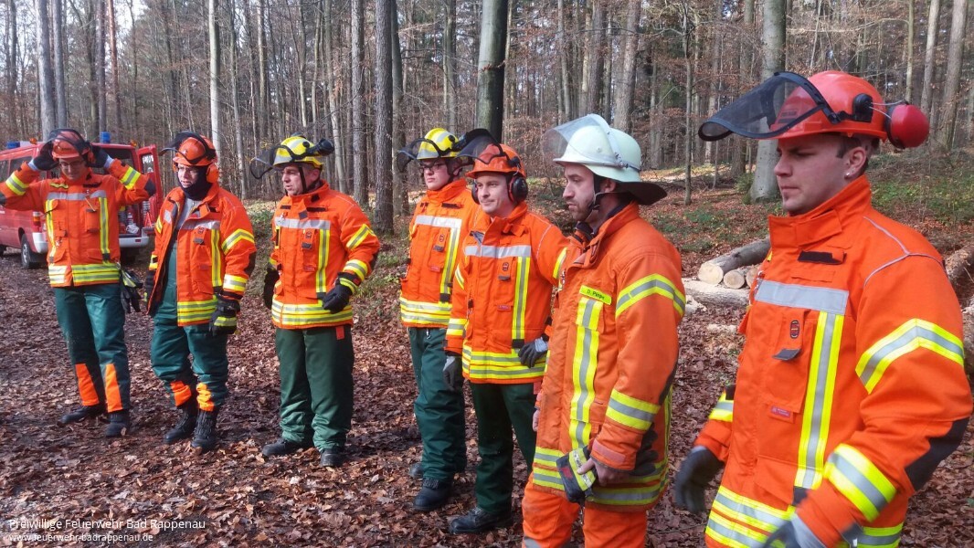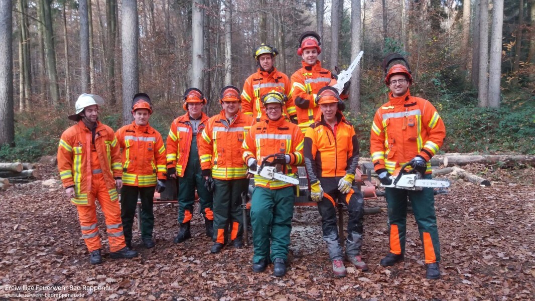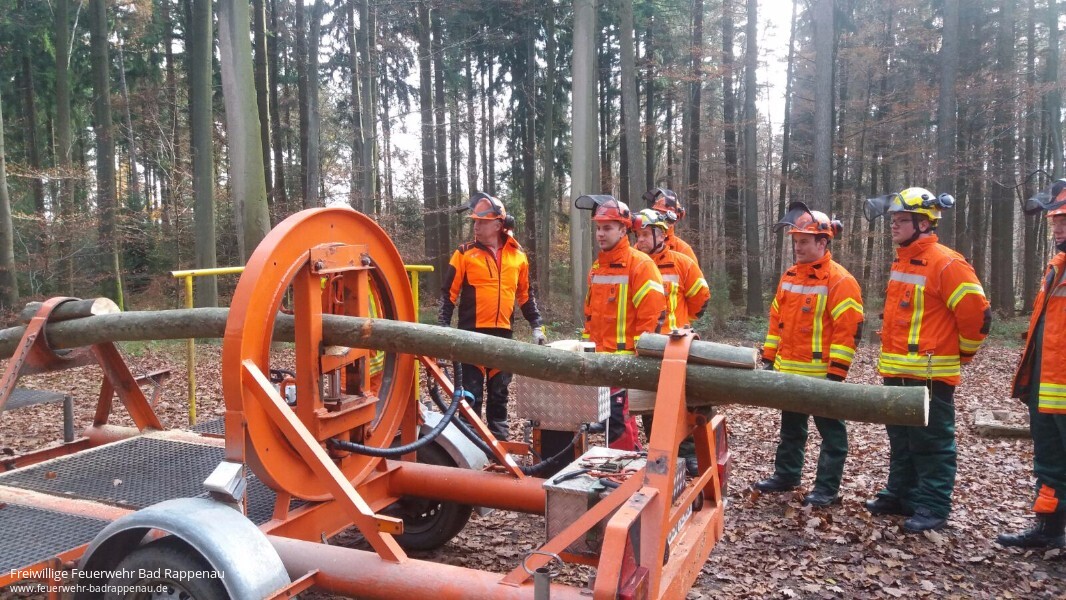 Weiterbildung ist ein wichtiges Thema in der Feuerwehr. Sich ständig mit neuem Wissen zu stärken und sein Können zu festigen um für jede mögliche Situation im Einsatzgeschehen gewappnet zu sein, sind teil der Pflichten eines jeden Feuerwehrmannes. So waren am 24. November 2016 acht Kameraden von verschiedenen Abteilungen der Feuerwehr Bad Rappenau bereit ihr bisheriges Wissen und Können rund um Sägearbeiten mit Motorsägen am Forstlichen Hauptstützpunkt Schwarzach zu erweitern. „Holz in Spannung“ stand auf dem Programm. Ziel der Weiterbildung war es unter anderem Bäume und Gehölz nach Unwettern sicher mit der Motorsäge zu bearbeiten. Des Weiteren wurden die freiwilligen Feuerwehrmänner darin geschult die gefahren von Holz in Spannung zu erkennen und dementsprechend zu handeln. Dafür wurden verschiedene Szenarien an einem Spannungssimulator dargestellt, welche dann mit verschiedenen Techniken bearbeitet wurden.