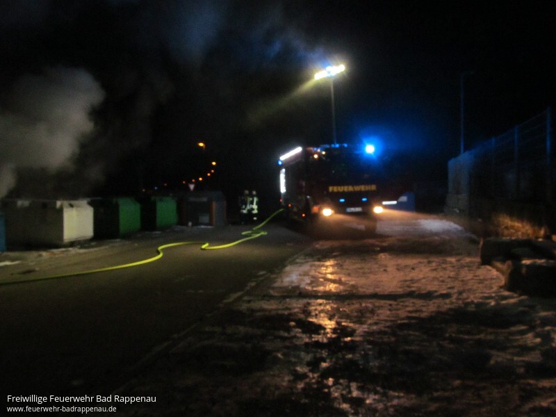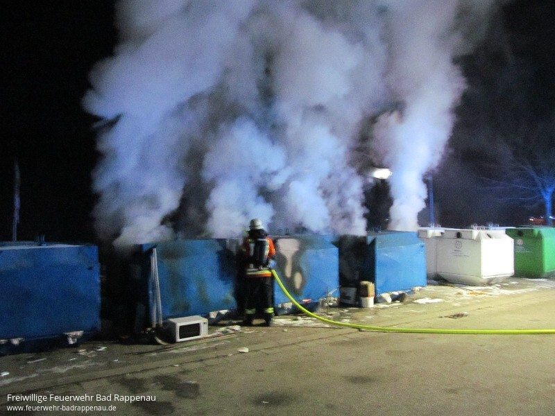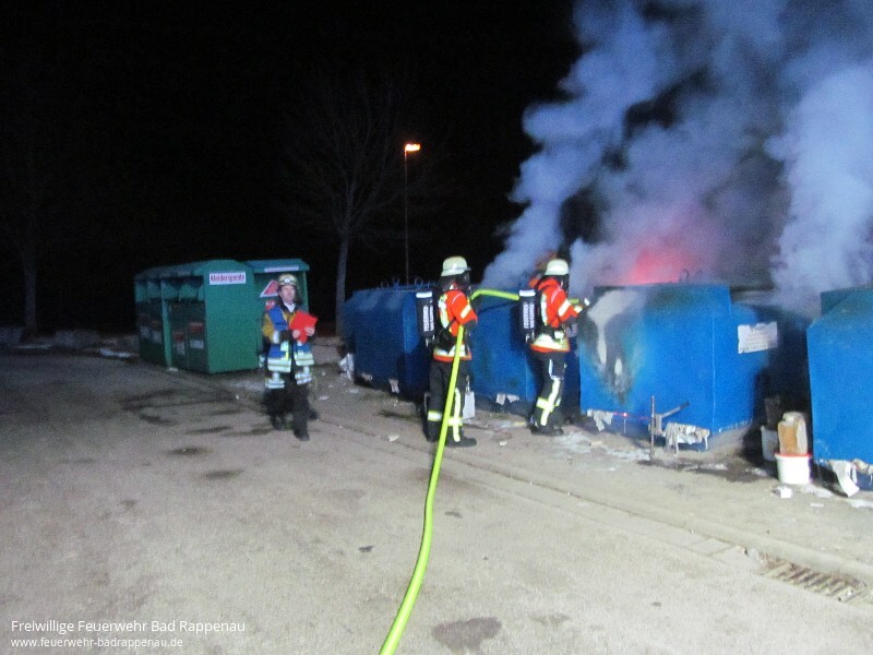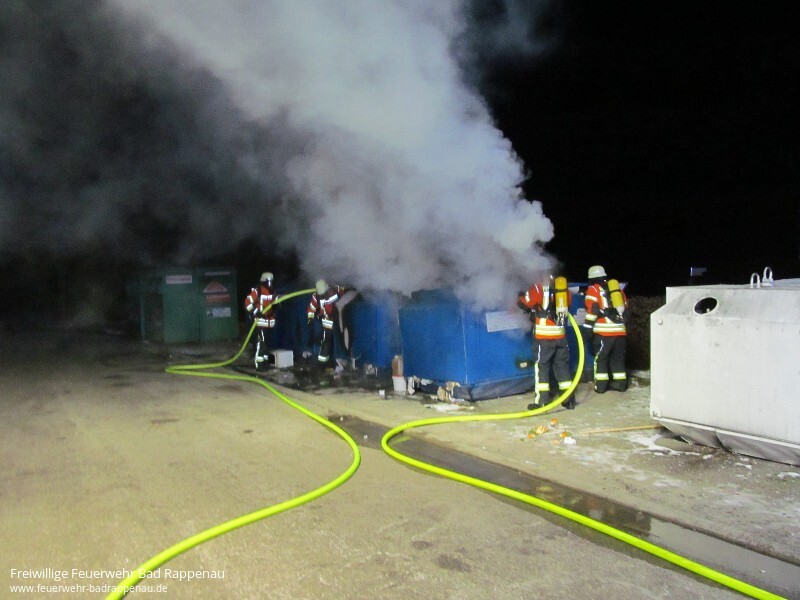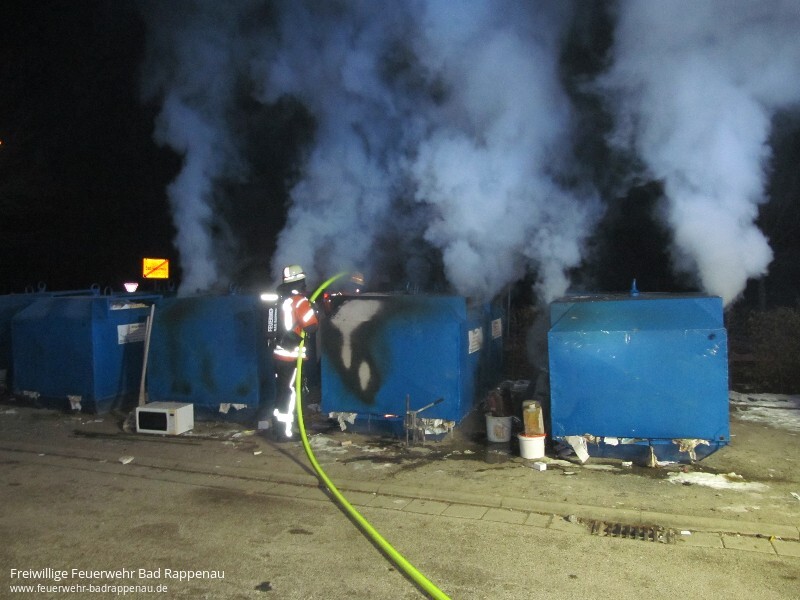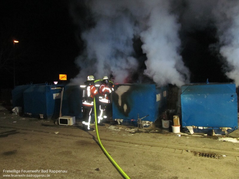 Mit dem Alarmstichwort „Kleinbrand“ wurde die Freiwillige Feuerwehr Bad Rappenau am späten Samstagabend um 22:25 Uhr alarmiert. Schon auf der Anfahrt war eine starke Rauchentwicklung zu erkennen. Beim Eintreffen der Einsatzkräfte standen fünf Altpapiercontainer im Vollbrand. Der Angriffstrupp des ersteintreffenden Fahrzeugs nahm sofort unter PA eine Schaumpistole zur Brandbekämpfung vor. Die Besatzung baute zudem eine Wasserversorgung auf. Das zweite Löschfahrzeug stellte den zweiten Angriffstrupp, welcher unter PA einen Löschangriff mit einem C-Strahlrohr vornahm. Zudem sicherte die Besatzung des zweiten Löschfahrzeuges die Einsatzstelle ab. Um zu verhindern, dass Glätte durch das Löschwasser entsteht, streute die Feuerwehr die Einsatzstelle im Nachgang ab. Die Feuerwehr Bad Rappenau war mit 3 Fahrzeugen und 18 Mann im Einsatz.