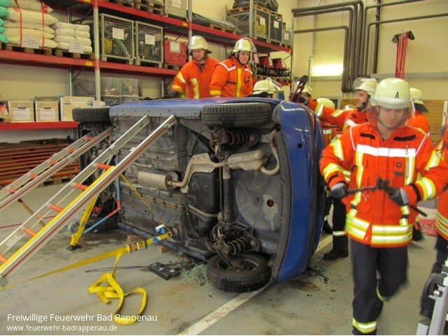 Einer der letzten Lehrgänge im Rahmen der Kreisausbildung wurde am 17. + 18.03.2017 durch die Freiwillige Feuerwehr Bad Rappenau zur Einfache technische Hilfeleistung ausgerichtet. Es ist ständig notwendig in weiteren Übungen das Erlernte zu vertiefen und somit bei Einsätzen mehr Sicherheit bei den Tätigkeiten zu gewinnen. Die wurde den Lehrgangsteilnehmer während des Lehrgangs nochmals verdeutlicht damit immer eine gesunde Heimkehr nach Übungen und Einsätzen möglich ist. Lehrgangsleiter Udo Lauer konnte 13 Teilnehmer aus den Feuerwehren Gundelsheim, Offenau und Bad Rappenau begrüßen. Die Teilnehmer wurden in den Themengebieten rechtliche Grundlagen, das Einsatzablaufschema, die Absicherung der Einsatzstelle sowie Fahrzeugkunde unterwiesen. Unterstützt wurde Udo Lauer von den Ausbilder Jürgen Seel und Conrad Wagenbach.Durch die Teilnehmer wurden während des Lehrgangs mehrere PKW zerlegt. Am ersten Fahrzeug wurde der gesamten Gruppe die Vorgehensweise bei der technischen Hilfeleistung demonstriert. Praxisarbeit wurde im Lehrgang groß geschrieben, denn nur das Gezeigte bleibt dauerhaft im Gedächtnis haften. Alle Teilnehmer schlossen die ihnen gestellten Übungen mit dem größtmöglichen Erfolg ab und konnten mit einem guten Gefühl wieder in ihre Abteilungen zurückkehren um das Gelernte dort umzusetzen. Die Ausbilder bedankten sich bei allen Lehrgangsteilnehmern recht herzlich, denn nur durch ihre hohe Motivation und die Konzentration war es möglich, die Ausbildung in der vorgegebenen Zeit durchzuführen. Daher war es auch möglich am Samstag die Mittagspause für ein gemeinsames Essen. An dieser Stelle möchte die Führungsmannschaft der Feuerwehr Bad Rappenau allen Teilnehmer einen herzlichen Glückwunsch zur erfolgreichen Lehrgangsteilnahme aussprechen. Es wäre schön, sich wieder einmal bei einem Lehrgang oder einer kameradschaftlichen Veranstaltung zu sehen.Mit Erfolg teilgenommen haben:Czemmel, Niklas – GundelsheimGläßer, Christoph – OffenauGroße, Sven – FürfeldHaffelder, Sebastian – ObergimpernHertlein, Rene – BonfeldKaufmann, Sven – GundelsheimKirbach, Julian – GundelsheimKlotzbücher, Marco – OffenauLange, Selina – WollenbergLast, Julian – GrombachNägelein, Felix – HeinsheimSchäfer, Adrian – BonfeldWill, Florian – Bonfeld