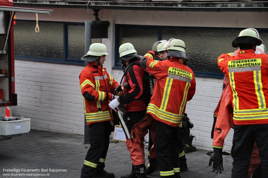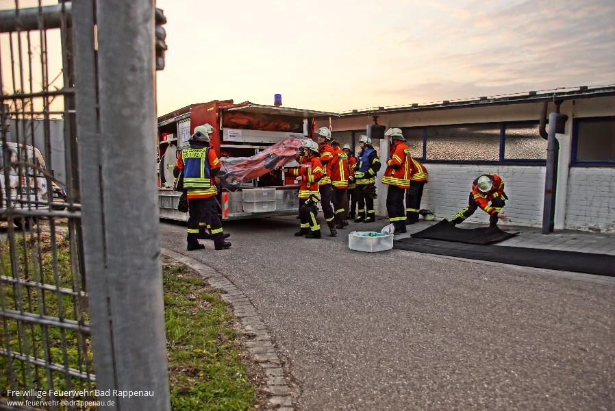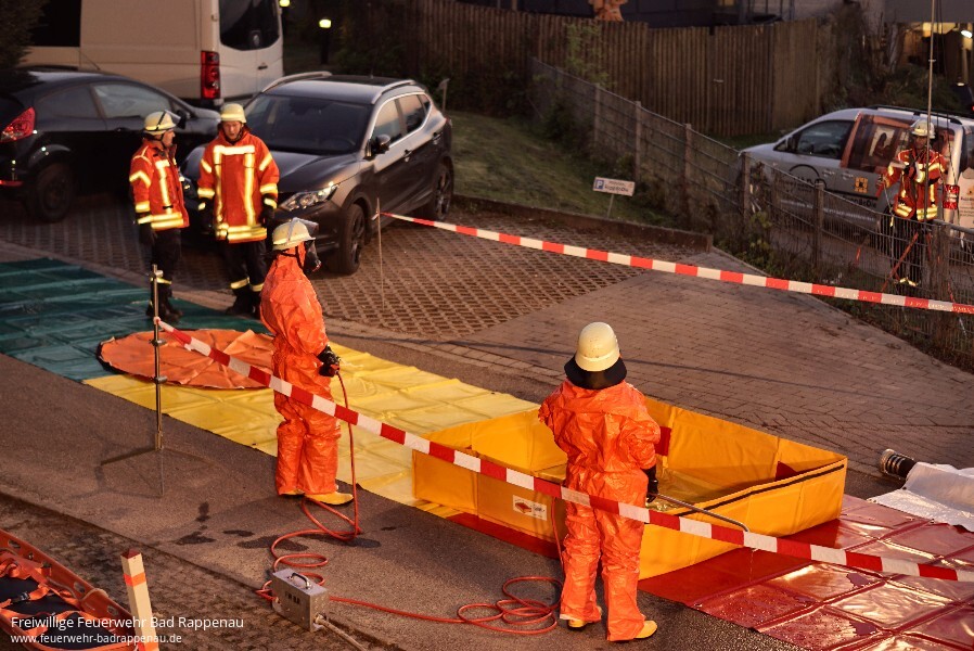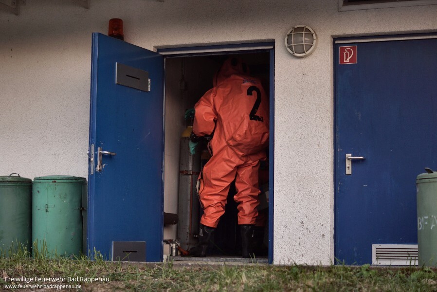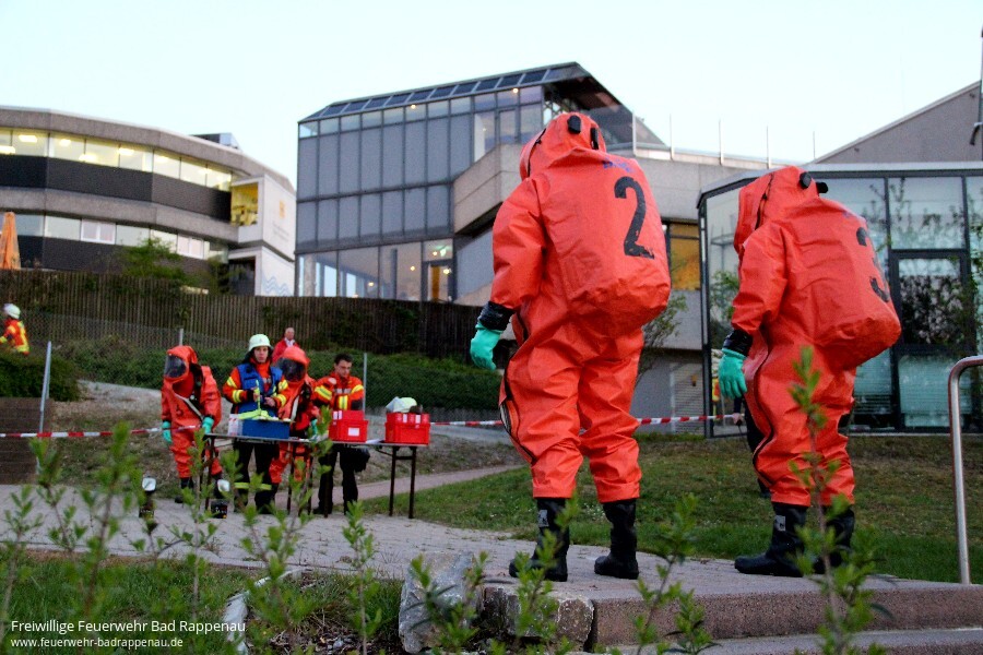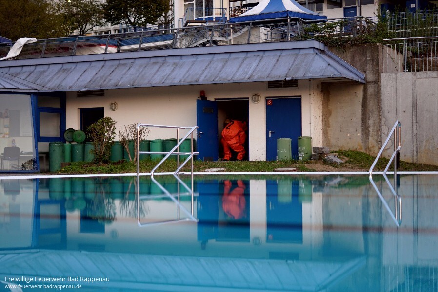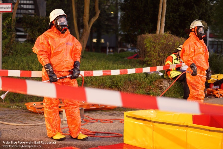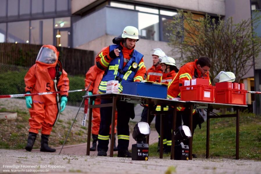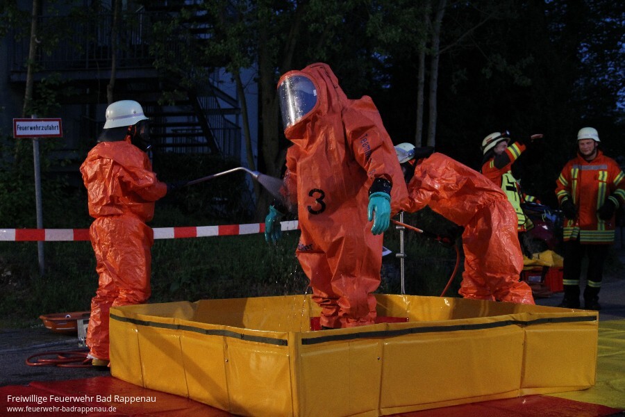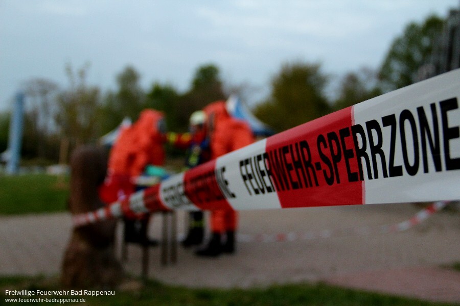 Am Freitag, den 21. April führte die Abteilung Bad Rappenau eine Gefahrgutübung gemeinsam mit der Abteilung Babstadt durch. Das Szenario sah wie folgt aus:Eine Chlorgasflasche des Freibads hatte ein Leck, wodurch eine erhebliche Menge Chlorgas ausströmte. Im Freibad befanden sich keine Personen mehr. Die Einsatzkräfte wurden über Funk von Übungsleiter Conrad Wagenbach abgerufen. Die Feuerwehr Bad Rappenau fuhr mit 5 Fahrzeugen über den oberen Eingang des Freibades an die Einsatzstelle heran. Zwei Trupps rüsteten sich direkt nach dem Eintreffen mit Hilfe der Besatzung des Gerätewagen-Gefahrgut mit Chemikalienschutzanzügen aus. Ein Trupp sollte das Leck beseitigen, der andere Trupp diente als Sicherungstrupp. Währenddessen bereiteten die Kameraden aus Babstadt den sogenannten „Dekontaminationsplatz“ vor, welcher dazu dient, die aus dem Gefahrenbereich zurückkehrenden Einsatzkräfte zu dekontaminieren, sowie die Schutzanzüge sicher zu verpacken. Die Besatzung des Rüstwagens kümmerte sich um die Beleuchtung der Einsatzstelle. Fiktiv entschieden sich die Führungskräfte dazu, den Kurpark zu evakuieren, da das austretende Chlorgas sich in diese Richtung ausbreitete. Um den Bereich des Freibades wurde eine Absperrgrenze errichtet. Am Zugang zum Gefahrenbereich besprachen die Führungskräfte ihr weiteres Vorgehen. Mit einem speziellen Abdichtungsset gelang es dem Trupp, das Leck zu schließen. Der Trupp führte noch Belüftungsmaßnahmen durch und konnte dann zur Dekontamination.Anschließend wurde das ganze Szenario noch einmal mit der gesamten Mannschaft besprochen und durchgegangen. Der Ablauf der Übung konnte durchweg positiv bewertet werden.Wir bedanken uns beim Bäderbetreiber Rappsodie für die tolle Übungsmöglichkeit.