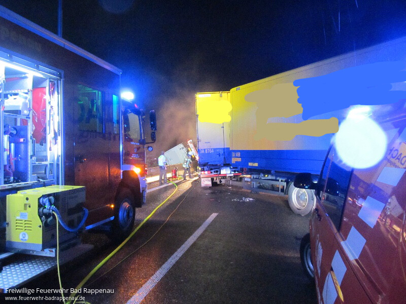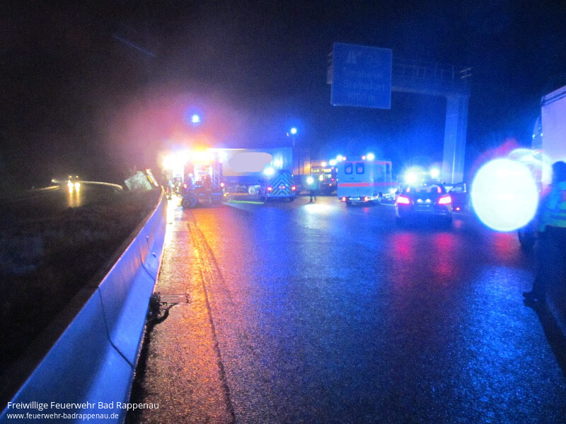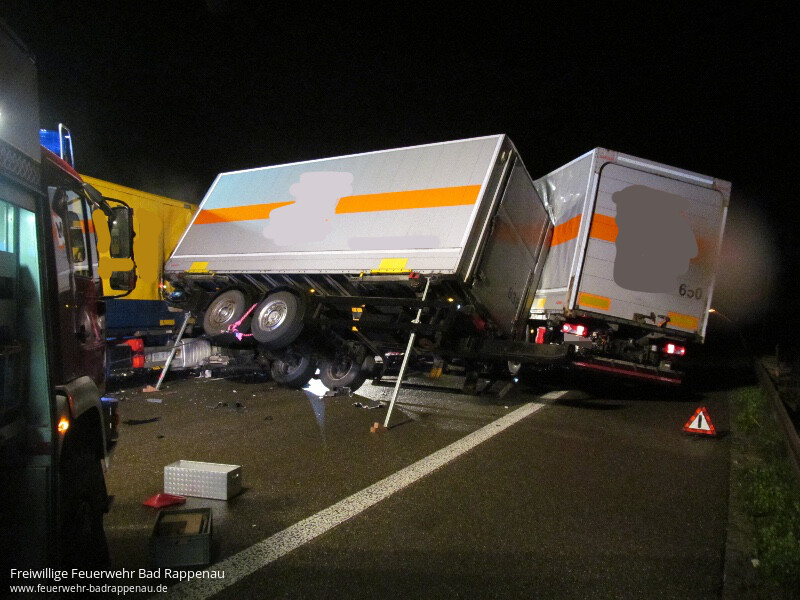 Mit dem Alarmstichwort „Verkehrsunfall LKW“ wurden die Feuerwehren Bad Rappenau und Heilbronn in den frühen Morgenstunden auf die A6 in Fahrtrichtung Mannheim alarmiert.Kurz vor der Ausfahrt Sinsheim-Steinsfurt kam ein Fahrzeug mit Segelfluganhänger ins Schleudern und kam mitten auf der Fahrbahn zum Stehen. Ein LKW-Fahrer kam hinzu und sicherte die Unfallstelle ab. Ein anderer LKW-Fahrer wollte links an der Unfallstelle vorbeifahren und wurde hierbei von einem weiteren LKW erfasst. Durch den Aufprall wurde der Anhänger des LKWs über die Betonleitwand geschleudert. Der auffahrende LKW-Fahrer wurde hierbei in seinem Führerhaus eingeschlossen. Unter Absprache mit dem Notarzt vor Ort befreiten die Einsatzkräfte den Fahrer mit hydraulischem Rettungsgerät. Die Feuerwehr kümmerte sich außerdem um den Brandschutz, die Verkehrsabsicherung sowie die Ausleuchtung der Einsatzstelle. Die Bergung der LKW-Wracks führten zwei Abschleppunternehmen durch.Die Feuerwehr Bad Rappenau war mit 25 Mann und 5 Fahrzeugen im Einsatz.Da alle Fahrspuren durch die verunglückten LKW blockiert waren, konnten die Einsatzkräfte erst nach 3 Stunden die Autobahn verlassen. Auch die Anfahrt war für die Einsatzfahrzeuge nicht leicht: Da keine Rettungsgasse gebildet wurde, verzögerte sich die Rettung erheblich. Selbst nachrückende Fahrzeuge konnten nicht bis zur Einsatzstelle gelangen, da die Lücken im Stau durch Drängler sofort wieder verschlossen wurden.