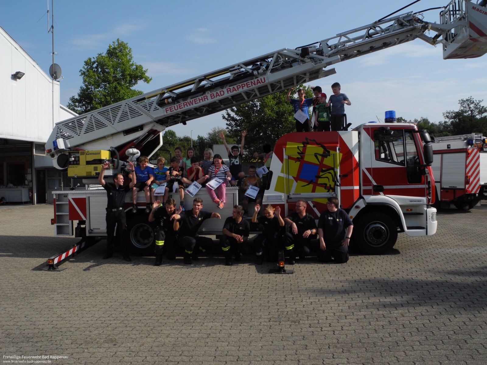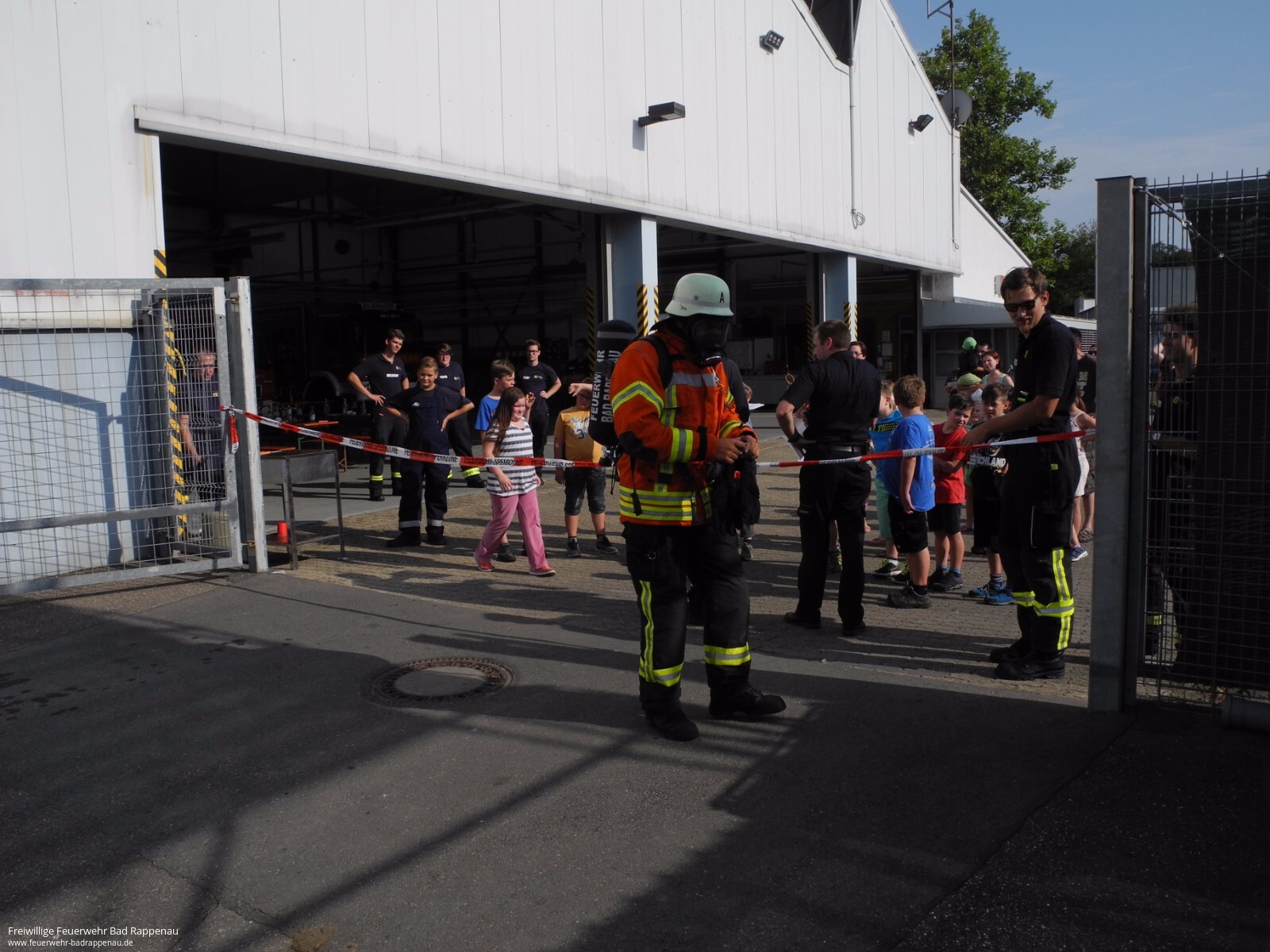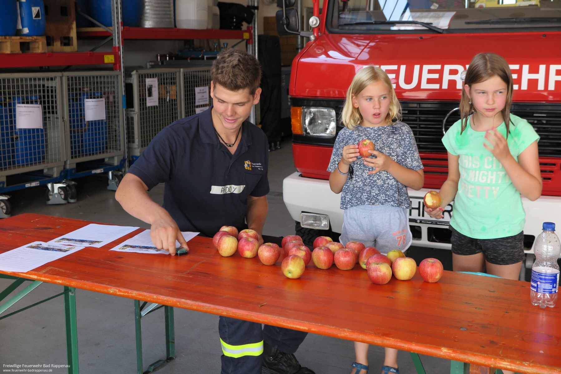 Am 25. August 2017 trafen sich 15 interessierte Kinder in der Feuerwehr Bad Rappenau im Rahmen des Kinderferienprogramms.Nach einer kurzen Begrüßung wurde den Kindern die persönliche Schutzausrüstung gezeigt, das Atemschutzgerät erklärt und vorgeführt wie man alles richtig anlegt.Danach wurden in Gruppen die Fahrzeuge und das Feuerwehrhaus der Abt. Bad Rappenau besichtigt.An weiteren 8 Stationen konnte man sein technisches und motorisches Geschick beim spielerischen Einsatz von Feuerwehrgeräten unter Beweis stellen.An einer Station, welche besonders lustig war, mussten die Kinder mit dem Mund einen Apfel aus einer Wasserschüssel holen. Hier blieb niemand trocken.Um Geschicklichkeit ging es auch beim Leinenbeutelzielwerfen, Schlauchkegeln oder als unsere kleinen Besucher versuchten einen aufgeblasenen Wasserball eine Steckleiter hochzuspritzen.Absolutes Highlight war wieder die Fahrt mit der Drehleiter.Nach dem gemeinsamen Essen der gegrillten Würstchen gab es für die Kinder und Ihre Eltern noch eine kleine Vorführung einer Fettexplosion.Hier war für alle beeindruckend zu sehen was passieren kann wenn man brennendes Fett versucht mit Wasser zu löschen.Glücklich und mit einer Urkunde über die Teilnahme beim Kinderferienprogramm bei der Feuerwehr verließen uns die Kinder 3 Stunden später dann wieder.