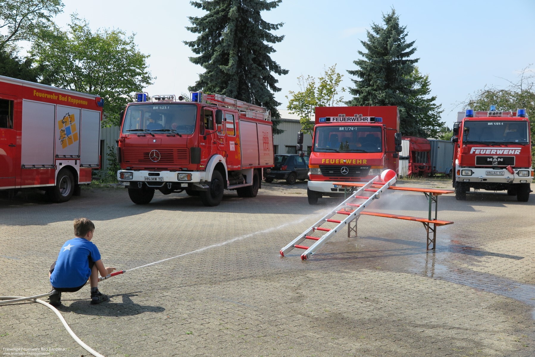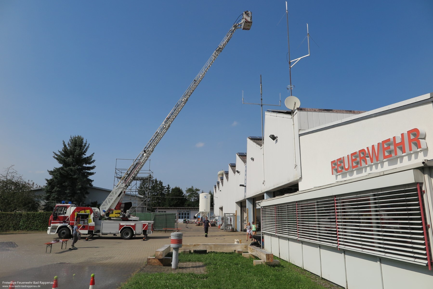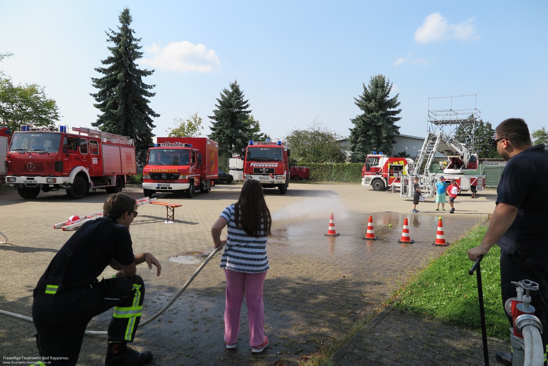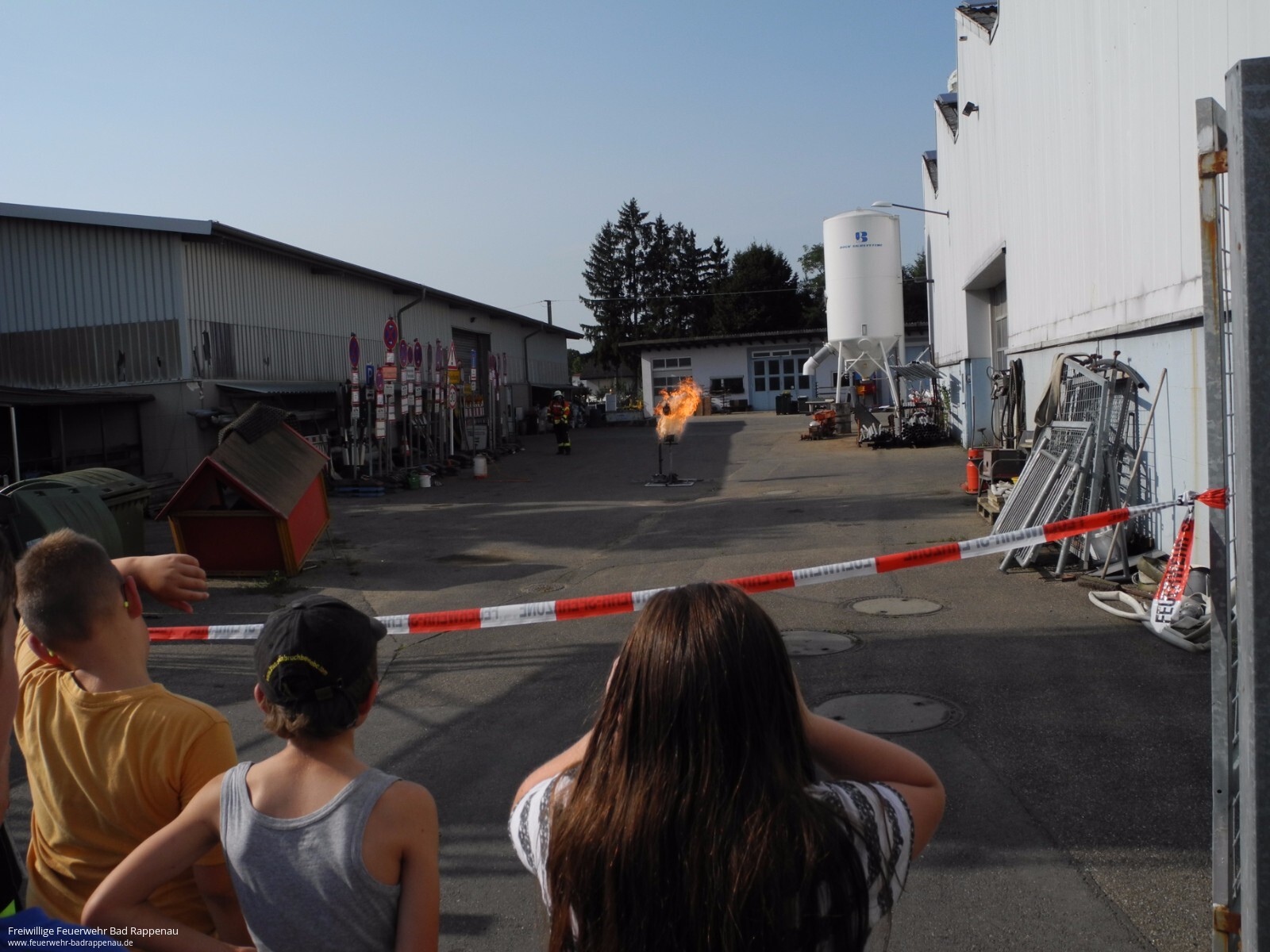 Am 25. August 2017 trafen sich 15 interessierte Kinder in der Feuerwehr Bad Rappenau im Rahmen des Kinderferienprogramms.Nach einer kurzen Begrüßung wurde den Kindern die persönliche Schutzausrüstung gezeigt, das Atemschutzgerät erklärt und vorgeführt wie man alles richtig anlegt.Danach wurden in Gruppen die Fahrzeuge und das Feuerwehrhaus der Abt. Bad Rappenau besichtigt.An weiteren 8 Stationen konnte man sein technisches und motorisches Geschick beim spielerischen Einsatz von Feuerwehrgeräten unter Beweis stellen.An einer Station, welche besonders lustig war, mussten die Kinder mit dem Mund einen Apfel aus einer Wasserschüssel holen. Hier blieb niemand trocken.Um Geschicklichkeit ging es auch beim Leinenbeutelzielwerfen, Schlauchkegeln oder als unsere kleinen Besucher versuchten einen aufgeblasenen Wasserball eine Steckleiter hochzuspritzen.Absolutes Highlight war wieder die Fahrt mit der Drehleiter.Nach dem gemeinsamen Essen der gegrillten Würstchen gab es für die Kinder und Ihre Eltern noch eine kleine Vorführung einer Fettexplosion.Hier war für alle beeindruckend zu sehen was passieren kann wenn man brennendes Fett versucht mit Wasser zu löschen.Glücklich und mit einer Urkunde über die Teilnahme beim Kinderferienprogramm bei der Feuerwehr verließen uns die Kinder 3 Stunden später dann wieder.