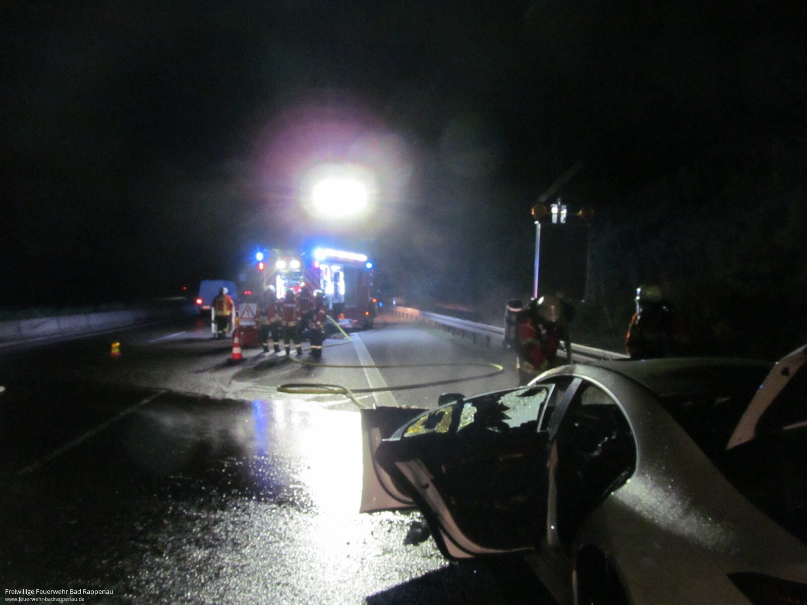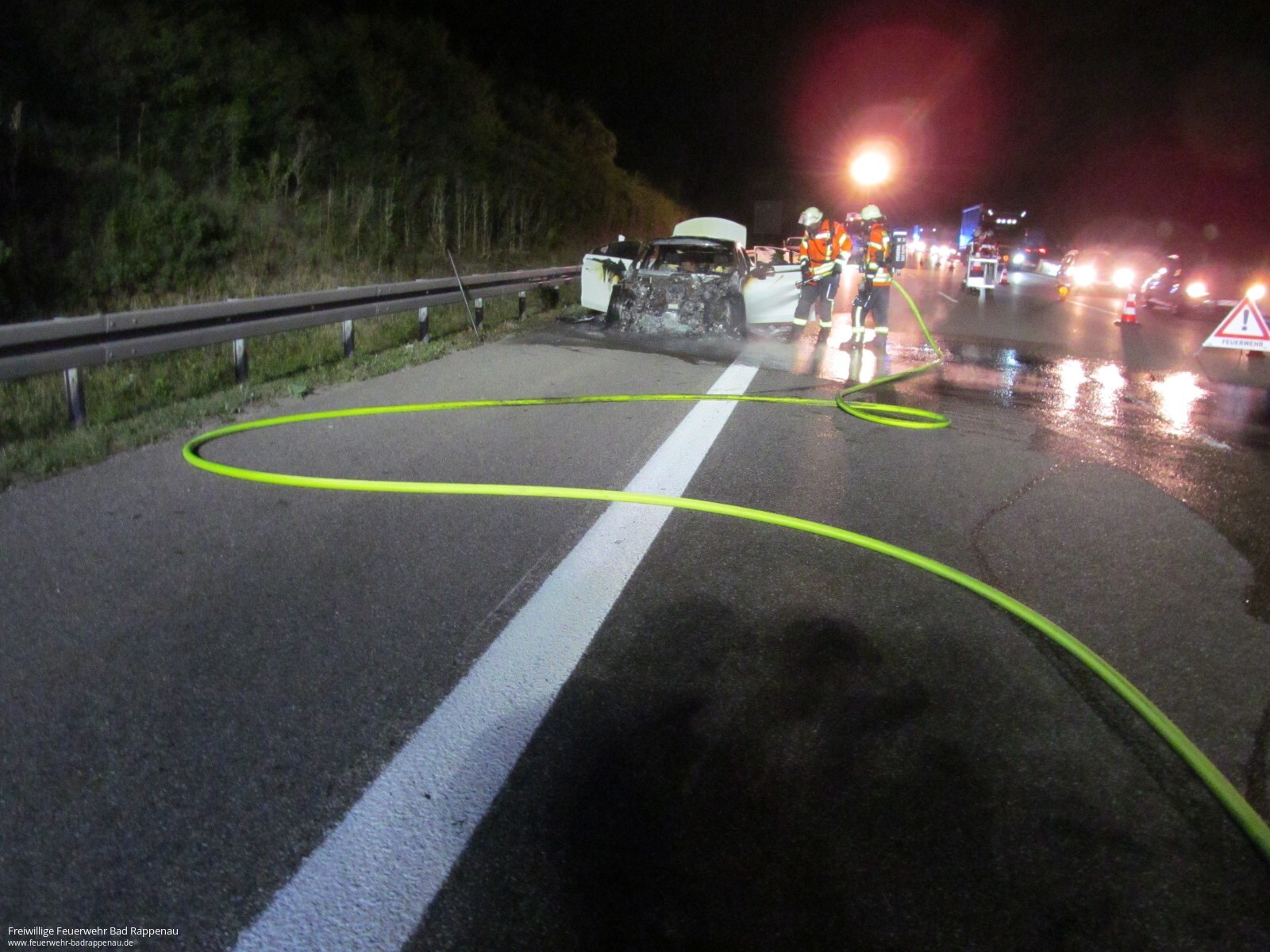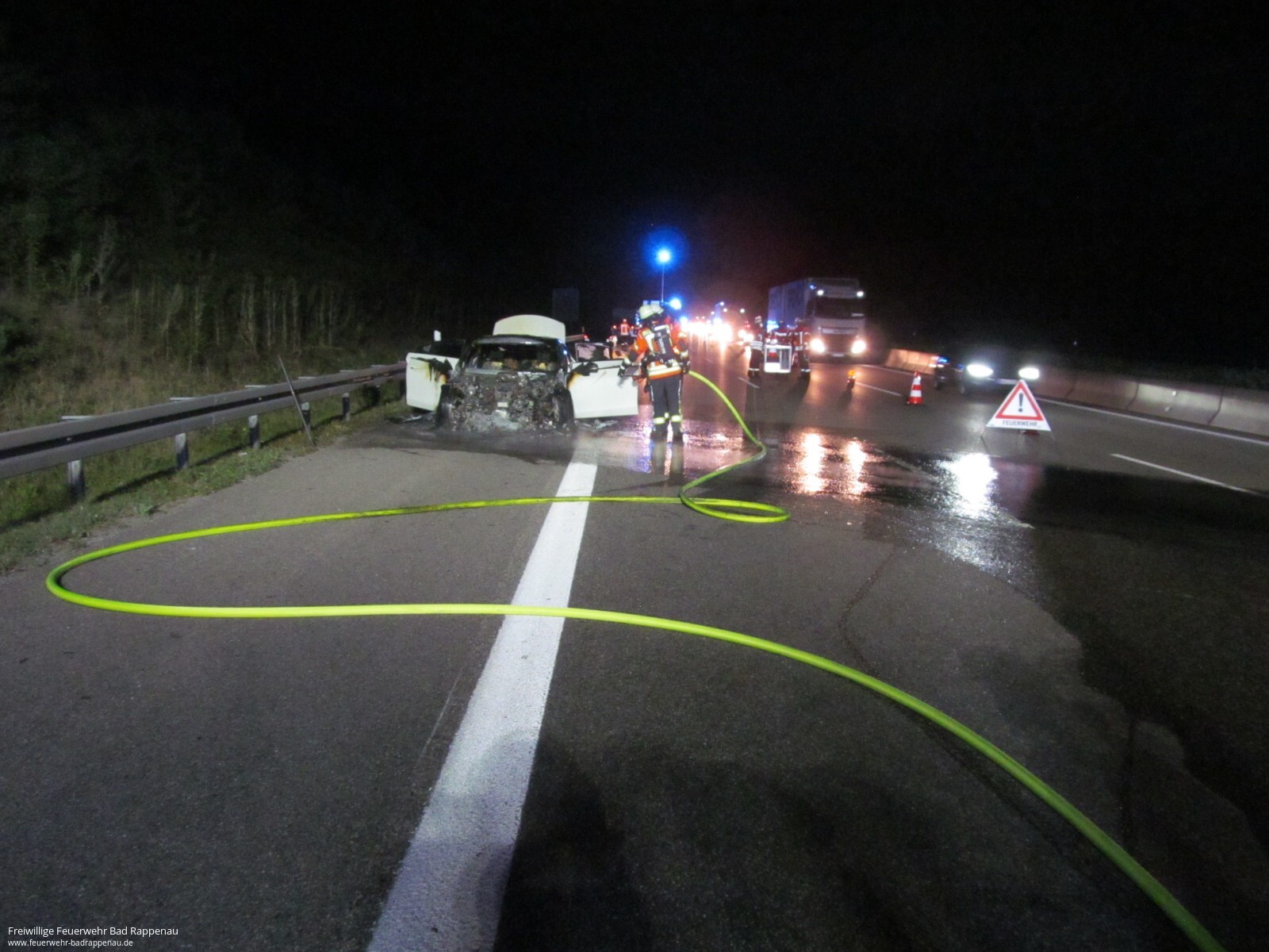 Mit dem Alarmstichwort „PKW Brand“ wurde die Abteilung Bad Rappenau auf die A6 in Fahrtrichtung Sinsheim alarmiert. Kurz vor der Ausfahrt kam es zu einem Verkehrsunfall mit drei beteiligten PKW. Dabei fing ein PKW Feuer. Die Feuerwehr begann unverzüglich mit einem C-Strahlrohr mit der Brandbekämpfung. Der Brand konnte schnell abgelöscht werden. Die weiteren Aufgaben waren das Ausleuchten der Einsatzstelle sowie die Verkehrssicherung. Verletzt wurde niemand. Die Freiwillige Feuerwehr Bad Rappenau war mit 5 Fahrzeugen und 18 Mann im Einsatz.