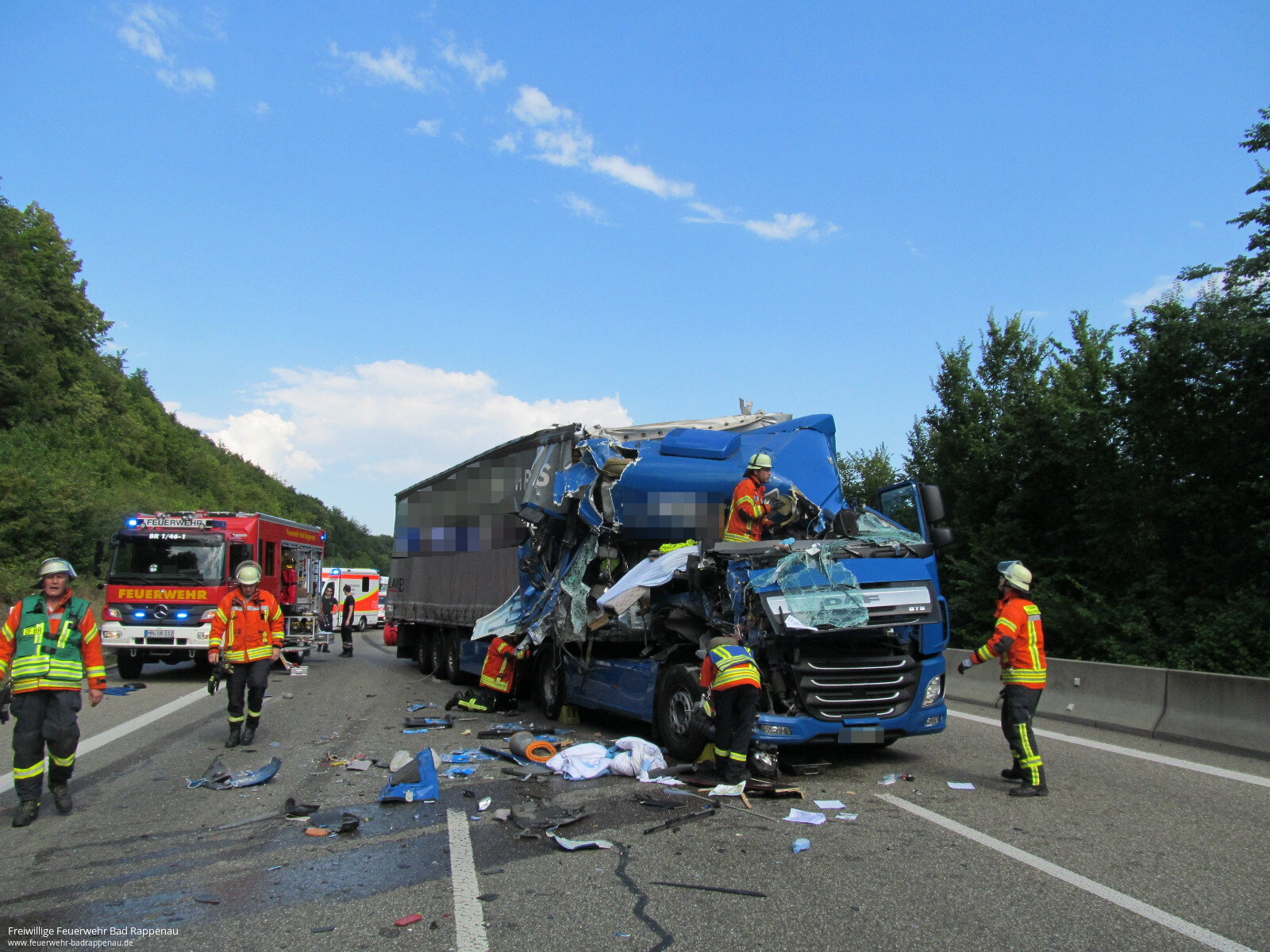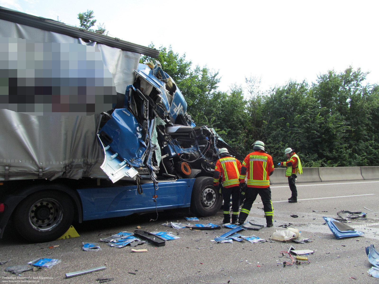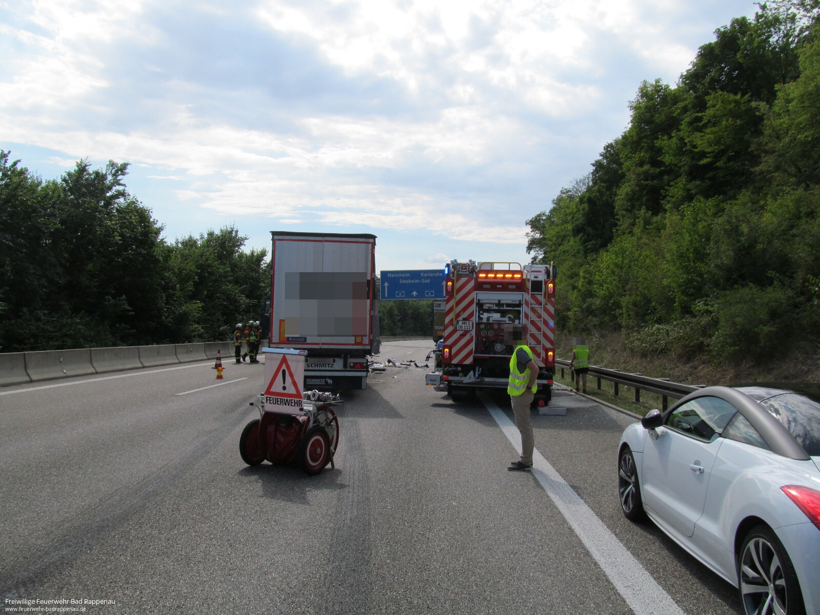 Mit dem Alarmstichwort „Hilfeleistung RD“ wurde die Freiwillige Feuerwehr Bad Rappenau auf die A6 in Fahrtrichtung Sinsheim alarmiert. Kurz vor der Ausfahrt Steinsfurt kam es zu einem Unfall mit 2 beteiligten LKW. Die Aufgaben der Feuerwehr beschränkten sich auf die Verkehrsabsicherung, das Abklemmen der Batterie sowie das Aufnehmen von Betriebsstoffen. Die Abteilung Bad Rappenau war mit 4 Fahrzeugen und 13 Mann im Einsatz.