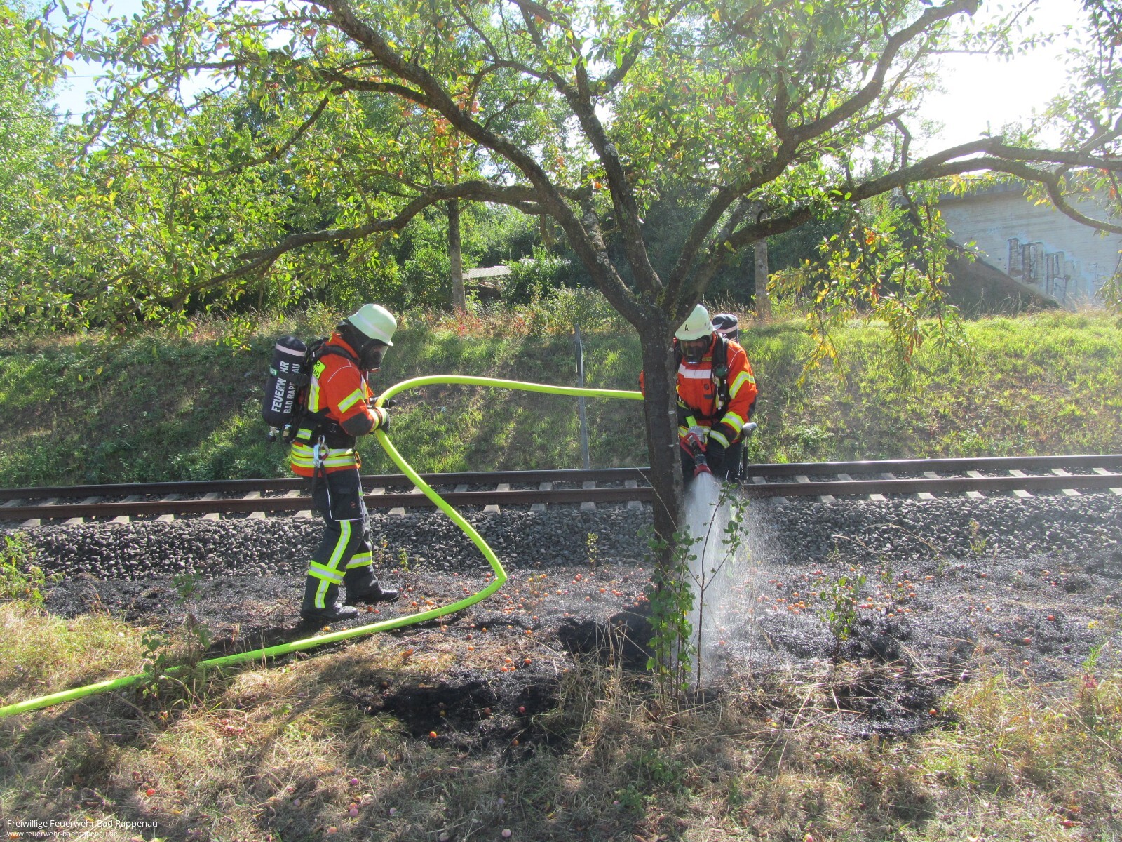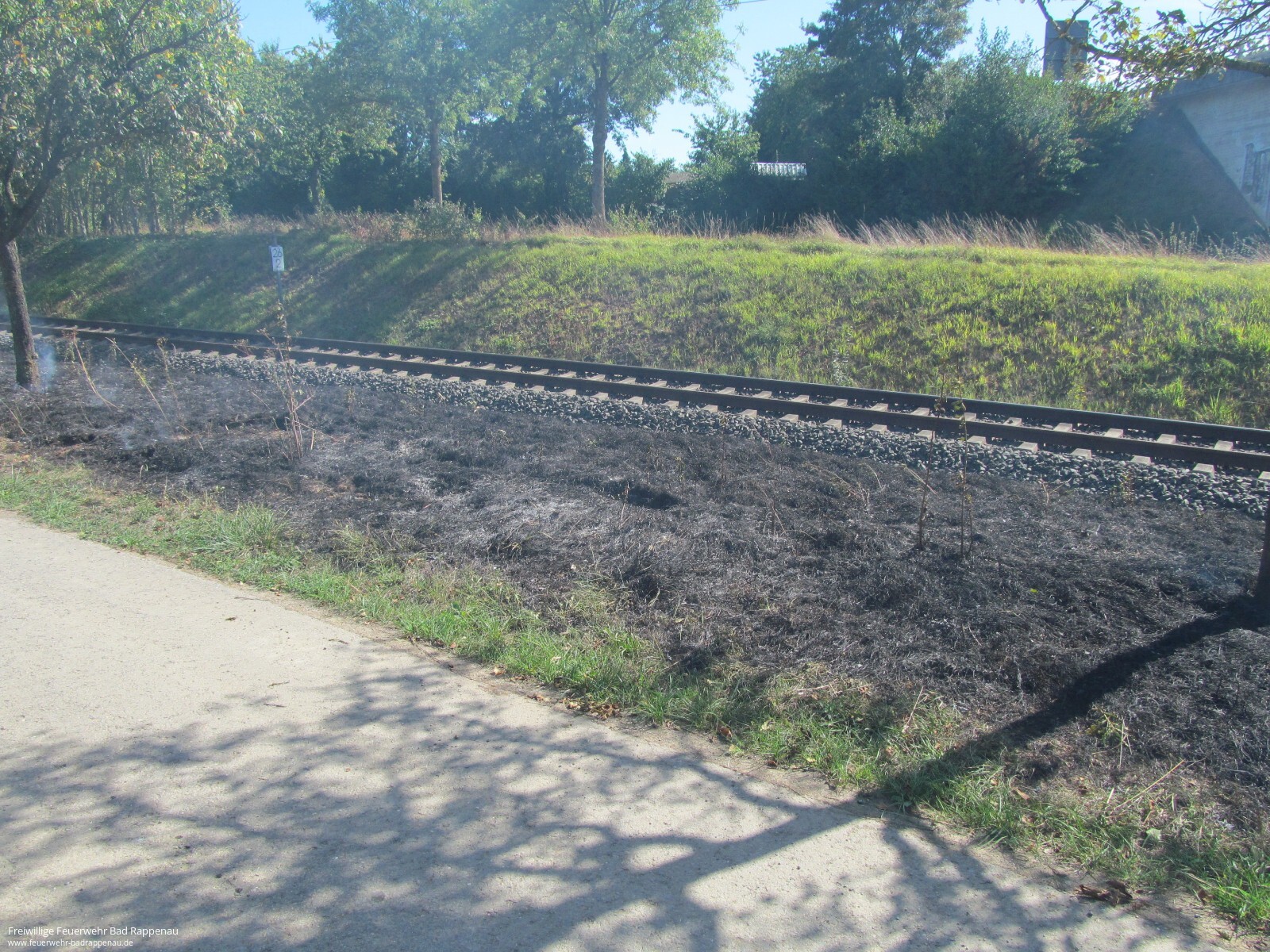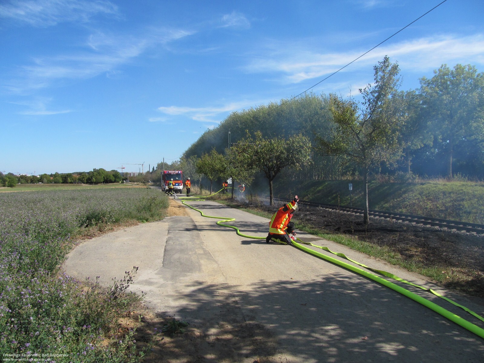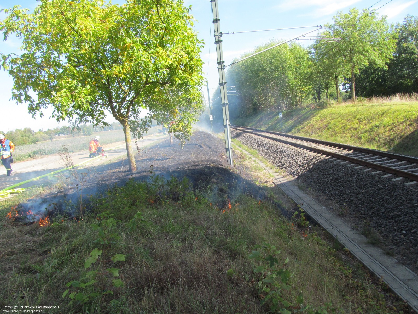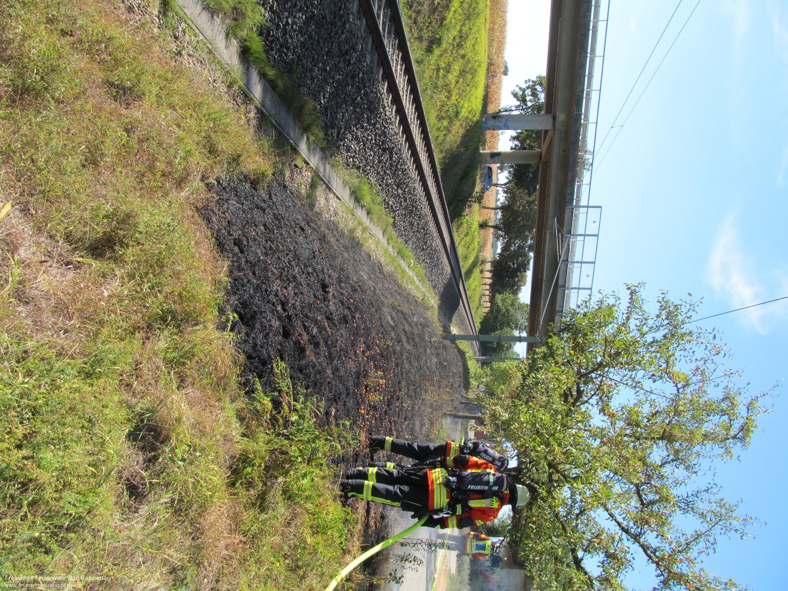 Mit dem Alarmstichwort „Flächenbrand“ wurde die Abteilung Bad Rappenau zu einem Böschungsbrand an den Bahngleisen zwischen Bad Rappenau und Babstadt alarmiert. Vor Ort brannten ca. 30m² Wiese. Der Brand konnte schnell mit einem Trupp unter Atemschutz mithilfe eines C-Hohlstrahlrohres abgelöscht werden. Kurzzeitig wurde der Bahnstreckenabschnitt gesperrt. Als Brandursache wird ein Kurzschluss an der Bahnanlage vermutet. Die Einsatzstelle wurde nachdem der Brand gelöscht war an die Bundespolizei übergeben. Die Freiwillige Feuerwehr Bad Rappenau war mit 12 Mann und 3 Fahrzeugen im Einsatz.