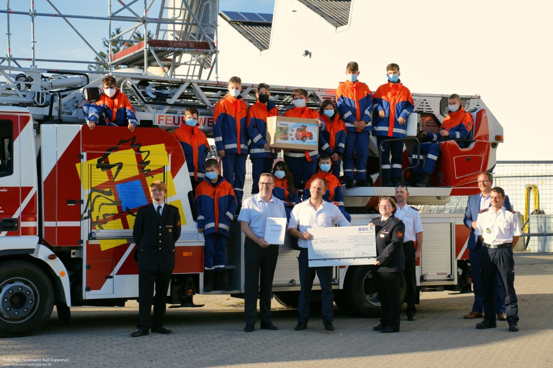 Vielleicht erinnert ihr euch noch an unsere Teilnahme am BGV Nachwuchshelden Förderwettbewerb. Die Jugendfeuerwehr Bad Rappenau hat bei diesem Wettbewerb einen Jury-Preis, in Höhe von 2.000€, gewonnen. Die Jury war prominent besetzt mit unter anderem Dr. Frank Knödler, Präsident Landesfeuerwehrverband Baden-Württemberg.Am Mittwoch, den 08.09.2021, konnte in Beisein von Oberbürgermeister Sebastian Frei, der Preis von zwei Vertretern des BGV, Stefan Schmidt und Thomas Gründemann, der Jugendfeuerwehrwartin Jasmin Müller während einer Jugendübung übergeben werden.Herr Oberbürgermeister Frei freute sich, dass die Jugendarbeit auch in Zeiten von Corona so gefördert wird. Das Preisgeld soll unter anderem zur Durchführung gemeinsamer Aktivitäten genutzt werden, die nun wieder in bestimmten Rahmen möglich sind.Wir freuen uns, dass wir nach so einer langen Corona bedingten Unterbrechung, aktuell wieder mit den Kindern der Jugendfeuerwehr üben können. Das Preisgeld wird komplett der Jugend zu Gute kommen und neben den oben genannten Aktivitäten dafür eingesetzt, das Ressort Modell weiter zu entwickeln.Nach dem Entgegennehmen des großen Schecks ging es für die Jugendlichen des Ressorts Mitte gleich weiter nach Heinsheim, um dort am Neckar mit dem LF20 der Abteilung Bad Rappenau und dem Feuerwehrboot der Abteilung Heinsheim, bei den sommerlichen Temperaturen, zu üben und im Team Spaß zu haben.