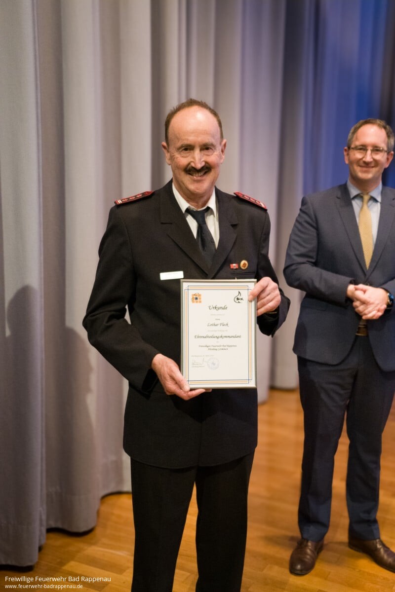Am 02.03. hatten Oberbürgermeister Sebastian Frei und Kommandant Felix Mann die Mitglieder der Freiwilligen Feuerwehr Bad Rappenau zur diesjährigen Jahreshauptversammlung in die Mühltalhalle nach Bad Rappenau eingeladen. Pünktlich um 18:30 Uhr konnte Oberbürgermeister Frei die Versammlung eröffnen und begrüßte neben den anwesenden Feuerwehrangehörigen auch alle Gäste, insbesondere die zahlreich vertretenen Mitglieder des Gemeinderates. In seiner Ansprache gab Oberbürgermeister Frei dann einen kurzen Überblick über die Geschehnisse rund um die Feuerwehr aus Sicht der Stadtverwaltung und einen Ausblick auf zukünftige Themen, insbesondere die erfreuliche Nachricht über den Grundstückserwerb für den Neubau in der Kernstadt. Der Dank der Stadtverwaltung und der Bürgerschaft an die Feuerwehr war Oberbürgermeister Frei aber ein ganz wesentliches Anliegen. Nicht nur für die gute Zusammenarbeit mit der Stadtverwaltung, sondern vor allem für die Bereitschaft, 365 Tage im Jahr „einsatzbereit“ zu sein. 2023 gab es die Rekordzahl von 206 Einsätzen.Es folgte der Bericht des Kommandanten, den sich Felix Mann mit seinen beiden Stellvertretern teilte. Dabei hatte Thomas Wachno im Bereich „Einsatzgeschehen 2023“ doch einige besondere Einsätze dabei – manches war auch zum Schmunzeln.Die scheidende Jugendfeuerwehrwartin Jasmin Müller berichtete über die Aktivitäten der Jugendfeuerwehr im Jahr 2023 – erfreulich die aktuelle Anzahl von über 100 Kindern und Jugendlichen, womit die Jugendfeuerwehr Bad Rappenau die größte im Landkreis ist. Mit der Übergabe des Staffelstabes an Patrick Söhner, der sich ebenfalls kurz vorstellte, war es dann auch „Aufforderung zum Tanz“, diese gute Arbeit fortzusetzen.Auch Altersobmann Helmut Schön konnte über diverse Aktivitäten der Altersabteilung berichten und einen Ausblick auf 2024 geben. Nachdem die Kassen der Gesamtwehr und der Jugendfeuerwehr vorgestellt wurden und die Kassierer Thorsten Böhm und Jana Tiedt nach den Berichten der jeweiligen Kassenprüfer entlastet wurden, folgten die Beförderungen und Ehrungen. Diese können im Einzelnen dem Jahresbericht entnommen werden.Hervorzuheben ist jedoch, dass drei Kameraden für 40 Jahre aktiven Feuerwehrdienst geehrt wurden, Kai Schuster (Abt. Babstadt) und Jochen Strehlow (Abt. Obergimpern) die Ehrennadel des Kreisfeuerwehrverbandes erhielten und Kerstin Böhm (Abt. Bad Rappenau) die Ehrennadel der Jugendfeuerwehr Baden-Württemberg in Silber durch den Kreisjugendwehrwart erhielt.Ein absolutes Highlight war dann allerdings die Ernennung von Lothar Fleck (Abt. Grombach) zum Ehrenabteilungskommandanten. Die Würde ist bis jetzt erst zwei anderen Honoratioren der Feuerwehr Bad Rappenau zuteilgeworden. Lothar Fleck war in den verschiedensten Funktionen und u.a. lange Jahre als Abteilungskommandant im Dienst und kann auf ein erfülltes Feuerwehrleben zurückblicken.Um 21:00 Uhr beendet Felix Mann dann den offiziellen Teil der Versammlung und es ging über zum gemütlichen Teil mit Essen (vielen Dank an die Vulpiusklinik) und Getränken. Die Abteilung Bad Rappenau, als diesjähriger Ausrichter der Jahreshauptversammlung, hatte sich viel Mühe mit dem Event gegeben und war mit vielen Köpfen und Händen am Werk. Vielen Dank auch dafür.