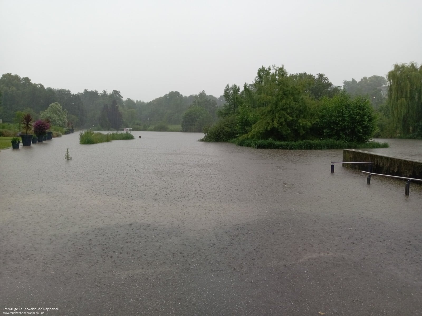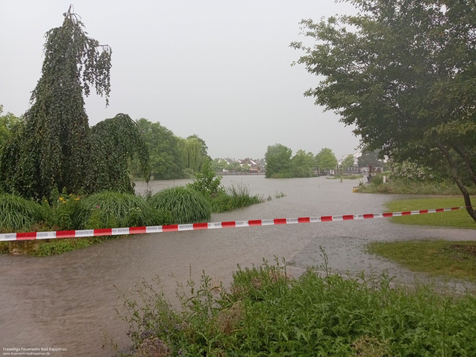 Nach einem Unwetter mit extremen Gewittern und Starkregen rückten wir zu insgesamt sieben Einsätzen aus. Wir kontrollierten verschiedene Gebiete und Ortschaften, befreiten Abflüsse von Ästen und entfernten abgebrochene Äste von der Fahrbahn. Im Kurpark trat der See über die Ufer und wir sperrten den Bereich weiträumig ab.