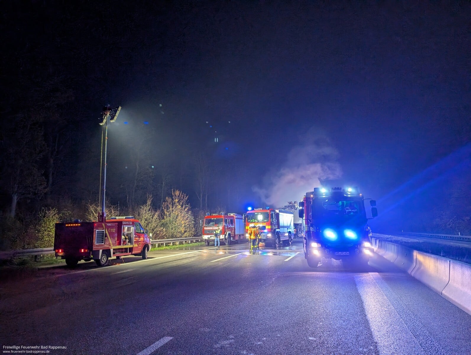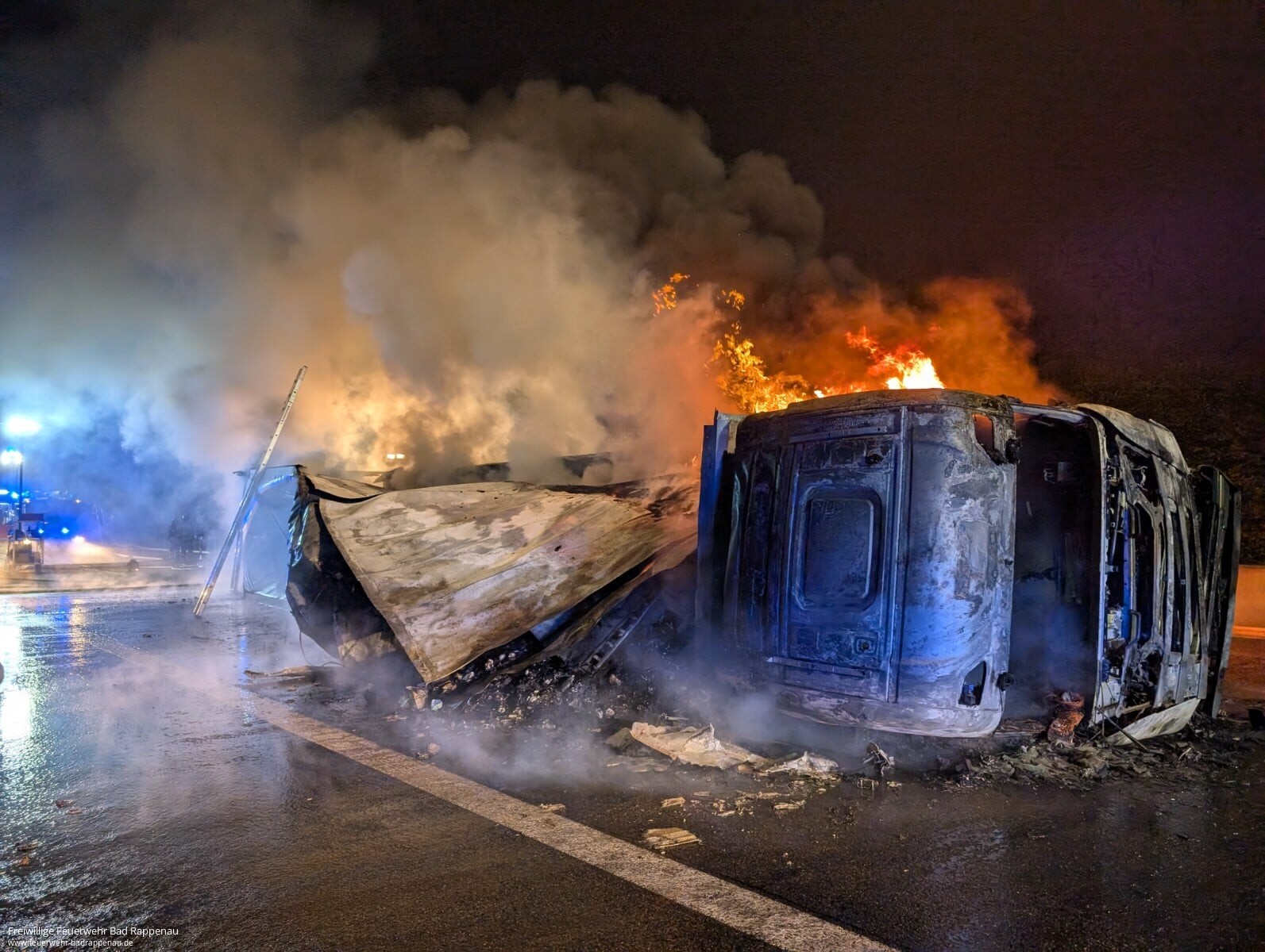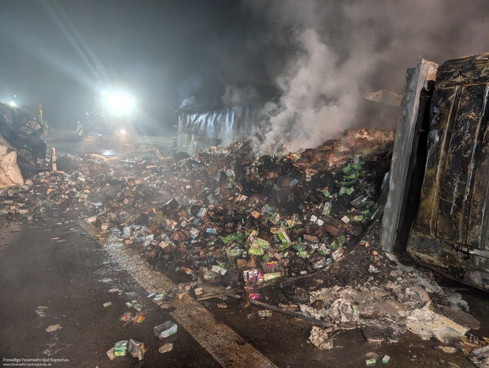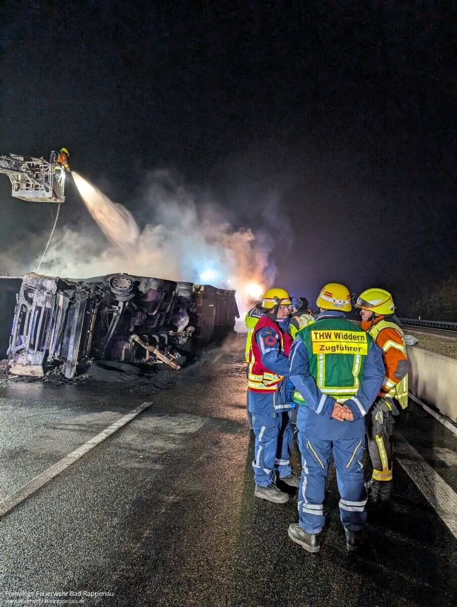 Zu einem LKW-Brand auf der BAB6 zwischen der Anschlussstelle Bad Rappenau und dem Parkplatz Bauernwald – Nord in Fahrtrichtung Mannheim wurden wir zusammen mit den Abteilungen Bad Rappenau sowie Bad Rappenau-Süd kurz nach Mitternacht alarmiert.Bereits auf der Anfahrt staute sich der Verkehr erheblich und eine schlecht gebildete Rettungsgasse erschwerte das Durchkommen zusätzlich. Nach Angaben der Polizei Heilbronn war ein Sattelzug nach einem Verkehrsunfall ins Schleudern geraten, umgekippt und in Brand geraten. Beim Eintreffen der ersten Einsatzkräfte stand der gesamte Lkw, geladen mit Süßwaren, bereits in Vollbrand, auch Dieselkraftstoff war bereits ausgelaufen und hatte mehrere Meter in Flammen gestanden. Glücklicherweise konnte sich der Fahrer selbst aus dem LKW befreien und wurde nur leicht verletzt.Aufgrund dieser Lage, d.h. der ausschließlichen Konzentration auf die Brandbekämpfung, entschied sich der Einsatzleiter zeitnah, die Feuerwehr Sinsheim zur Unterstützung – vor allem auch zur Sicherstellung einer ausreichenden Wasserversorgung – nachzualarmieren. Mit Unterstützung der Autobahnpolizei konnte die Autobahn aufgrund der starken Rauchentwicklung zeitnah in beide Fahrtrichtungen voll gesperrt werden, auch, dass nachrückende Einsatzkräfte die Einsatzstelle entgegen der Fahrtrichtung effektiv über die Autobahn von beiden Seiten erreichen konnten.Gemeinsam mit der Feuerwehr Sinsheim wurde ein Pendelverkehr nach Kirchardt eingerichtet, um ausreichend Löschwasser an die Einsatzstelle zu bringen. Auch die Drehleiter wurde eingesetzt, um Brandnester von oben schneller zu erkennen und gezielt abzulöschen.Im Zuge der Brandbekämpfung wurden zeitweise 4 C-Rohre eingesetzt.Im weiteren Einsatzverlauf wurde das Technische Hilfswerk aus Widdern sowie aus Heilbronn mit der Fachgruppe Räumen alarmiert. Durch die tatkräftige Unterstützung mit einem Bagger und einem Telelader konnte die Ladung des Sattelaufliegers auseinandergezogen und somit vollständig abgelöscht und abschließend mit Mulden abtransportiert werden.Insgesamt waren wir mit 9 Fahrzeugen und rund 50 Einsatzkräften bis kurz nach 9 Uhr im Einsatz. Die Feuerwehr Sinsheim war mit 5 Fahrzeugen, das THW und die Polizei mit mehreren Fahrzeugen, sowie mehrere Abschlepp- und Bergungsfahrzeuge als auch die ViA6West vor Ort.