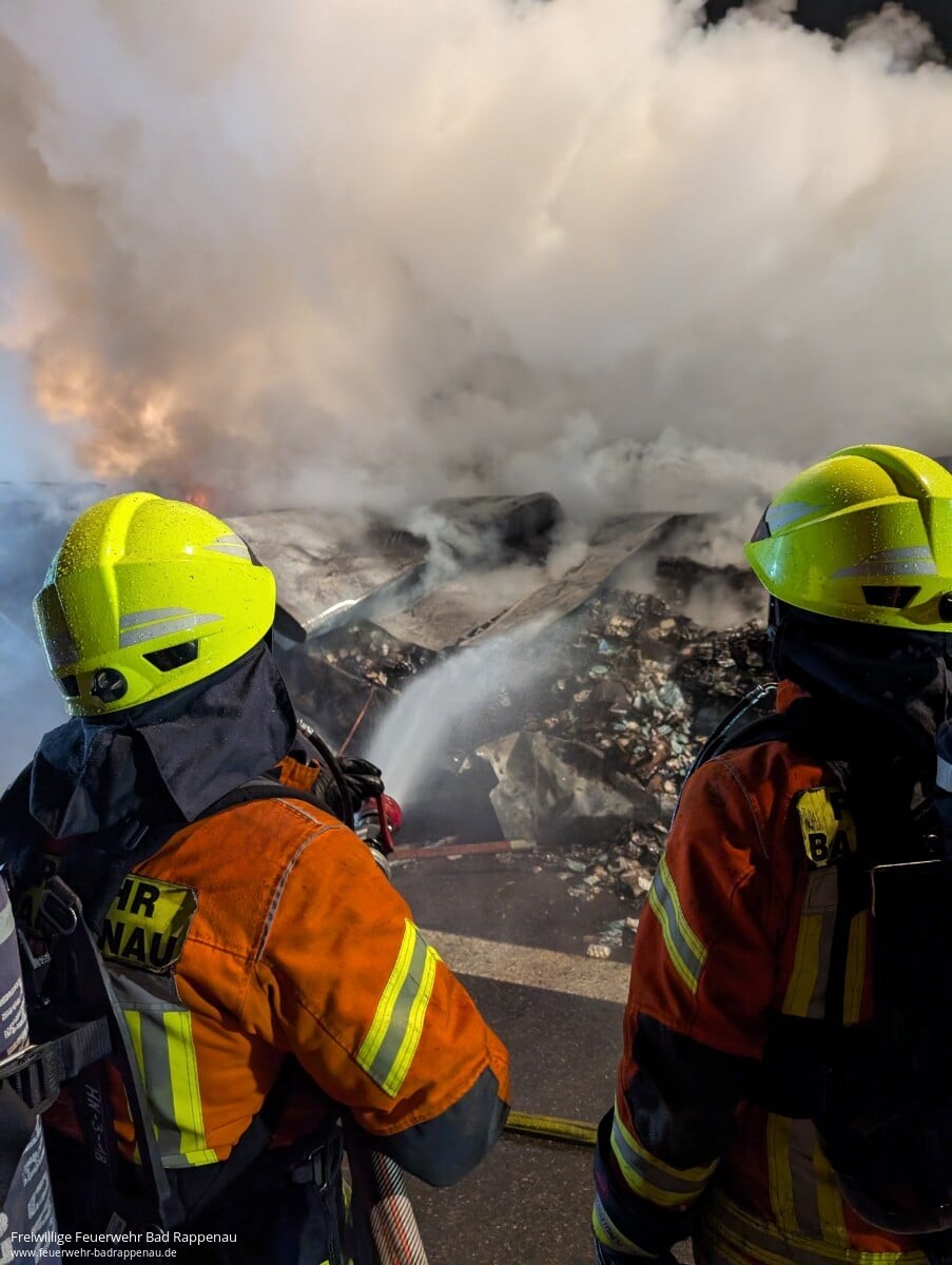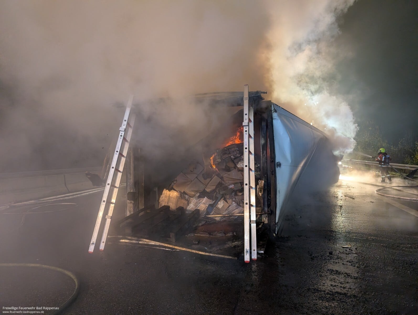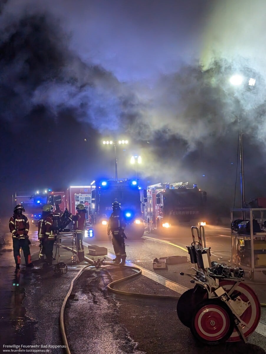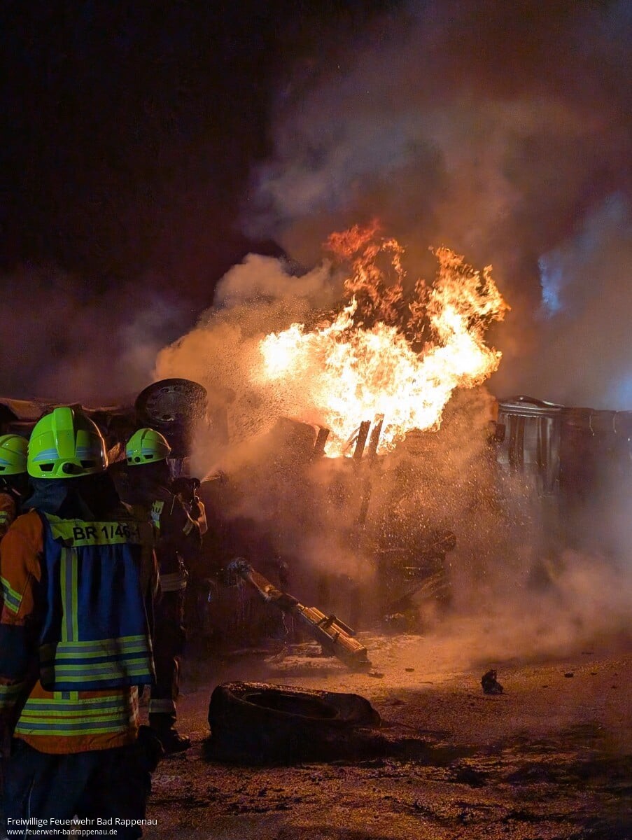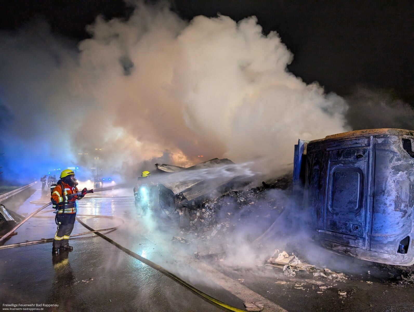 Zu einem LKW-Brand auf der BAB6 zwischen der Anschlussstelle Bad Rappenau und dem Parkplatz Bauernwald – Nord in Fahrtrichtung Mannheim wurden wir zusammen mit den Abteilungen Bad Rappenau sowie Bad Rappenau-Süd kurz nach Mitternacht alarmiert.Bereits auf der Anfahrt staute sich der Verkehr erheblich und eine schlecht gebildete Rettungsgasse erschwerte das Durchkommen zusätzlich. Nach Angaben der Polizei Heilbronn war ein Sattelzug nach einem Verkehrsunfall ins Schleudern geraten, umgekippt und in Brand geraten. Beim Eintreffen der ersten Einsatzkräfte stand der gesamte Lkw, geladen mit Süßwaren, bereits in Vollbrand, auch Dieselkraftstoff war bereits ausgelaufen und hatte mehrere Meter in Flammen gestanden. Glücklicherweise konnte sich der Fahrer selbst aus dem LKW befreien und wurde nur leicht verletzt.Aufgrund dieser Lage, d.h. der ausschließlichen Konzentration auf die Brandbekämpfung, entschied sich der Einsatzleiter zeitnah, die Feuerwehr Sinsheim zur Unterstützung – vor allem auch zur Sicherstellung einer ausreichenden Wasserversorgung – nachzualarmieren. Mit Unterstützung der Autobahnpolizei konnte die Autobahn aufgrund der starken Rauchentwicklung zeitnah in beide Fahrtrichtungen voll gesperrt werden, auch, dass nachrückende Einsatzkräfte die Einsatzstelle entgegen der Fahrtrichtung effektiv über die Autobahn von beiden Seiten erreichen konnten.Gemeinsam mit der Feuerwehr Sinsheim wurde ein Pendelverkehr nach Kirchardt eingerichtet, um ausreichend Löschwasser an die Einsatzstelle zu bringen. Auch die Drehleiter wurde eingesetzt, um Brandnester von oben schneller zu erkennen und gezielt abzulöschen.Im Zuge der Brandbekämpfung wurden zeitweise 4 C-Rohre eingesetzt.Im weiteren Einsatzverlauf wurde das Technische Hilfswerk aus Widdern sowie aus Heilbronn mit der Fachgruppe Räumen alarmiert. Durch die tatkräftige Unterstützung mit einem Bagger und einem Telelader konnte die Ladung des Sattelaufliegers auseinandergezogen und somit vollständig abgelöscht und abschließend mit Mulden abtransportiert werden.Insgesamt waren wir mit 9 Fahrzeugen und rund 50 Einsatzkräften bis kurz nach 9 Uhr im Einsatz. Die Feuerwehr Sinsheim war mit 5 Fahrzeugen, das THW und die Polizei mit mehreren Fahrzeugen, sowie mehrere Abschlepp- und Bergungsfahrzeuge als auch die ViA6West vor Ort.
