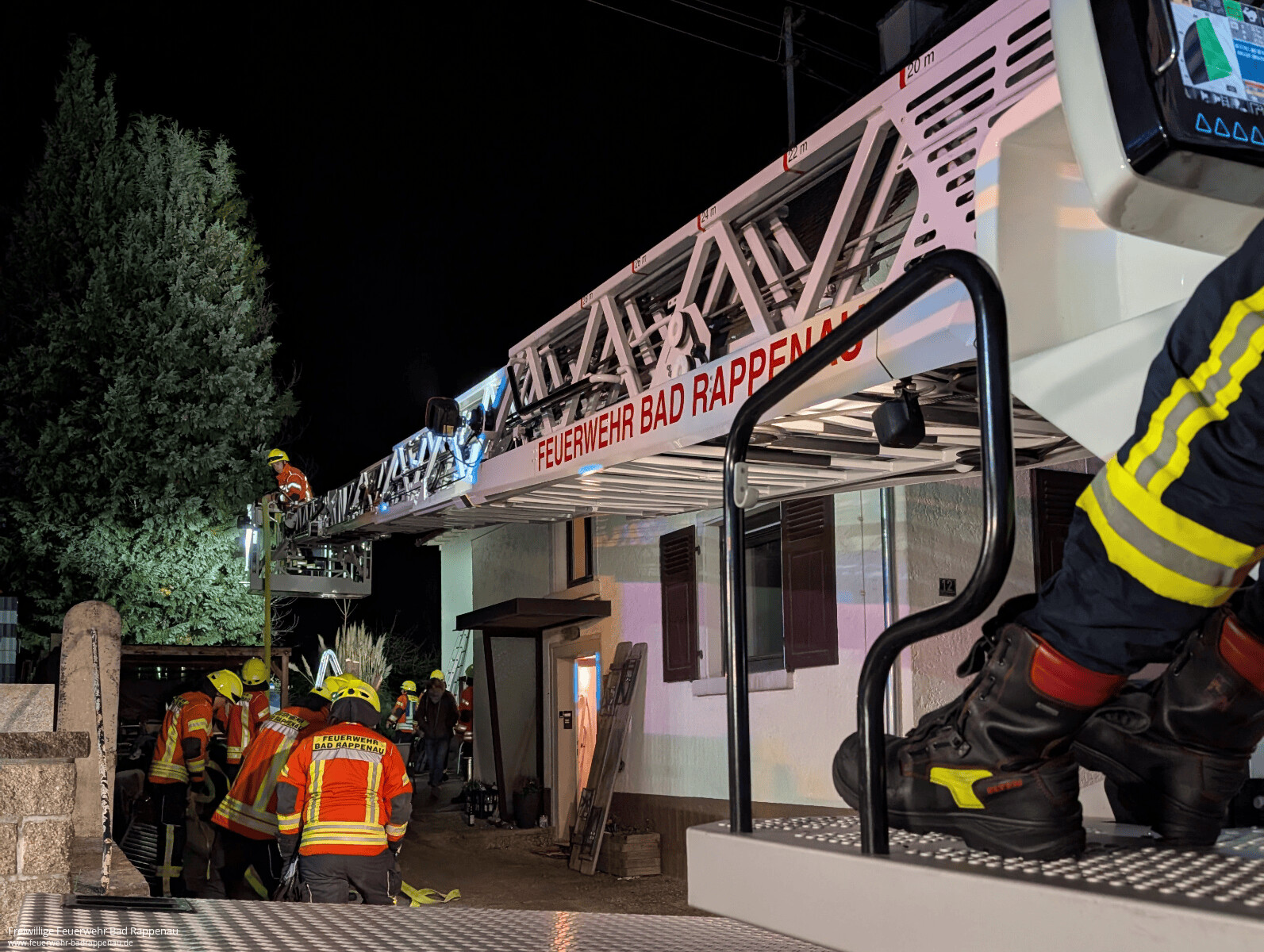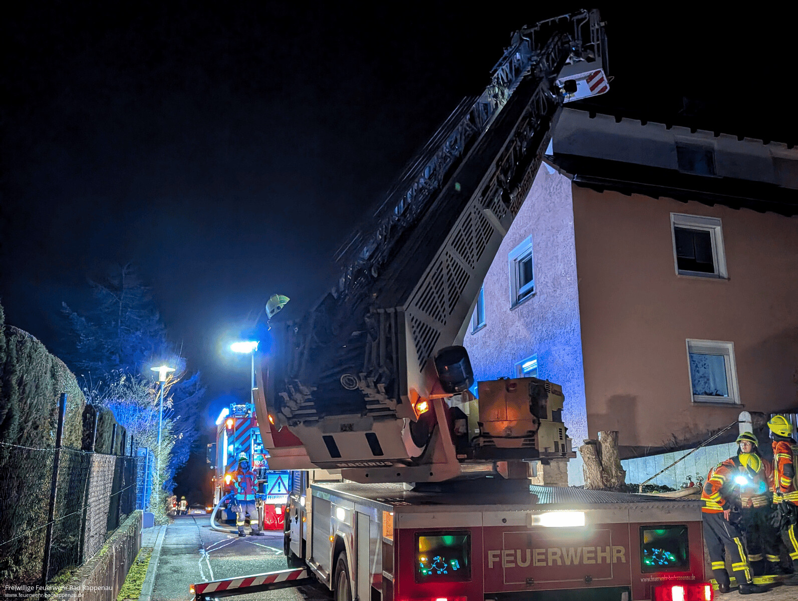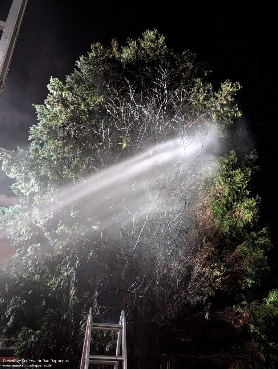 Mit dem Einsatzstichwort „Rauchentwicklung Wohngebäude“ wurde die Feuerwehr Bad Rappenau am frühen Samstagabend in die Bergstraße alarmiert. Bei Eintreffen der Einsatzkräfte hatten die Flammen bereits auf eine Tanne übergegriffen und drohten, sich auf das angrenzende Wohngebäude auszubreiten. Als Brandursache konnte eine in unmittelbarer Nähe betriebene Feuertonne identifiziert werden.Die Bewohner leiteten vor dem Eintreffen der Feuerwehr erste Löschmaßnahmen mit einem Gartenschlauch ein, wodurch die weitere Ausbreitung des Feuers eingedämmt werden konnte. Dabei erlitt eine Person jedoch leichte Verletzungen. Die starke Hitzeentwicklung hatte umliegende Gegenstände bereits erheblich beschädigt.Mithilfe der Drehleiter und einer Wärmebildkamera wurden der obere Bereich der Tanne sowie das Dach des Wohngebäudes kontrolliert und Glutnester gezielt abgelöscht.Wir waren mit 4 Fahrzeugen, der Rettungsdienst mit einem Rettungswagen und die Polizei mit einem Streifenwagen rund eine Stunde im Einsatz.Ein herzlicher Dank geht an den Taxifahrer, der sich spontan dazu bereiterklärte, Einsatzkräfte, die sich zum Zeitpunkt der Alarmierung in der Stadt aufhielten, schnell zum Feuerwehrhaus zu bringen. Dieses schnelle Handeln war eine große Unterstützung und hat gezeigt, wie wertvoll Zusammenhalt in solchen Momenten ist.