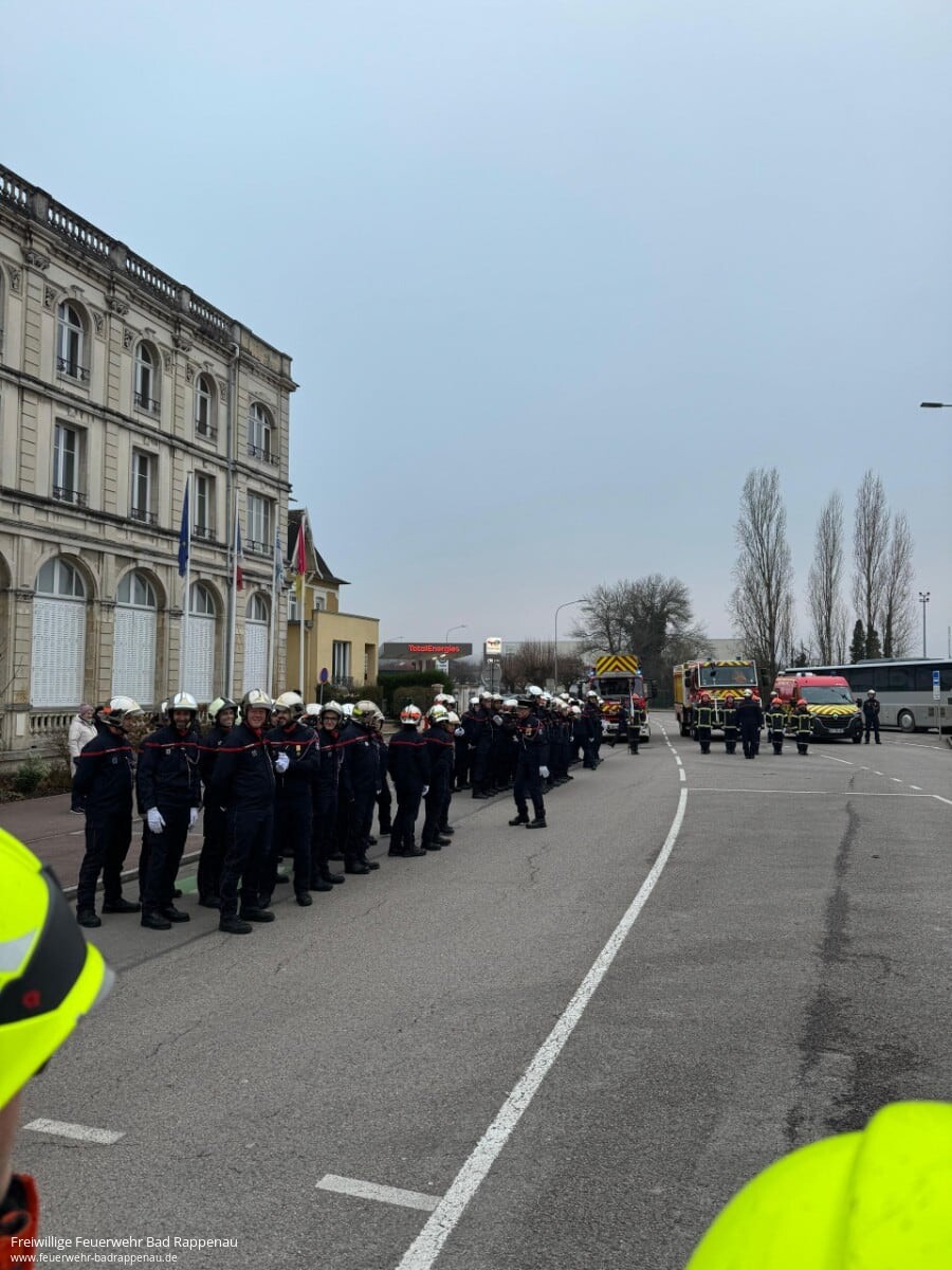 Auch dieses Jahr fuhren wir, Carlos Rath, Christopher Henkel, Harald Scholz, Sarah Hofmann und Valentin Wolesak aus den Abteilungen Bad Rappenau und Wollenberg der FF Bad Rappenau, nach Frankreich, um am „Sainte Barbe“-Tag teilzunehmen. An diesem Tag, der jährlich am letzten Samstag im November stattfindet, wird die Heilige Barbara als Schutzpatronin der Feuerwehr geehrt.Zu diesem Anlass besuchen wir traditionell über das Wochenende die Feuerwehr unserer Partnerstadt Contrexéville. Am Freitagabend wurden wir von den Sapeurs Pompiers – so heißen die Feuerwehrleute in Frankreich – herzlich empfangen und verbrachten einen geselligen Abend mit spannenden Gesprächen. Trotz Sprachbarrieren fanden wir immer Möglichkeiten, uns zu verständigen.In Frankreich ist der Rettungsdienst Teil der Feuerwehr, weshalb dort auch Rettungswagen stationiert sind. Die Struktur der Freiwilligen Feuerwehr unterscheidet sich zudem von der in Deutschland: Freiwillige haben feste Dienstschichten von einer Woche und müssen sich während dieser Zeit in der Nähe der Wache aufhalten. Dadurch verkürzt sich die Ausrückzeit, und das Einsatzgebiet ist größer.Die Feuerwehr Contrexéville besteht aus Mitgliedern der Städte Contrexéville und Vittel. Am Samstag stießen auch vier Kameraden der Feuerwehr Badenweiler dazu. Nach einer sportlichen Einheit im angrenzenden Wald frühstückten wir traditionell französisch, besichtigten Contrexéville und bummelten durch den Supermarkt. Gegen 14.30 Uhr bereiteten wir uns auf die Parade vor.Nach einem Gottesdienst für die Feuerwehr marschierten alle in Formation, begleitet von einer Musikkapelle, durch die Fußgängerzone Vittels zum Rathaus. Dort wurde die festliche Parade gefeiert, bei der Sapeurs Pompiers geehrt und befördert wurden. Am Abend folgte ein ausgelassenes Fest in der Stadthalle.Der Sonntag war entspannter: Wir genossen das warme Wasser der Therme in Vittel und trafen uns anschließend zum gemeinsamen Mittagessen mit der Kommandantin Julie, bevor wir die Heimreise antraten.Ein besonderer Dank geht an Laurent und Nathalie, die alles hervorragend für uns organisiert haben, sowie an die gesamte Feuerwehr von Contrexéville und Vittel für das unvergessliche Wochenende. Wir freuen uns darauf, unsere französischen Kameraden im Mai bei uns in Bad Rappenau willkommen zu heißen!Bild 1: Unsere Gruppe zu BesuchBild 2: Das FeuerwehrhausBild 3: Die EhrungBild 4: Gemeinsamer Marsch